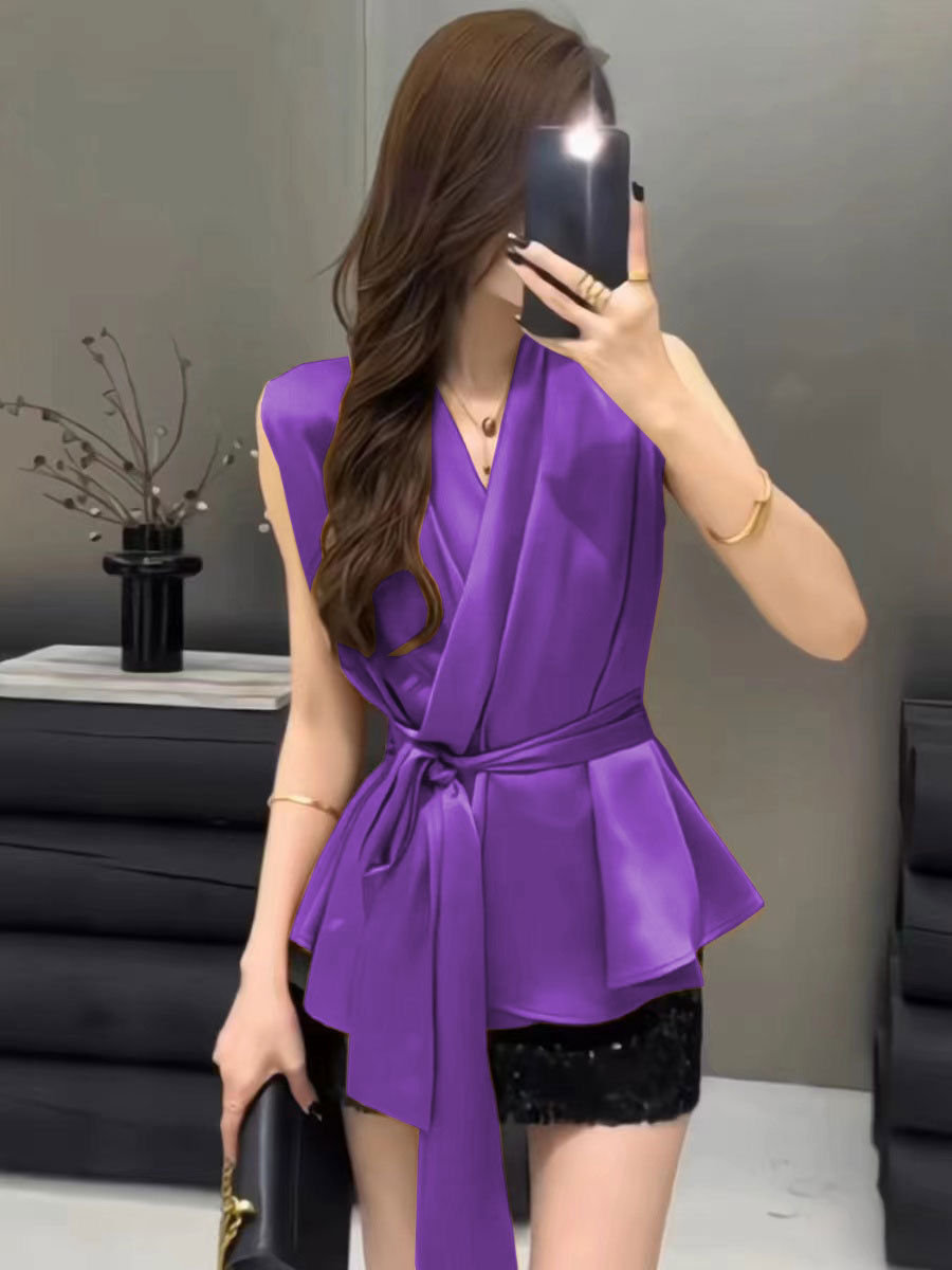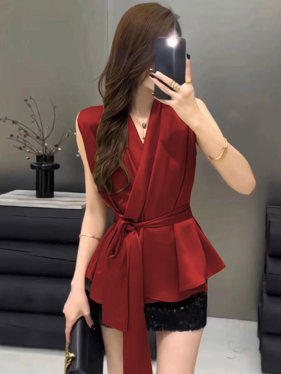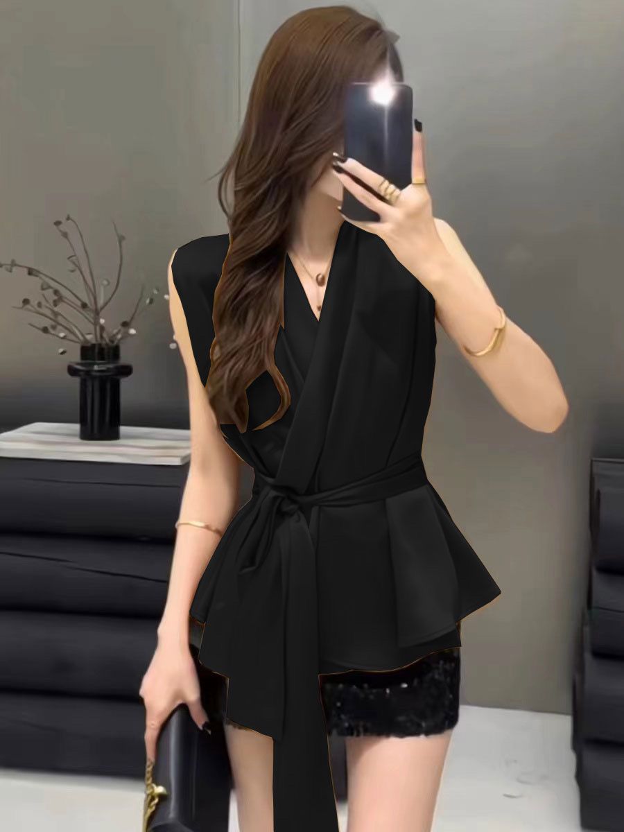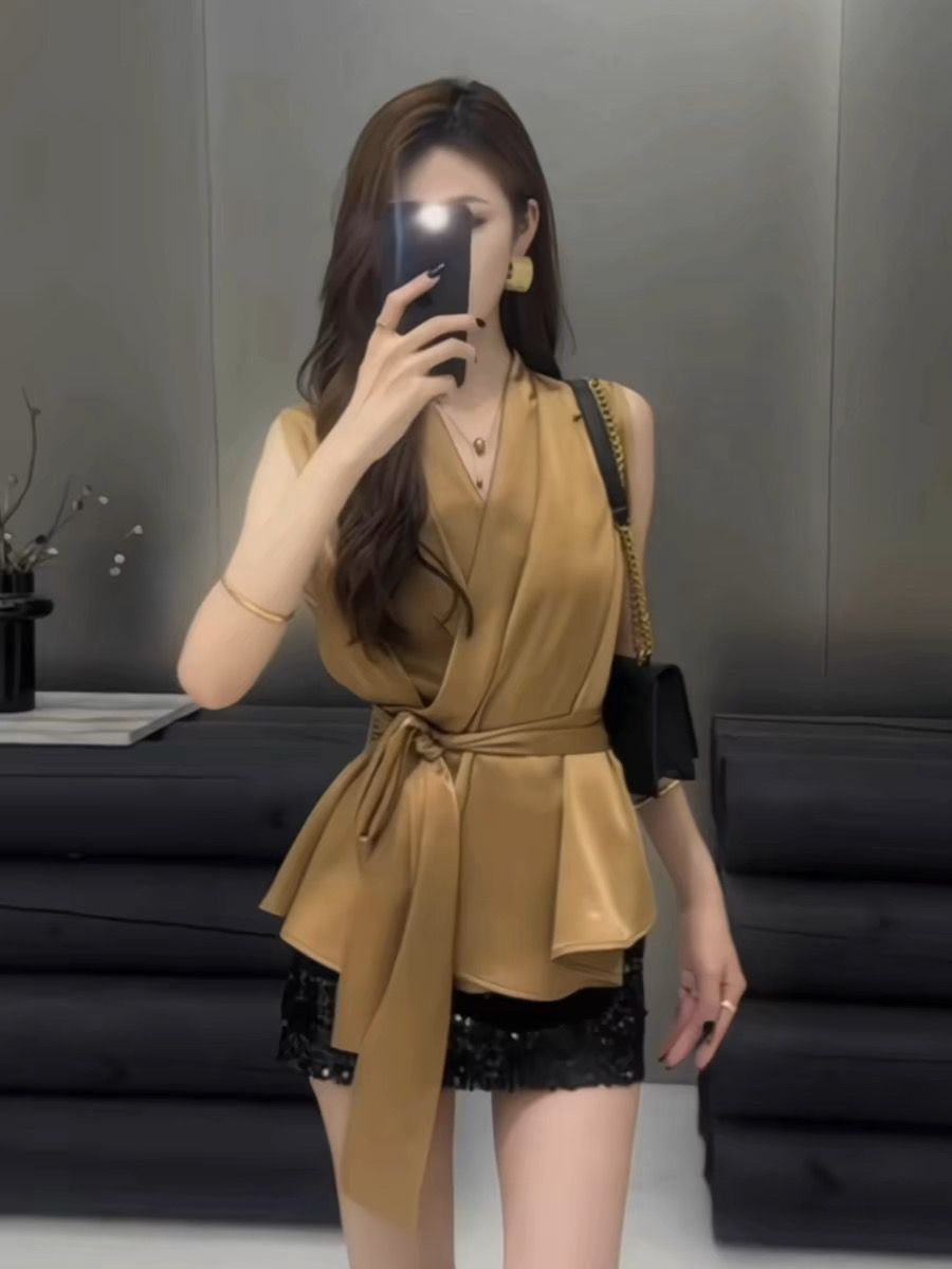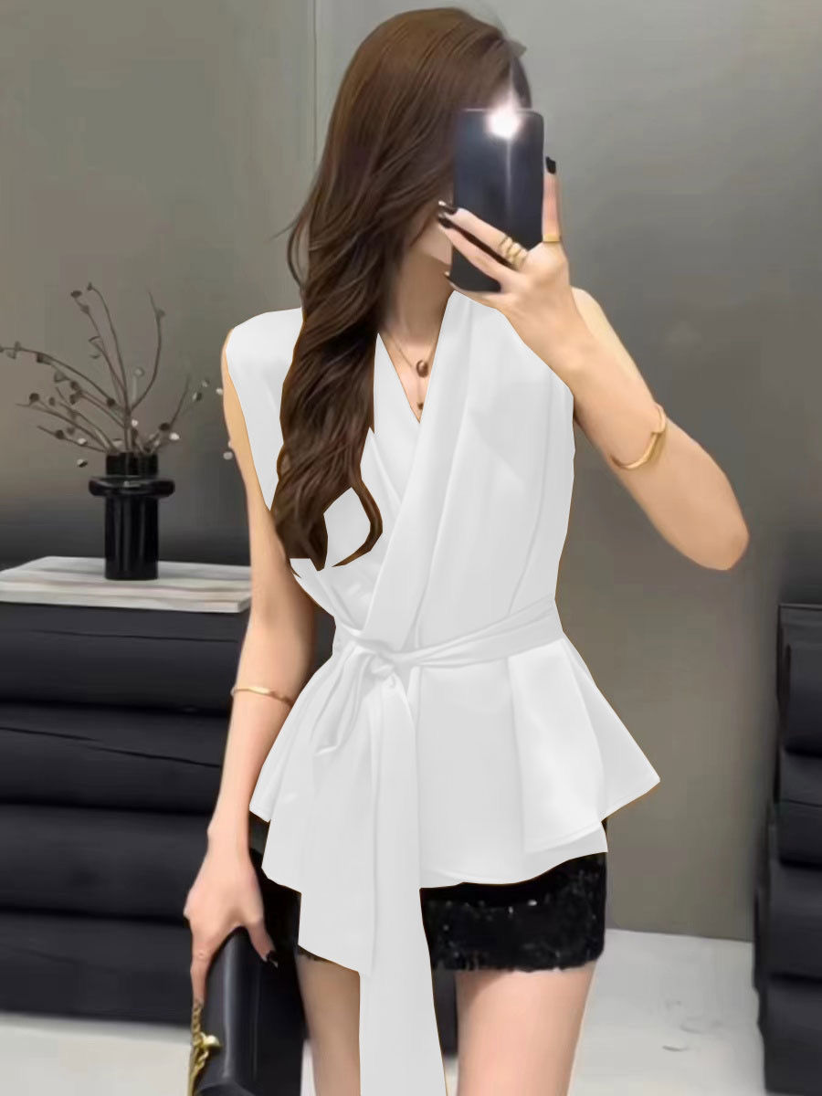 디자인 센스 V 넥 스트랩 허리 민소매 셔츠 여성의 여름 2025 새로운 슬림 핏 슬리밍 우아한 올 매치 탑스토어 가기