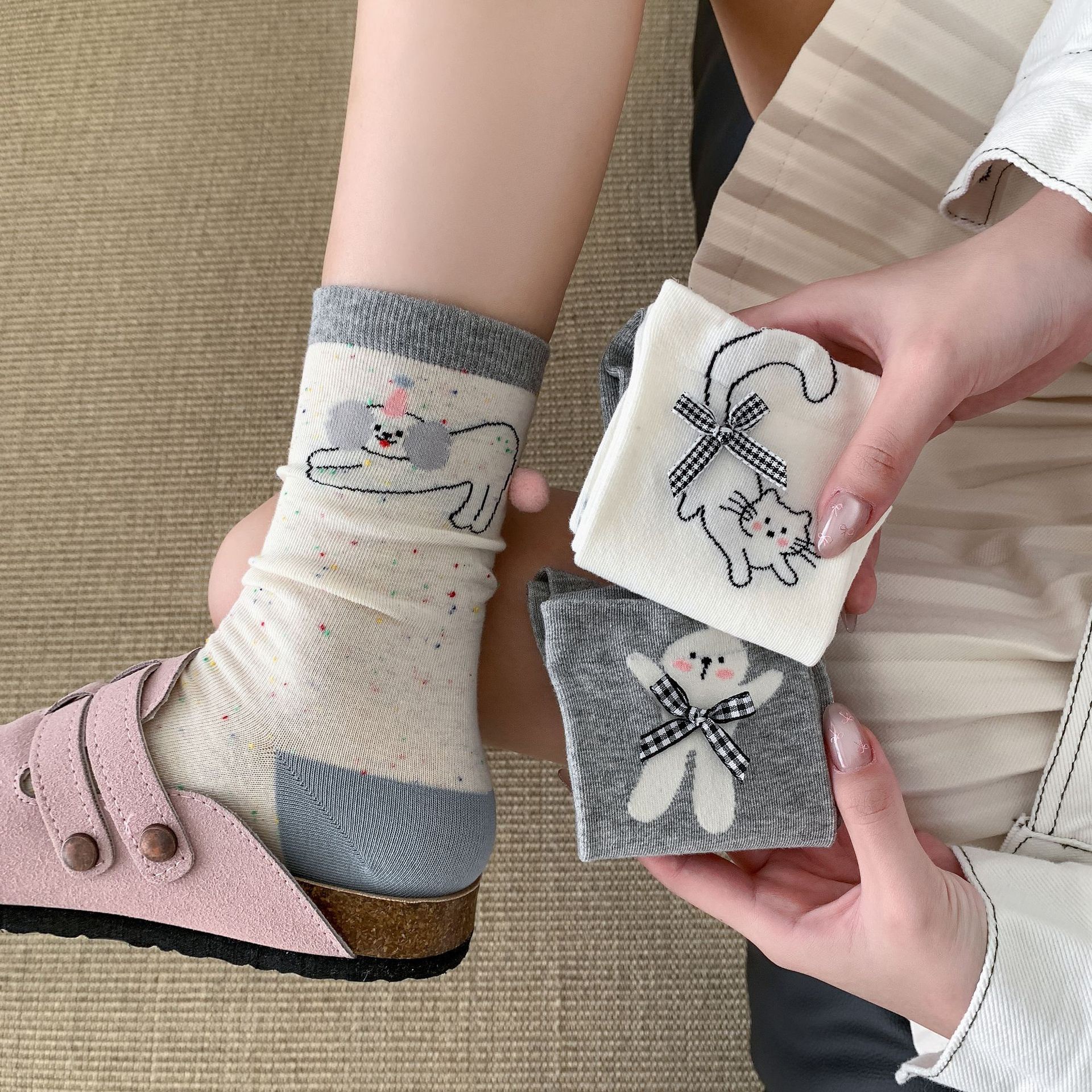양말 여성 봄과 여름 입체 꼬리 헤어 볼 뼈없는 중간 튜브 양말 만화 동물 활 고양이와 강아지면 양말