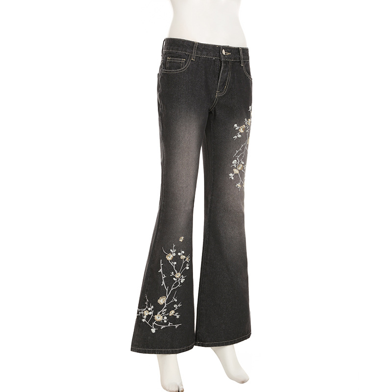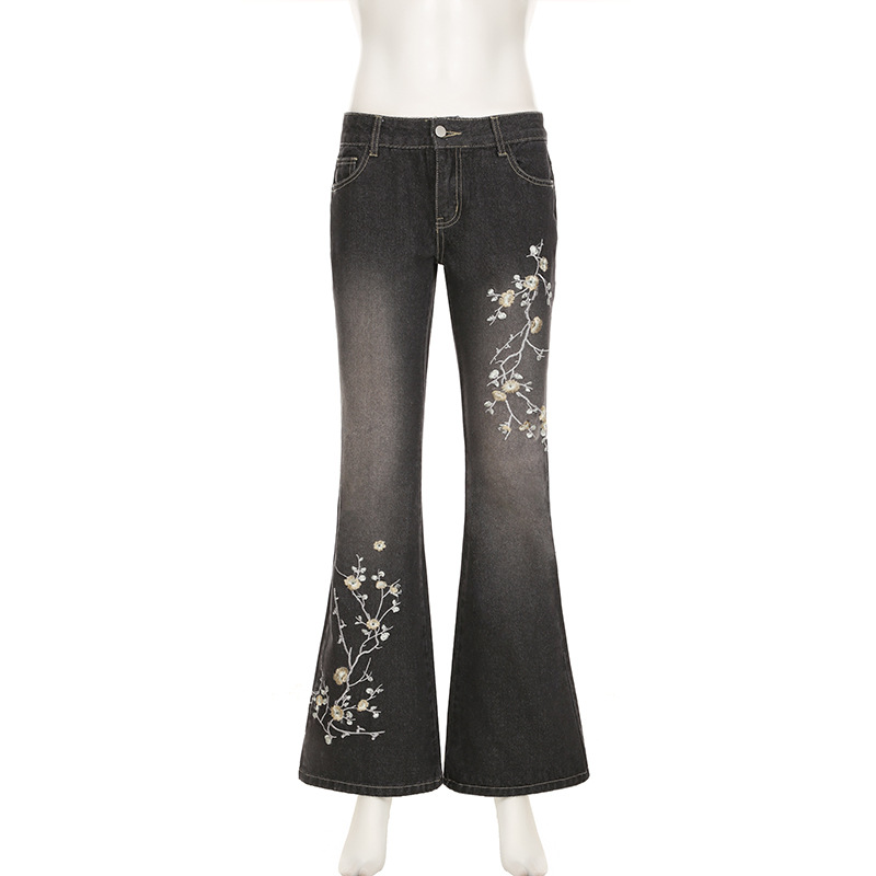 여성용 아메리칸 레트로 청바지, 하이 스트리트 핫걸, 슬림핏, 마이크로 플레어 팬츠, 식물 자수 로우 웨이스트 팬츠 디자인