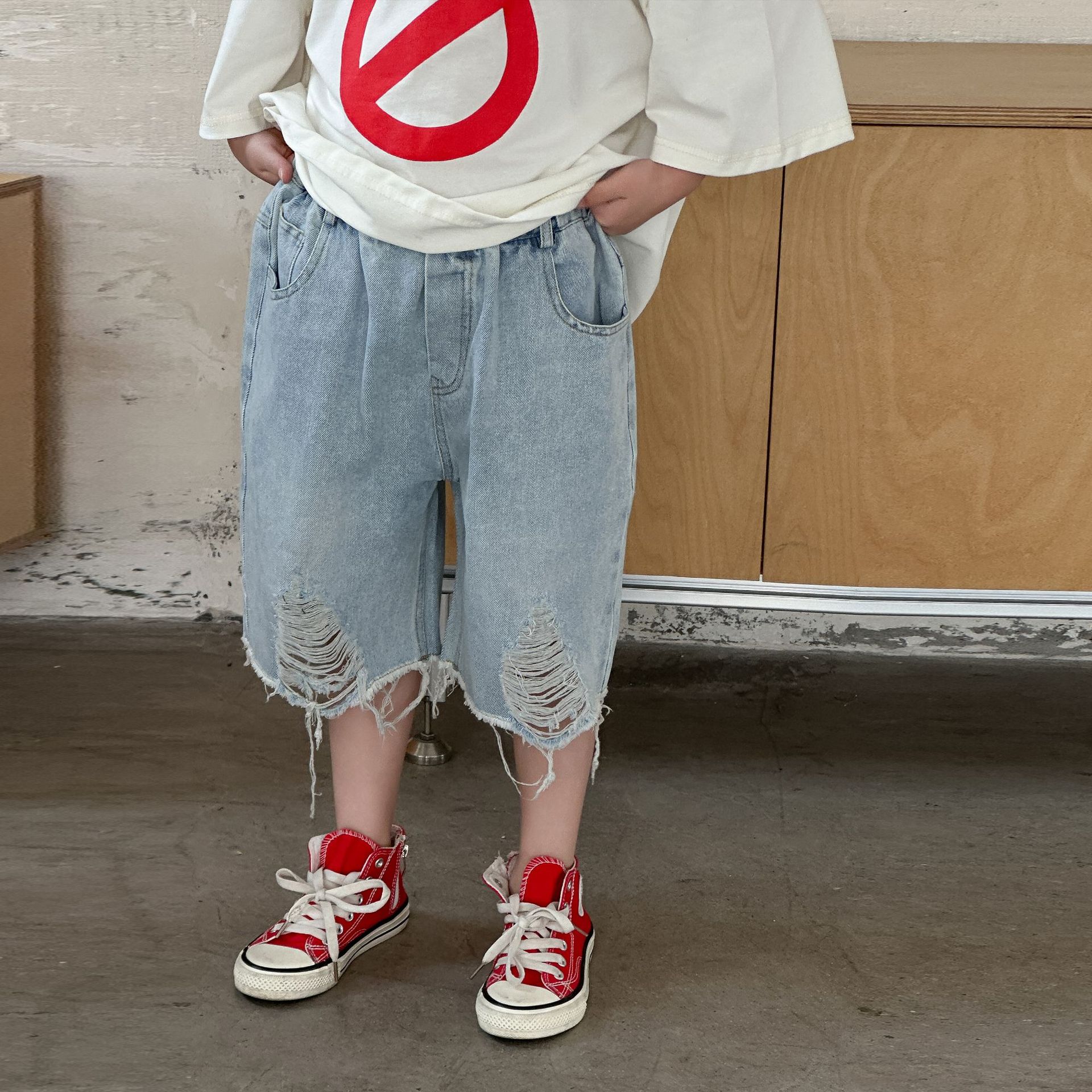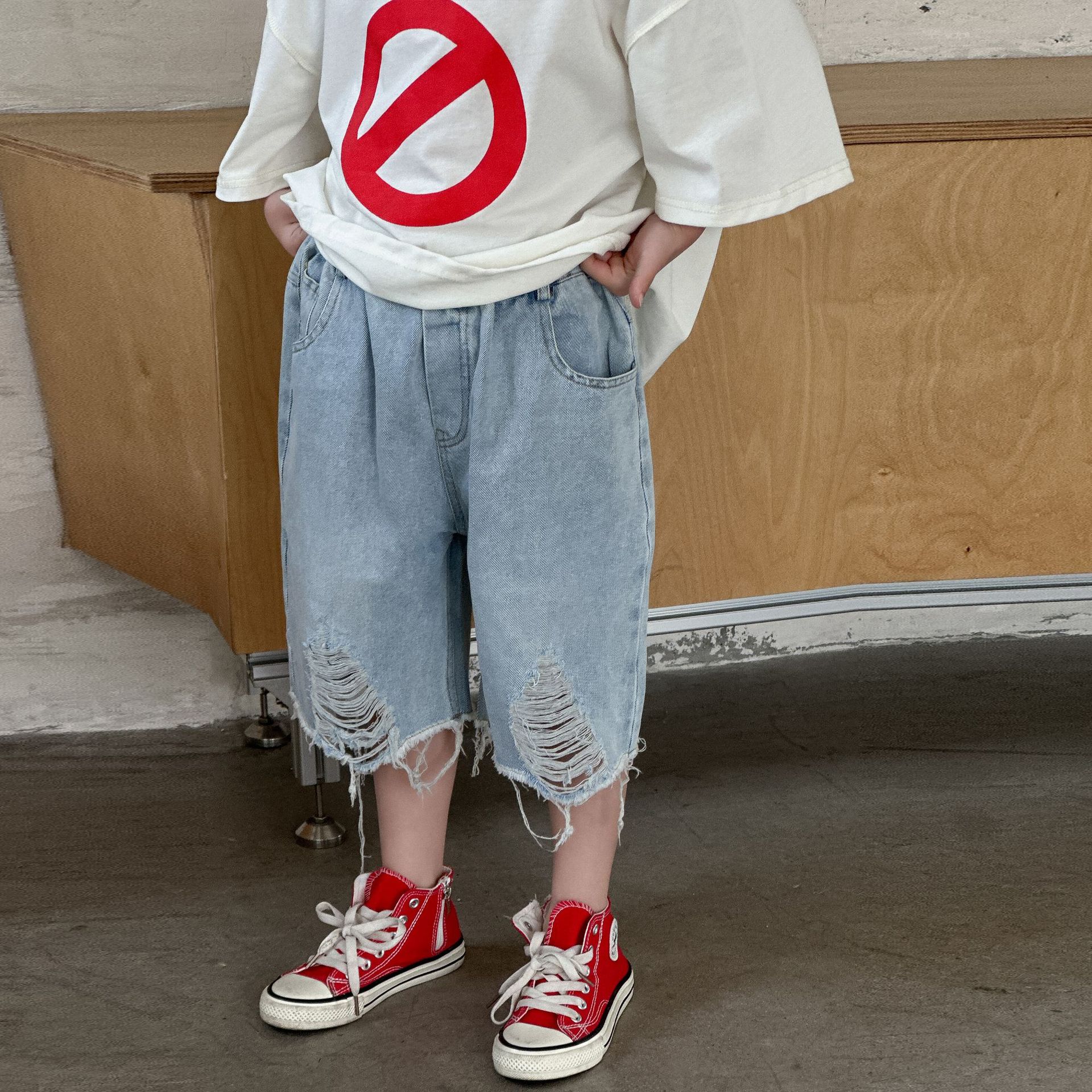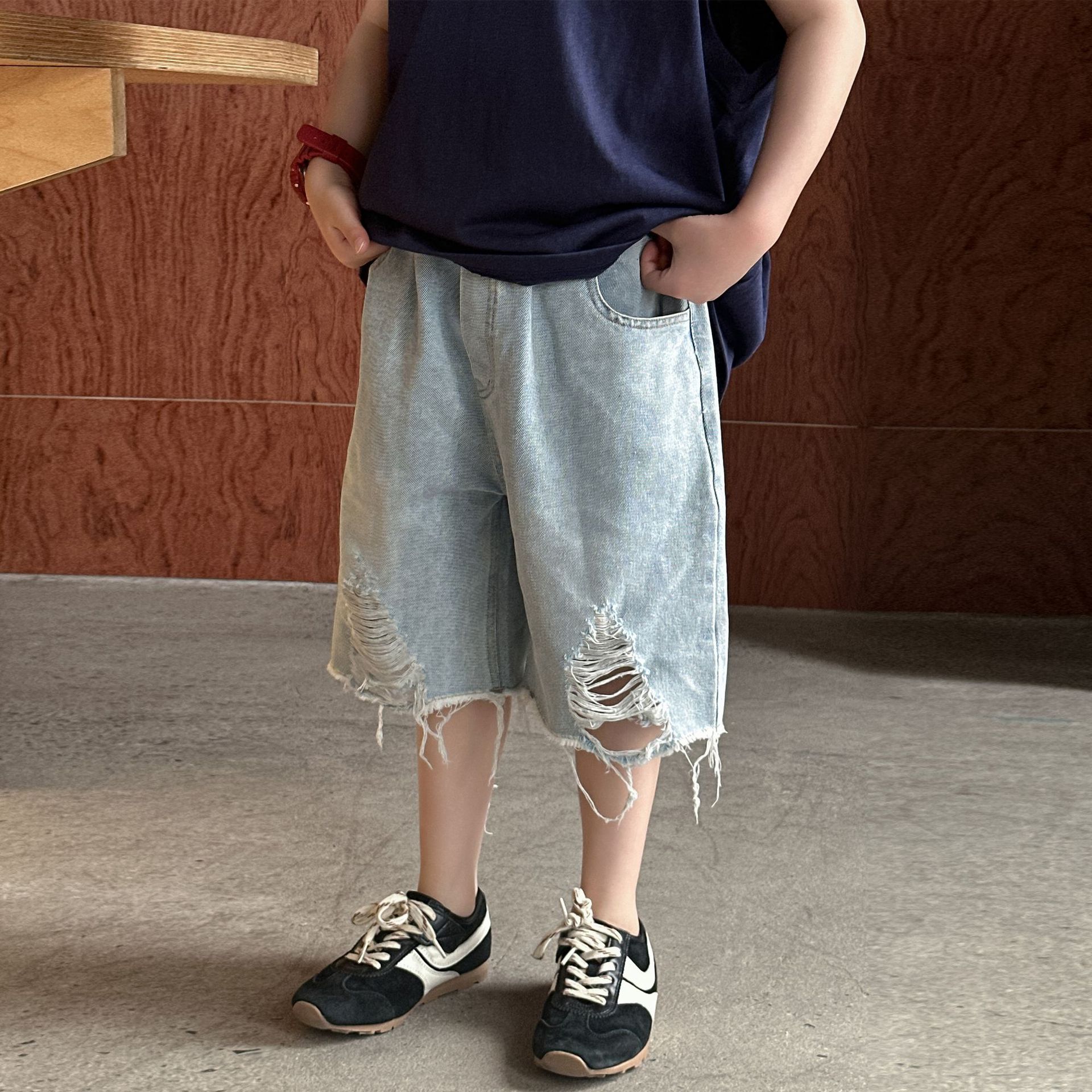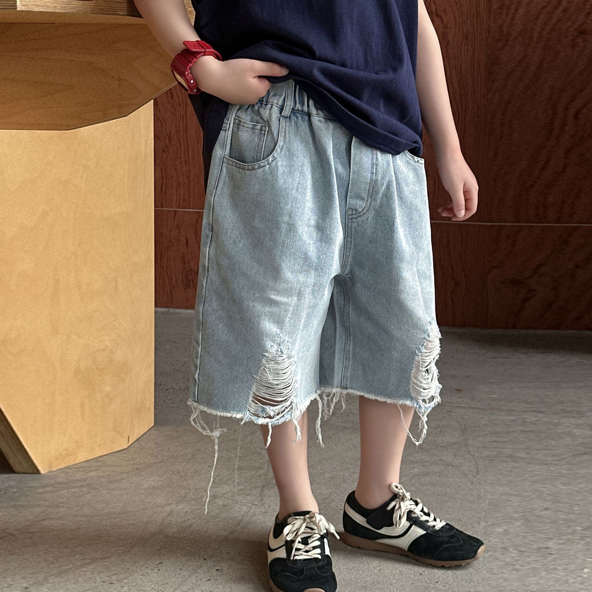 남학생 여름 반바지 2025 여름 찢어진 청바지 어린이 중간 바지 느슨한 미국식 소년의 세련된 멋진 바지스토어 가기
