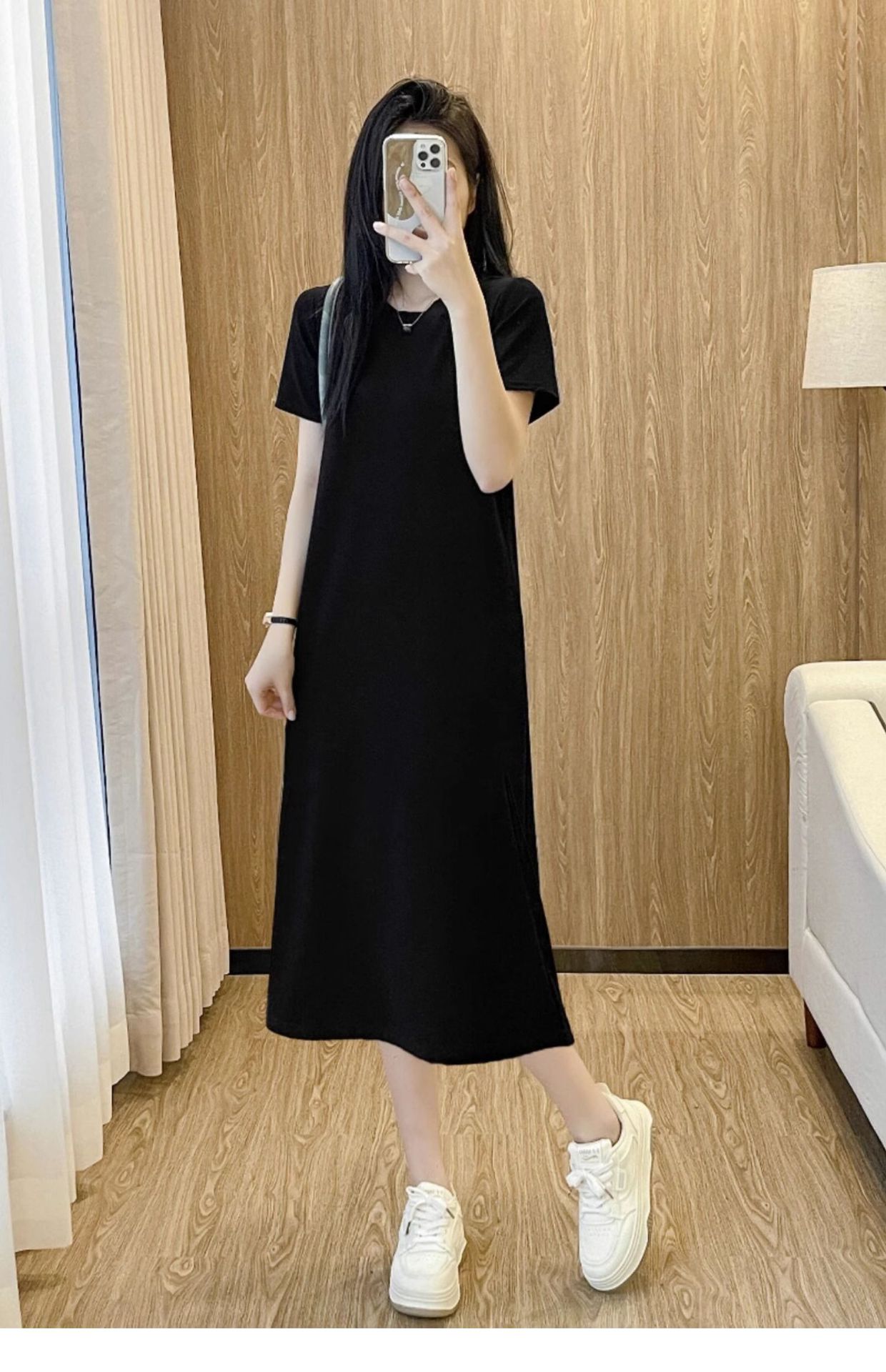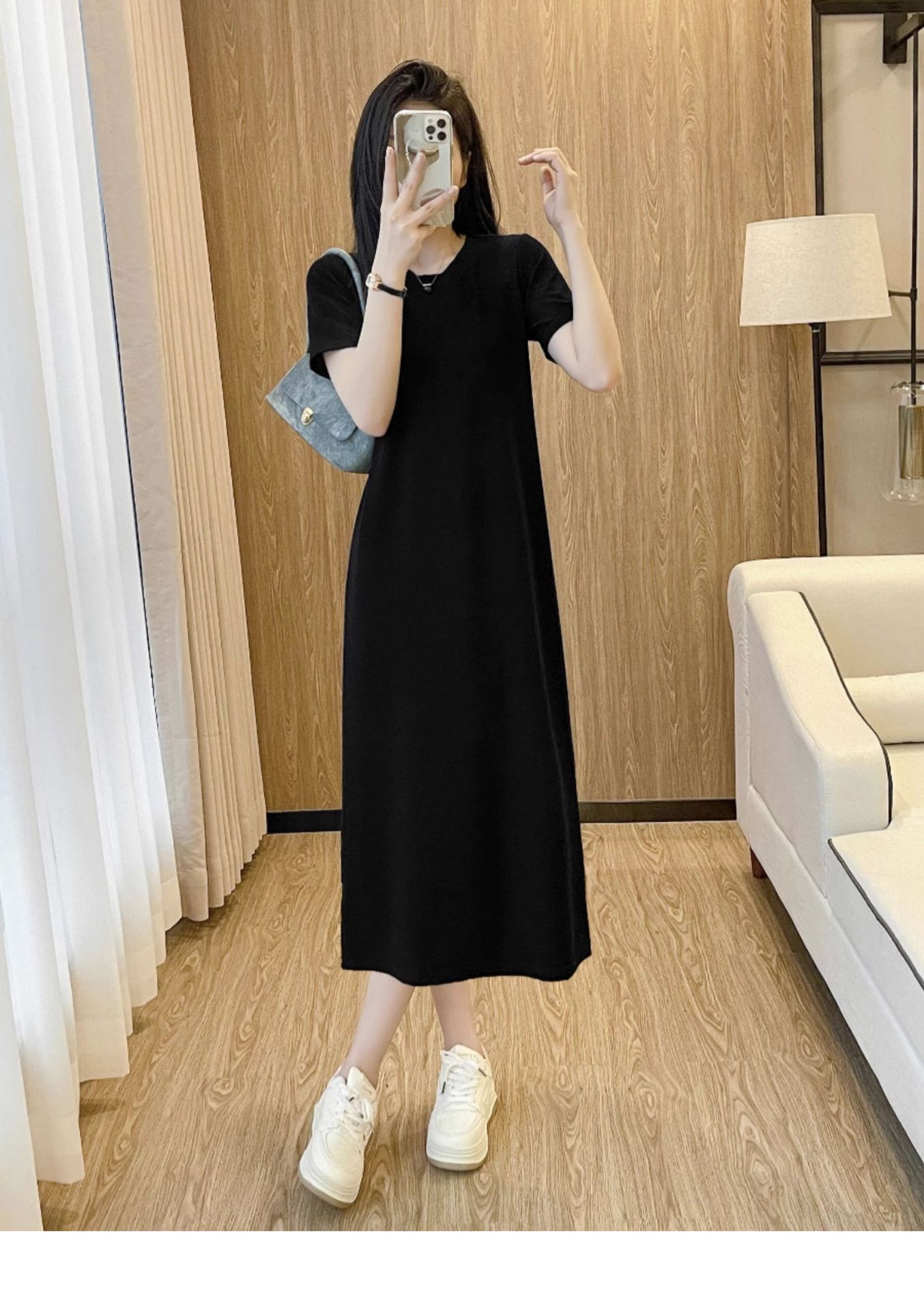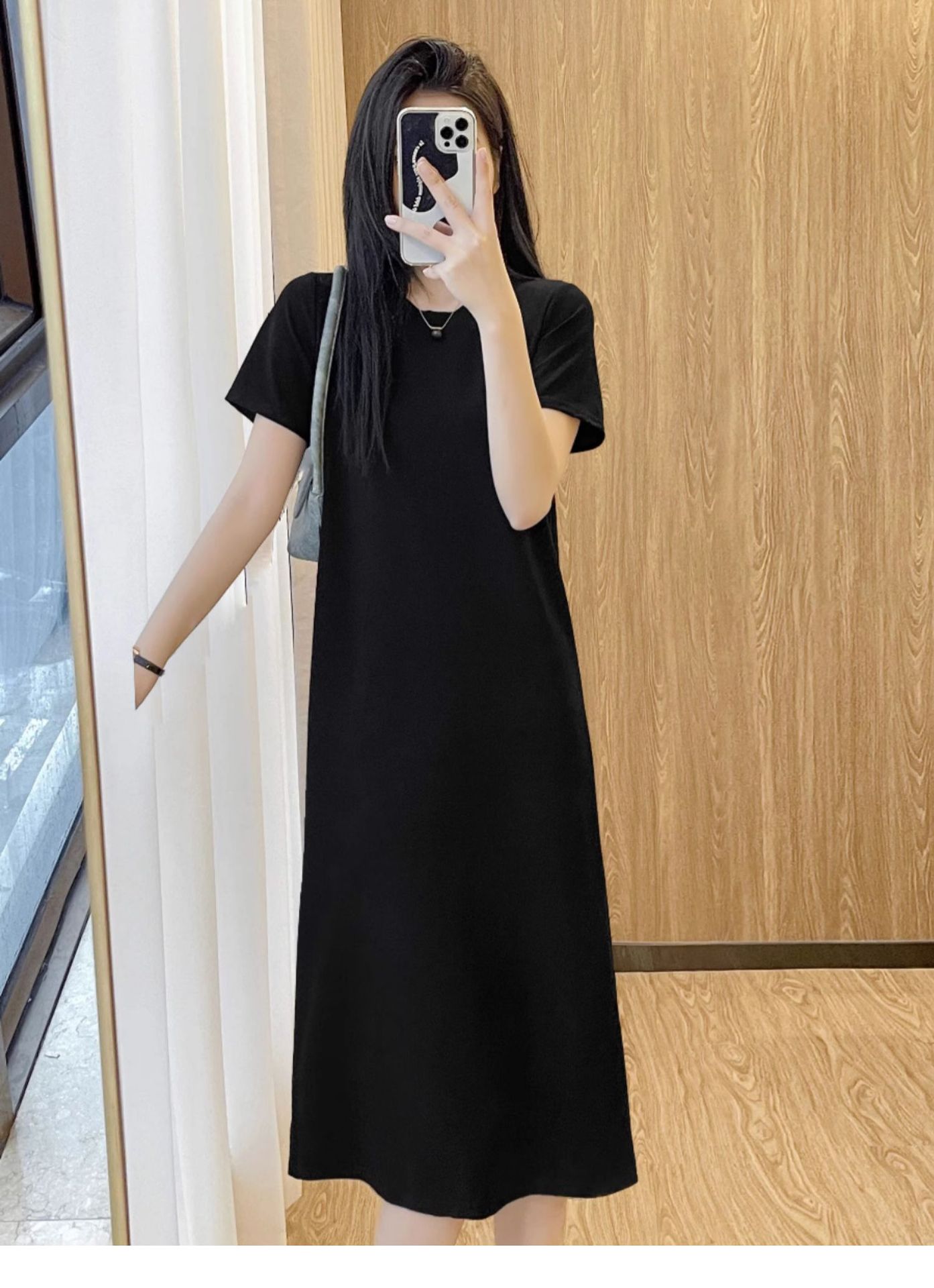 여름 반팔 크루 넥 티셔츠 긴 스커트 슬리밍 느슨한 외신베이스 헵번 스타일 블랙 원피스 여성스토어 가기