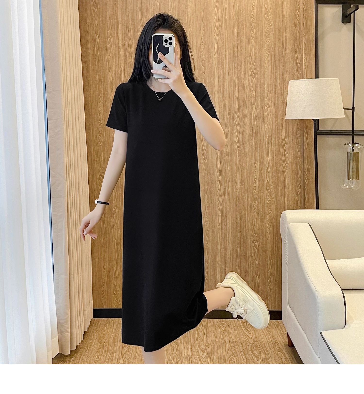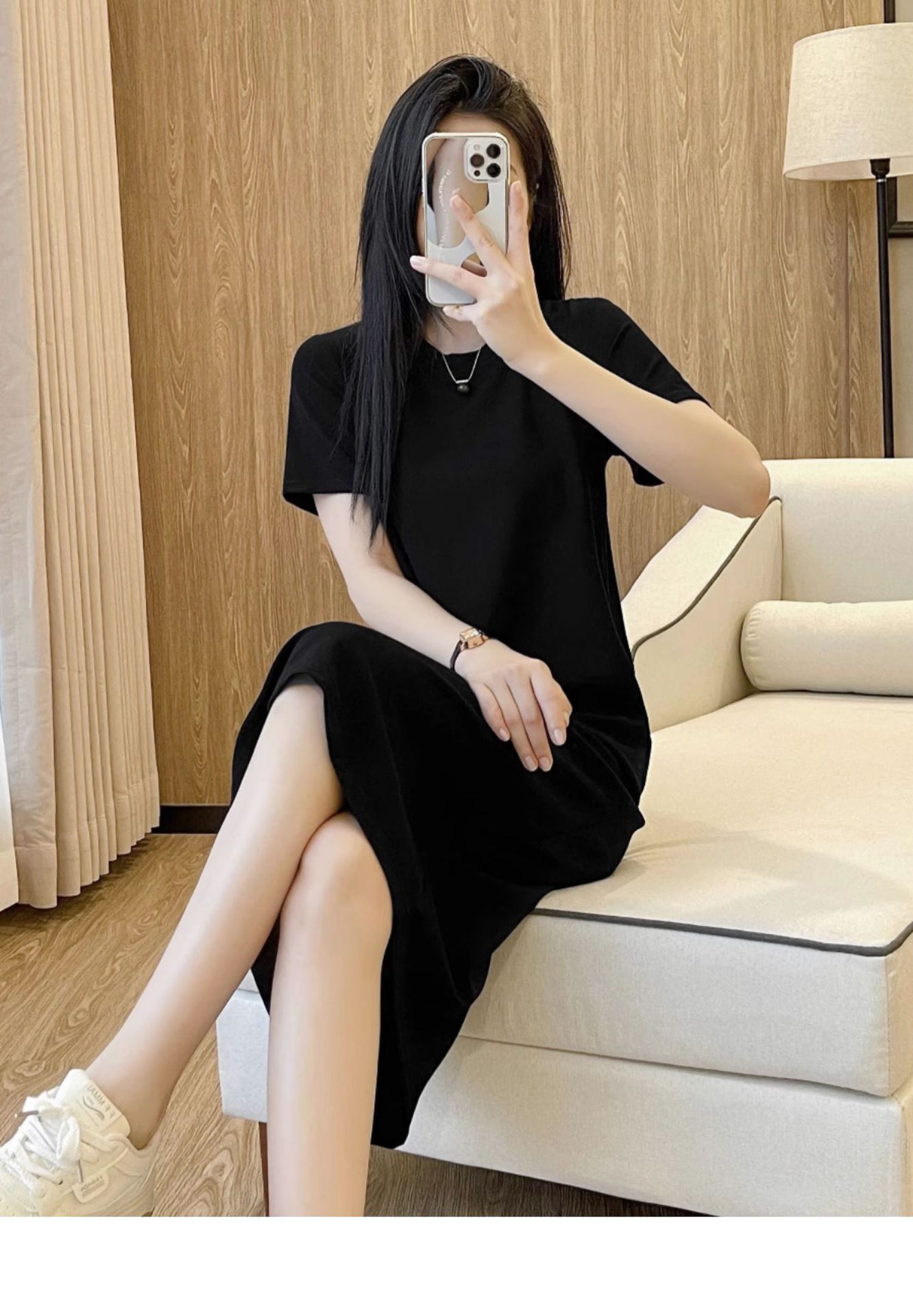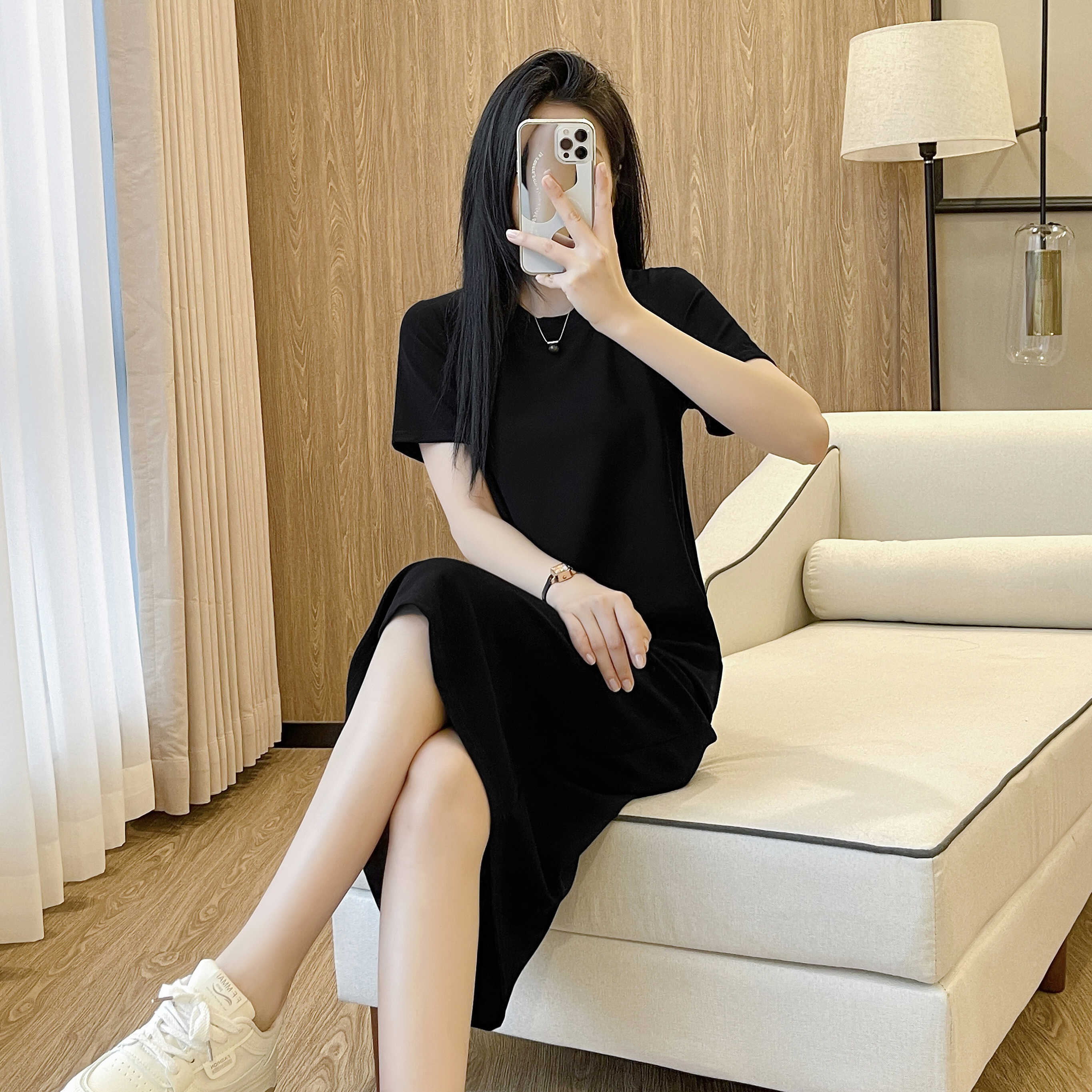 여름 반팔 크루 넥 티셔츠 긴 스커트 슬리밍 느슨한 외신베이스 헵번 스타일 블랙 원피스 여성스토어 가기