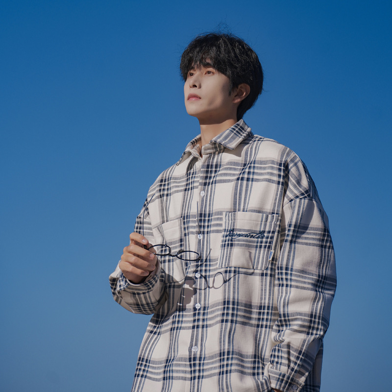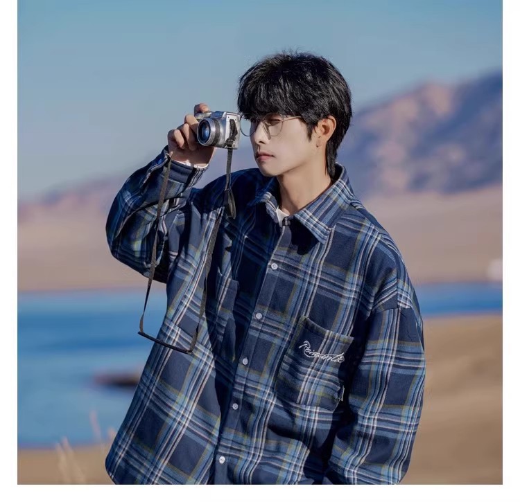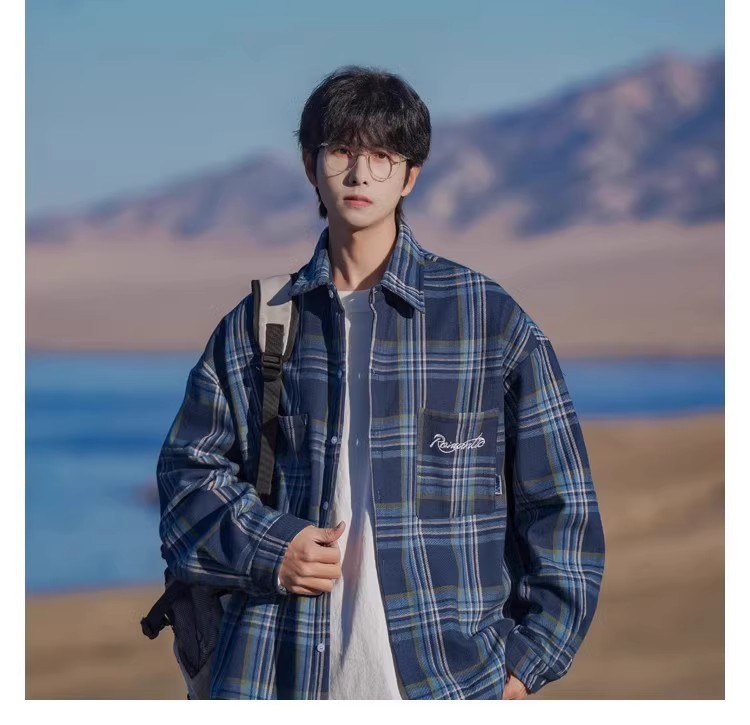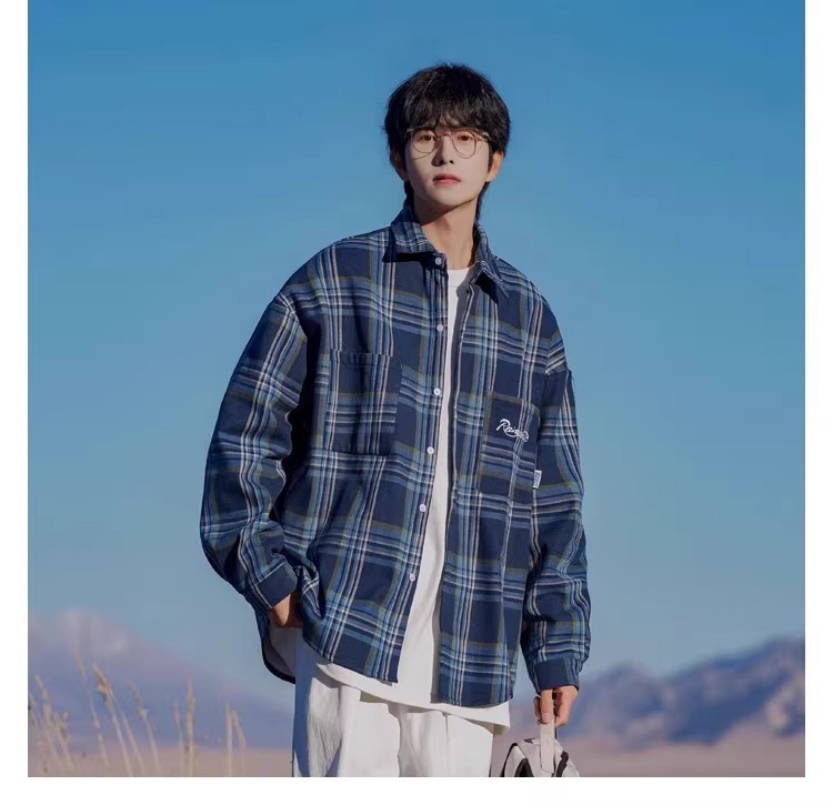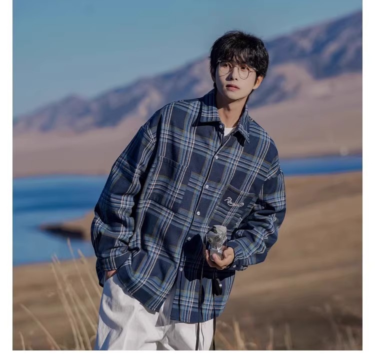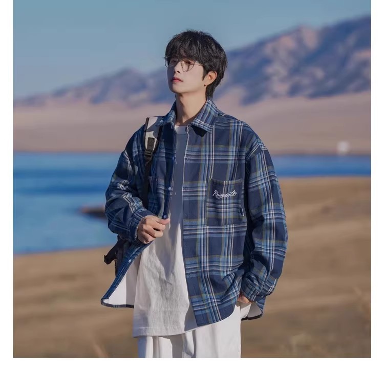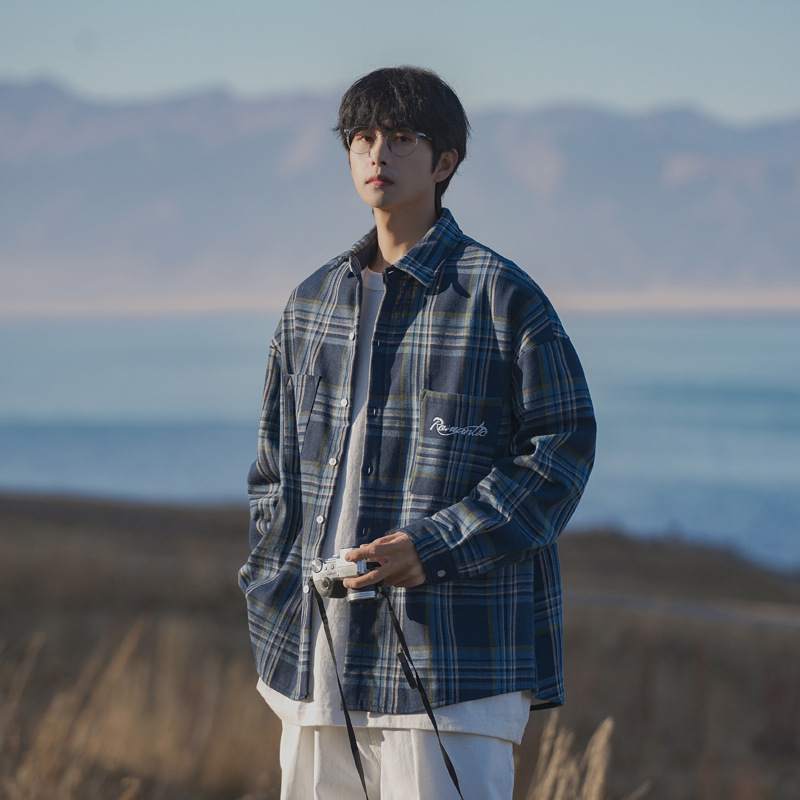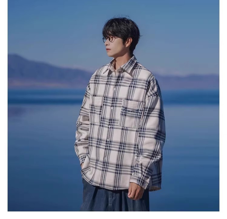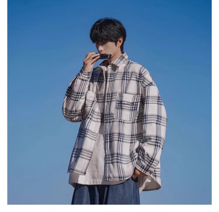 격자 무늬 셔츠 남성 봄, 가을 일본식 단순 자수 긴팔 셔츠 루즈한 복고풍 커플 트렌디 브랜드 캐주얼 재킷