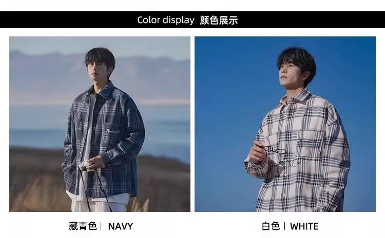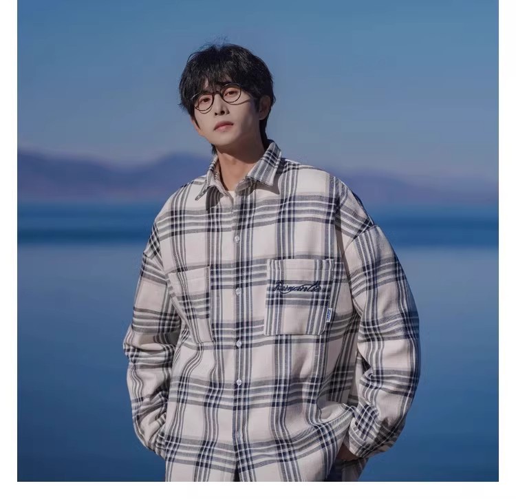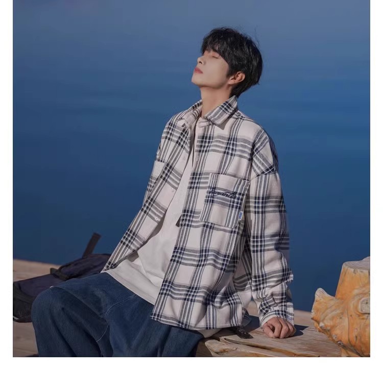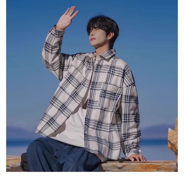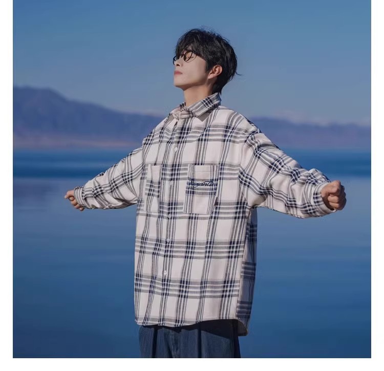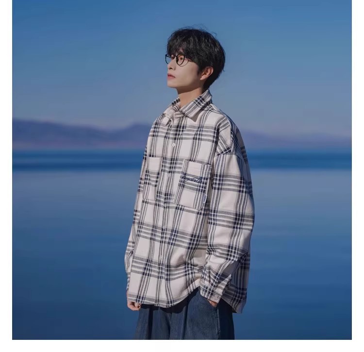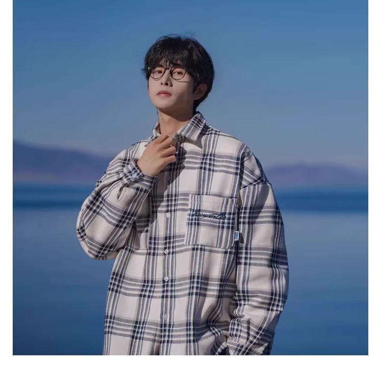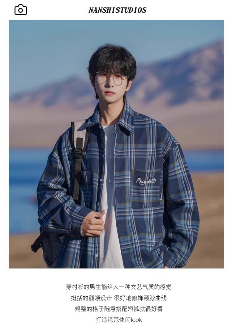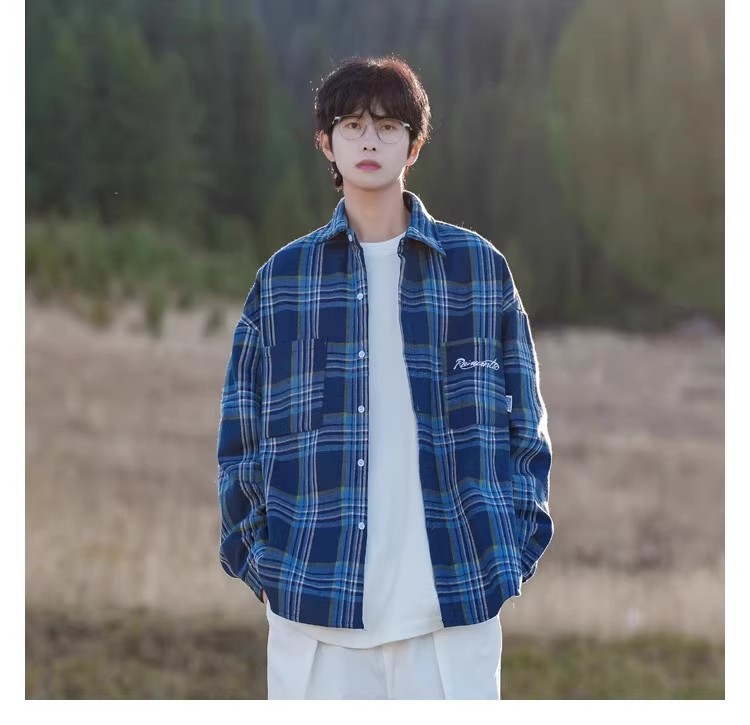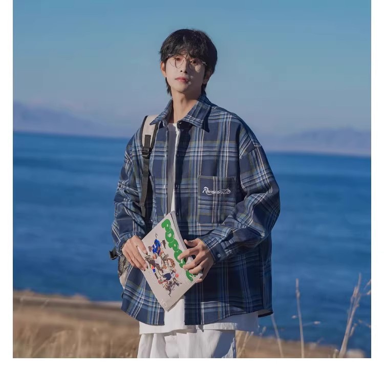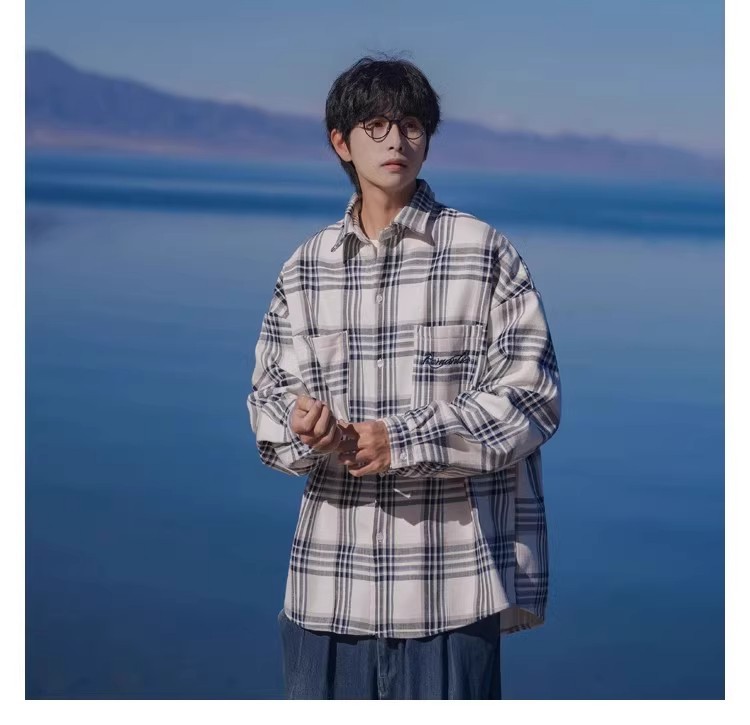 격자 무늬 셔츠 남성 봄, 가을 일본식 단순 자수 긴팔 셔츠 루즈한 복고풍 커플 트렌디 브랜드 캐주얼 재킷스토어 가기