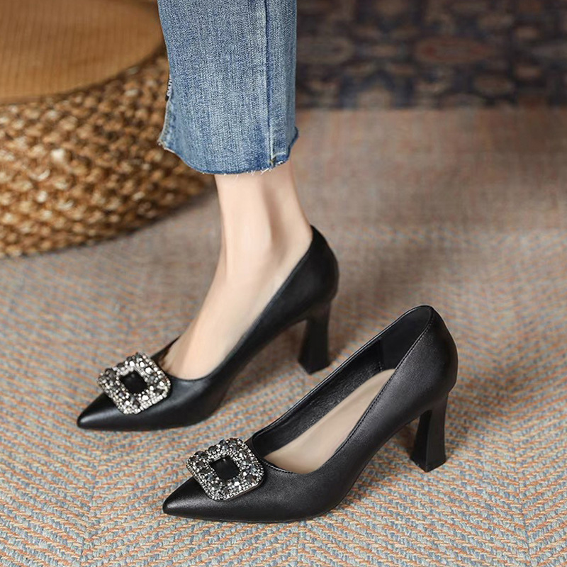 2025 봄과 가을 새로운 하이힐 블랙 통근 청키 힐 얕은 입 라인스톤 전문 싱글 신발 작업 신발스토어 가기