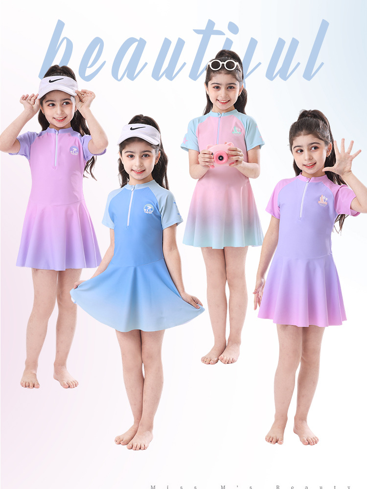 반팔 스포츠 수영복 트레이닝 수영복 아동용 여아 수영복 한국식 원피스 그라데이션 캐주얼 수영복 Zhejiang
