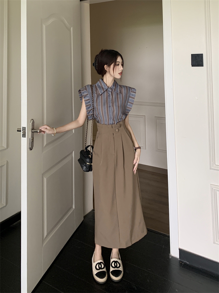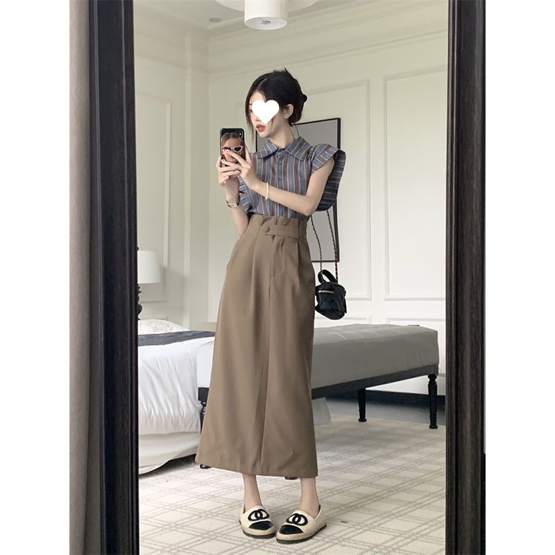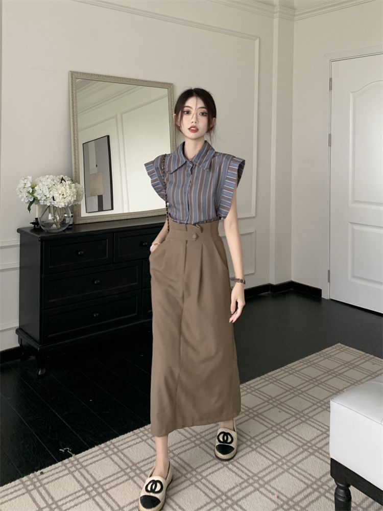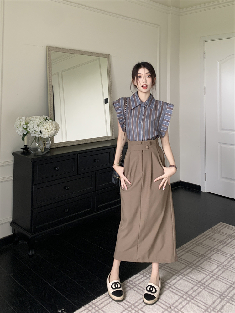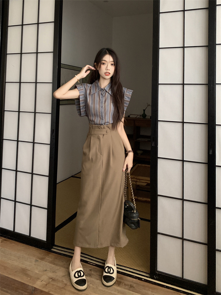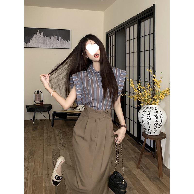 빈티지 스트라이프 디자인 센스 작은 플라잉 슬리브 셔츠 높은 허리 스플릿 스커트 여성 여름 2025 새로운 패션 세트