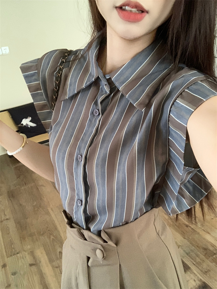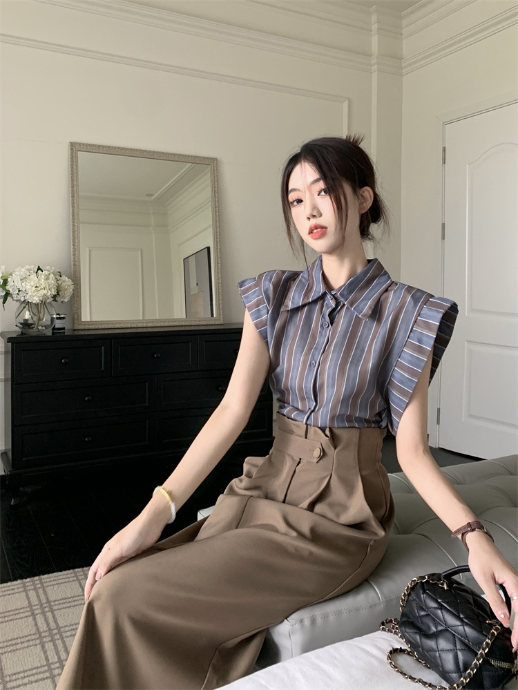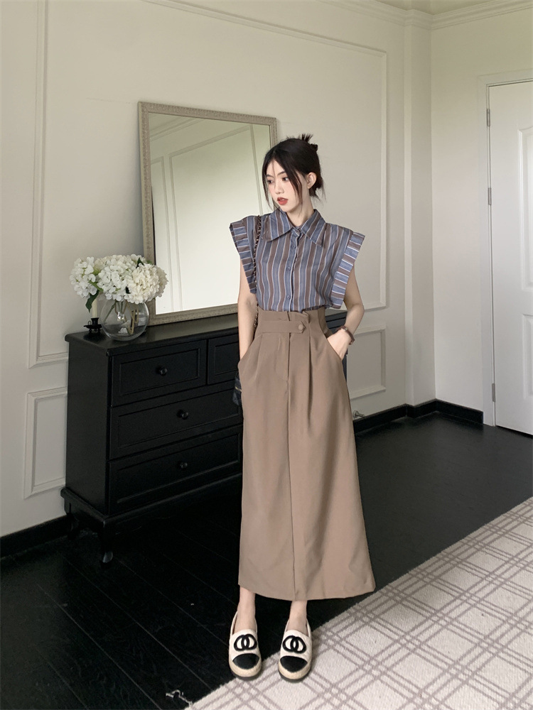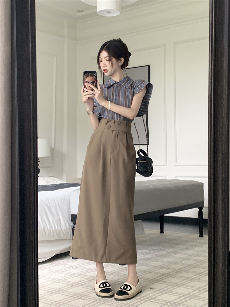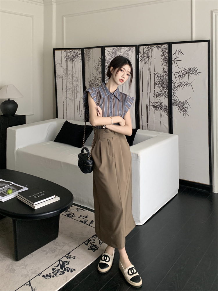 빈티지 스트라이프 디자인 센스 작은 플라잉 슬리브 셔츠 높은 허리 스플릿 스커트 여성 여름 2025 새로운 패션 세트