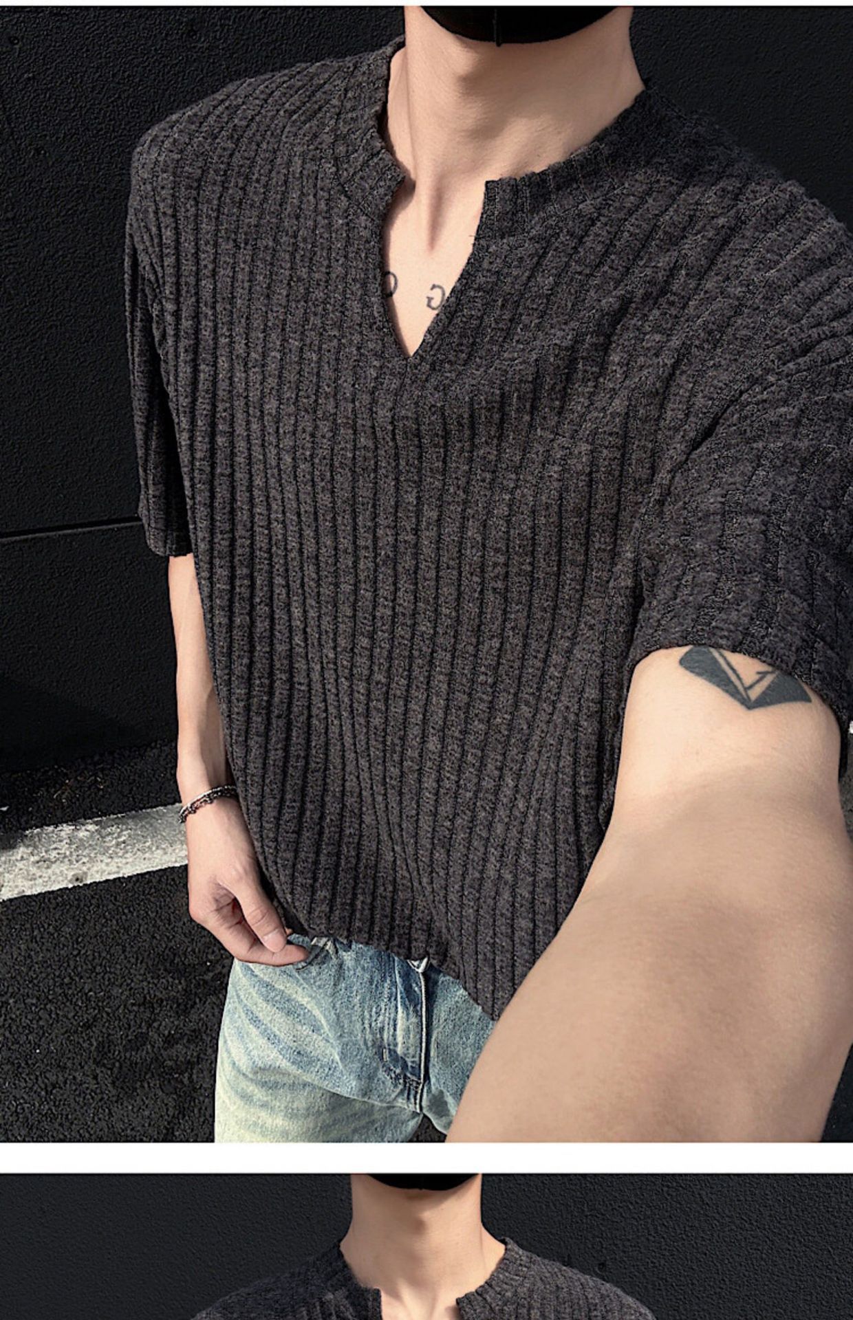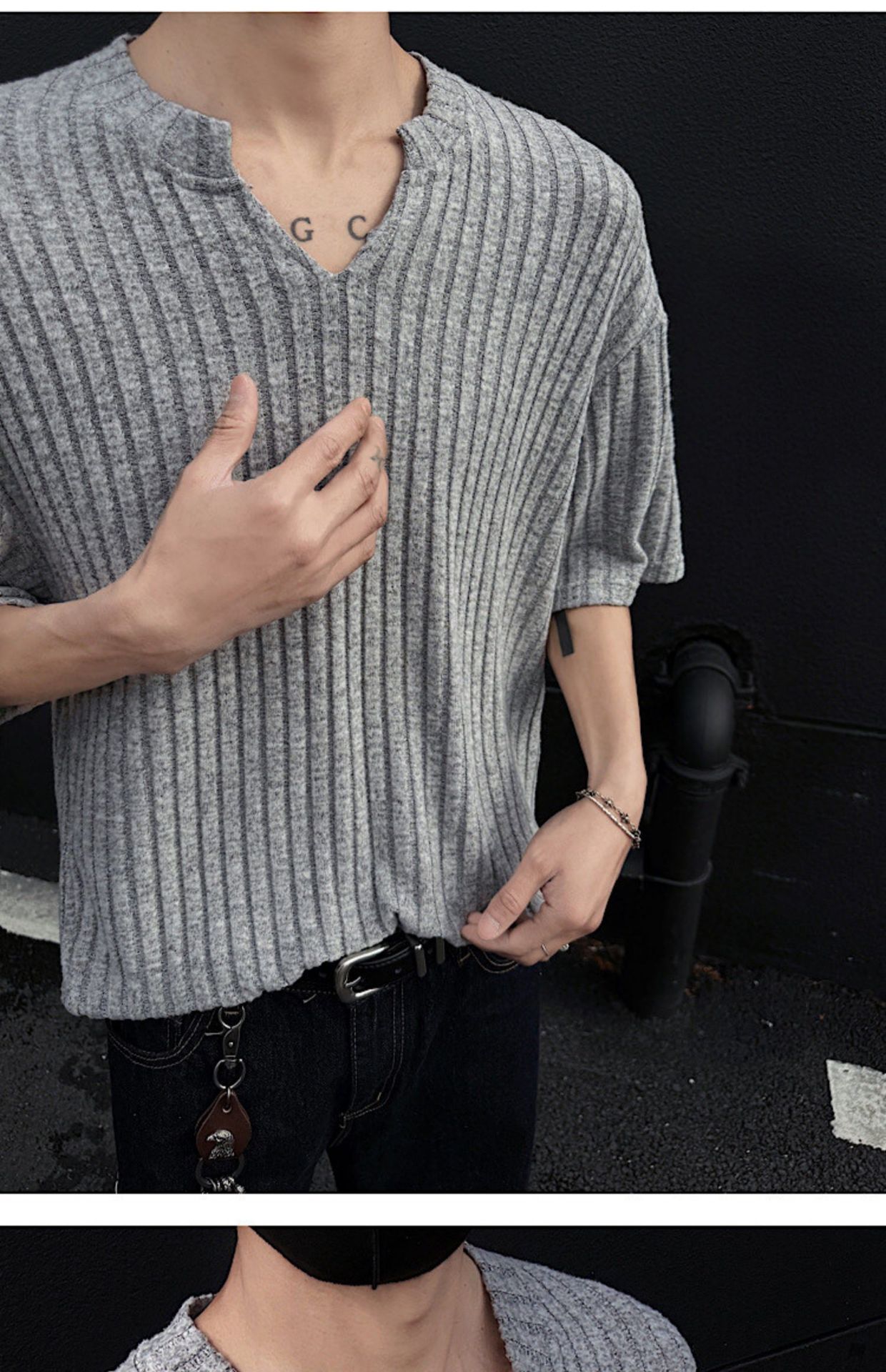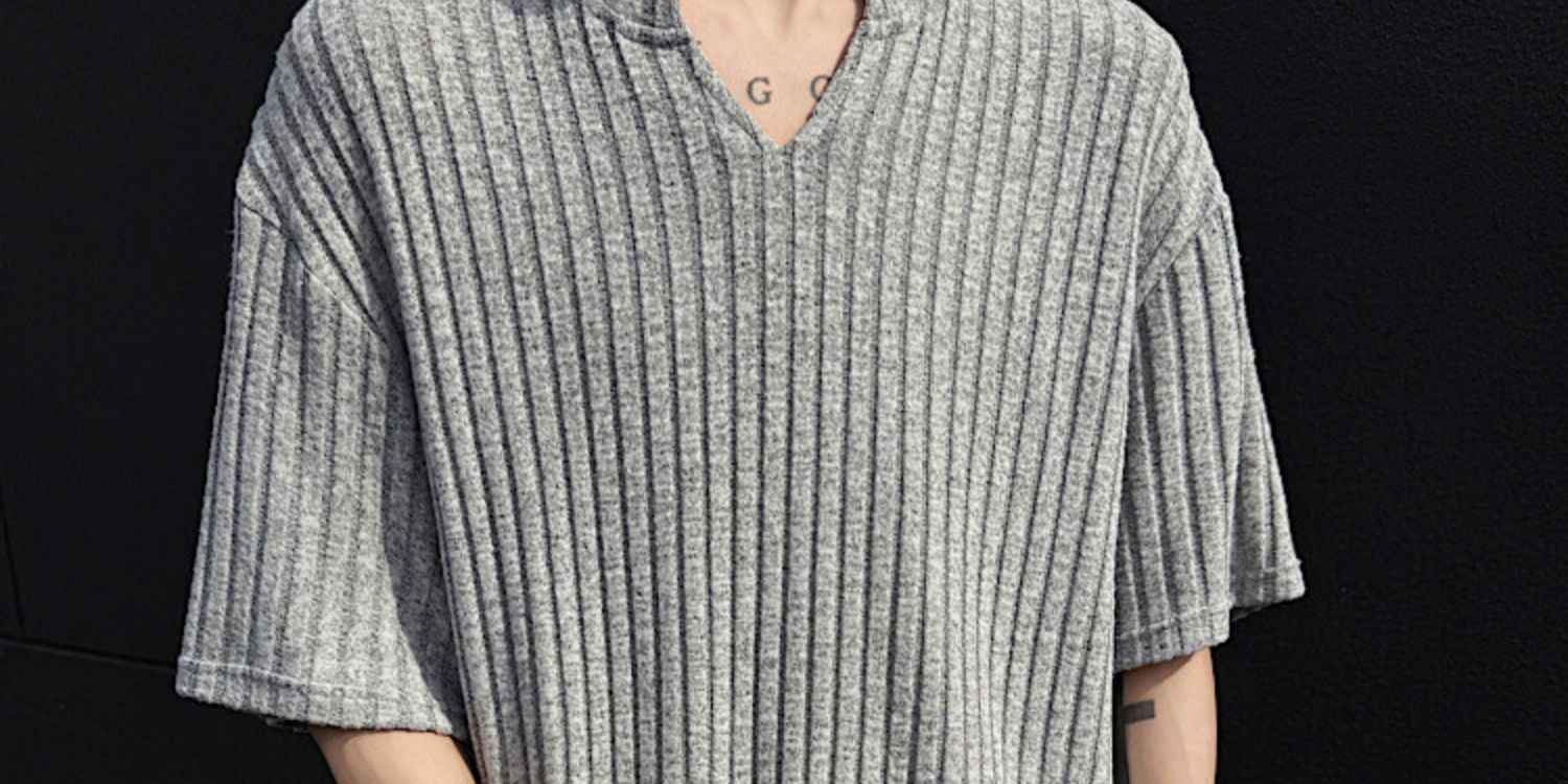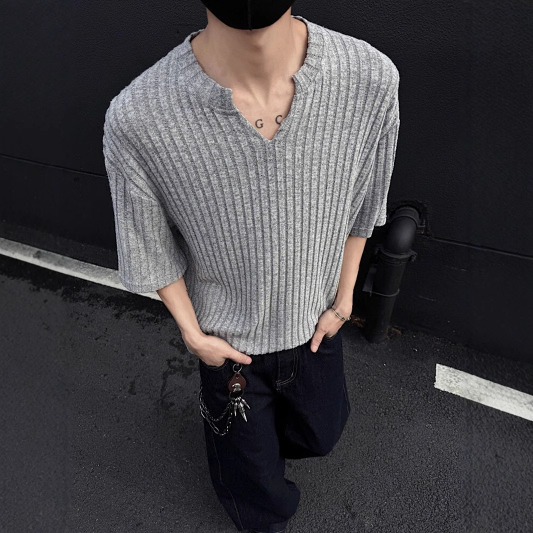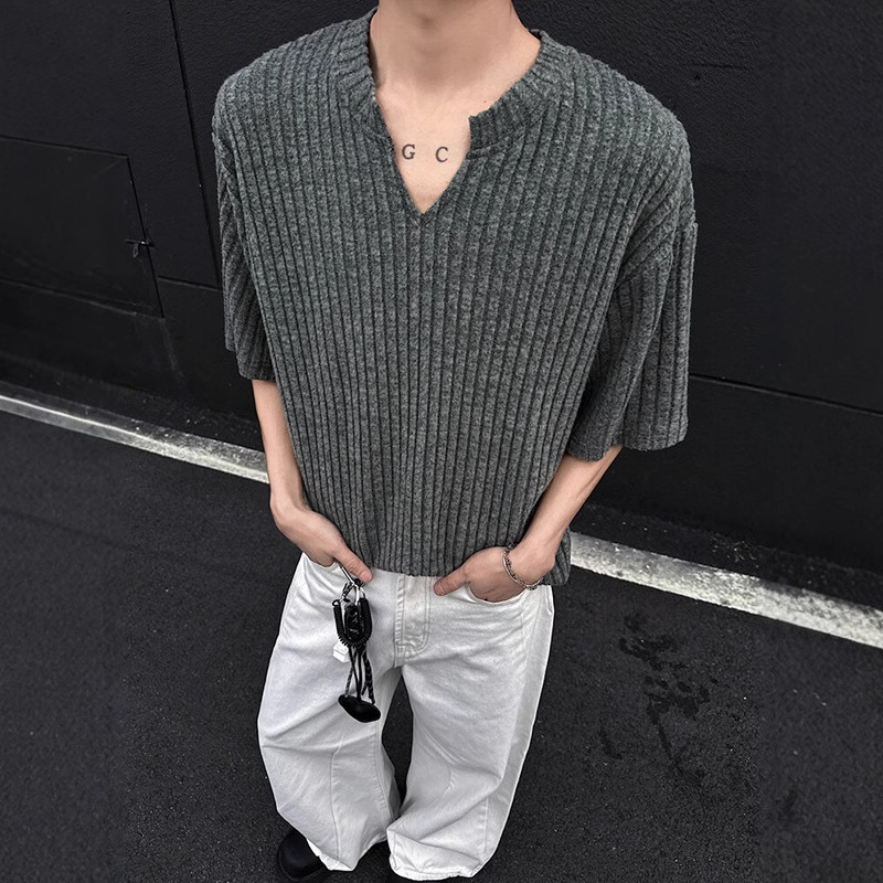 V 넥 샌딩 하이 엔드 반팔 티셔츠 남성 여름 새로운 피트 스트립 하프 슬리브 클렌핏 텍스처 티셔츠