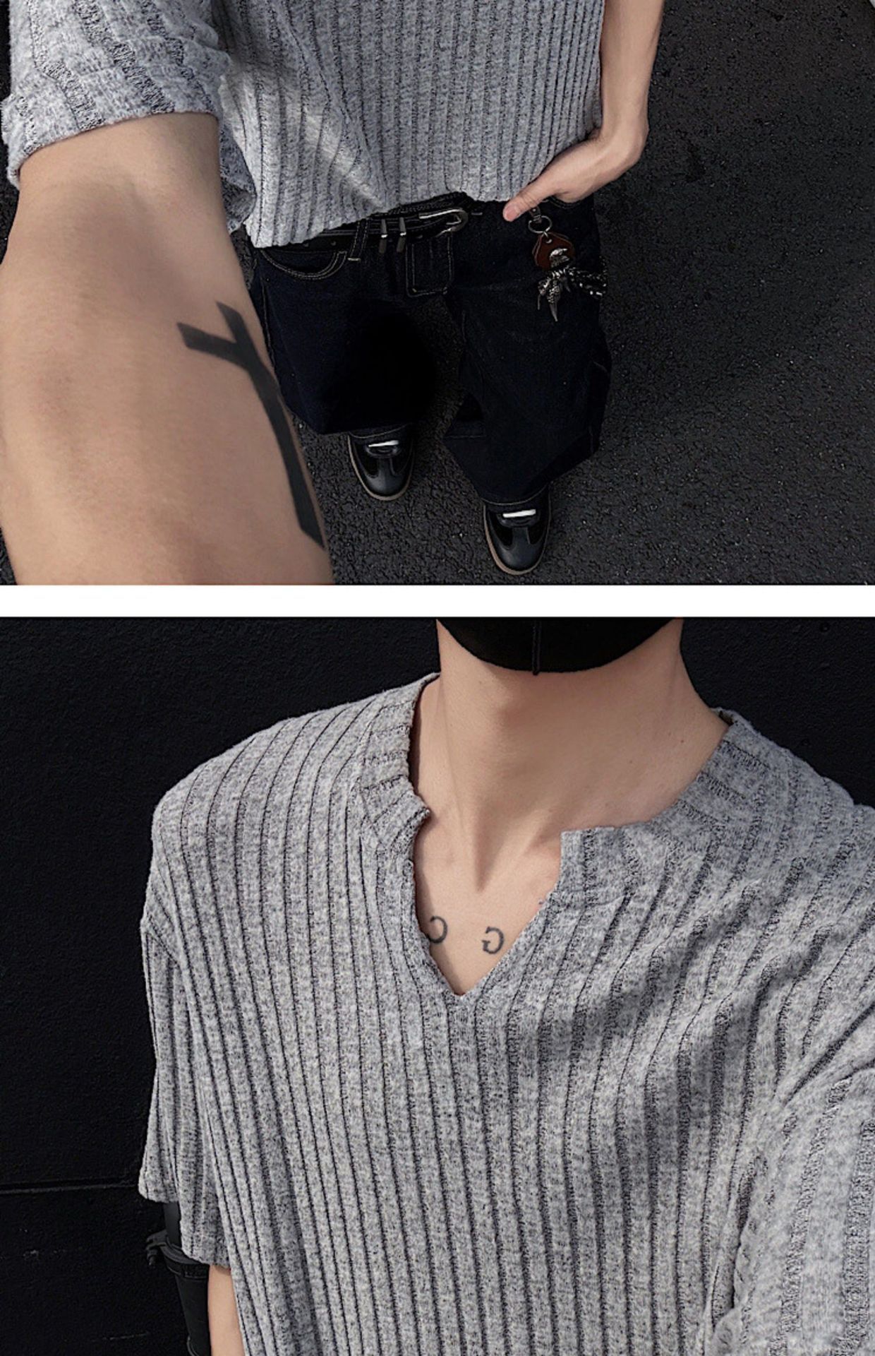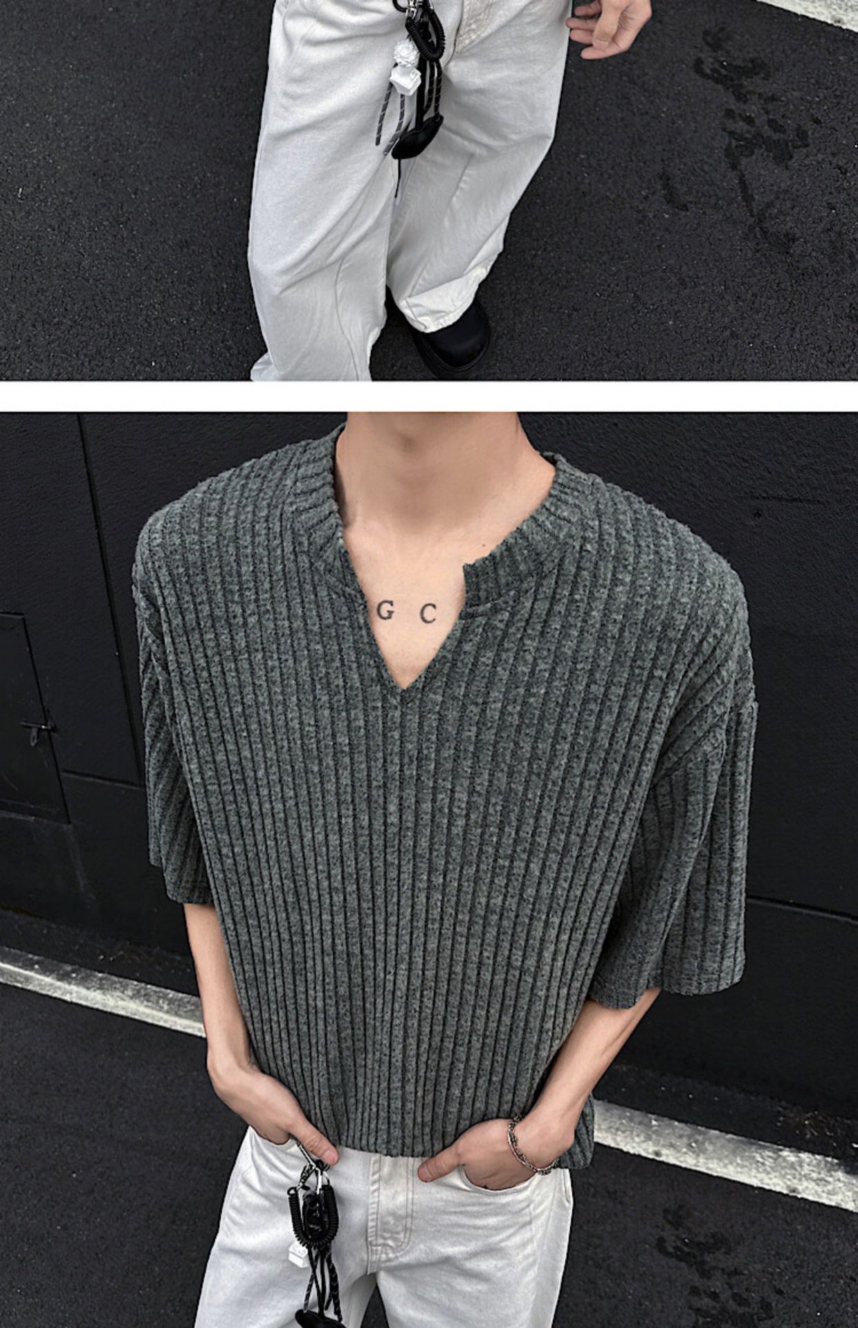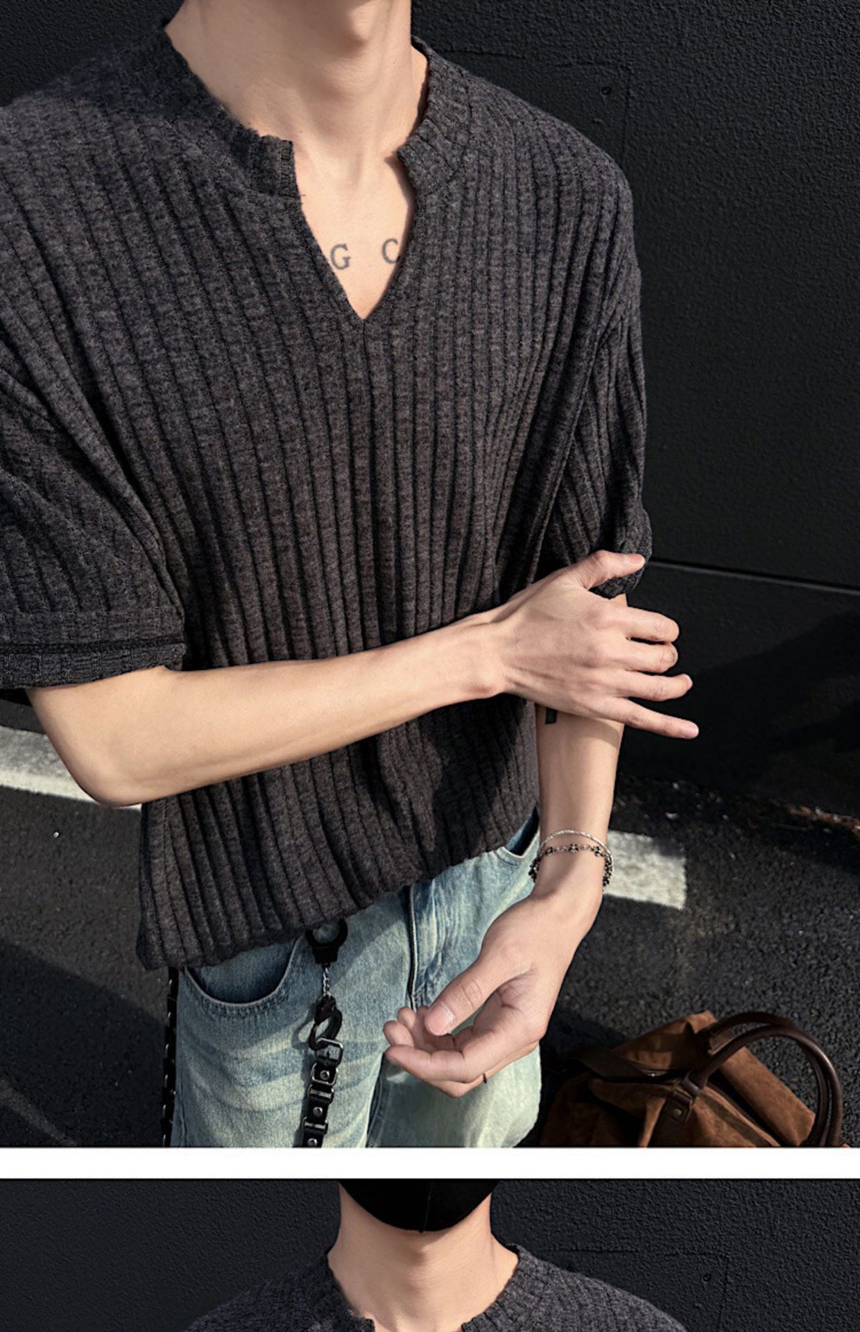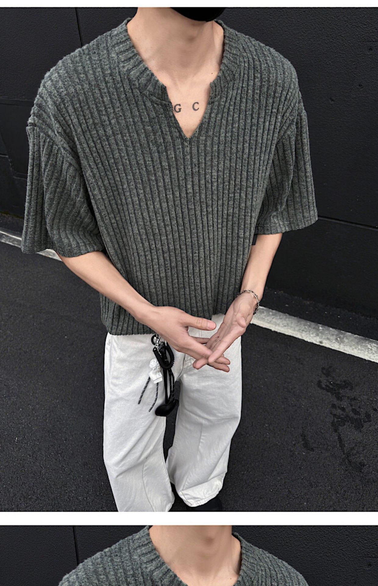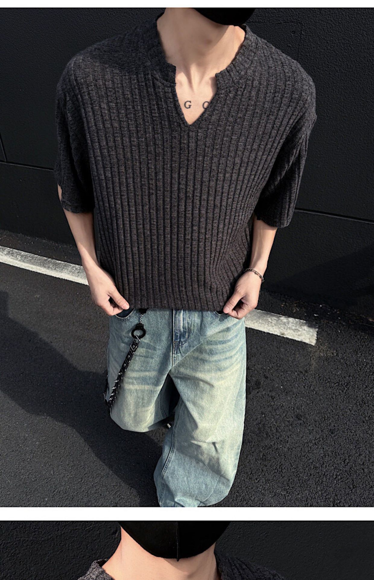 V 넥 샌딩 하이 엔드 반팔 티셔츠 남성 여름 새로운 피트 스트립 하프 슬리브 클렌핏 텍스처 티셔츠