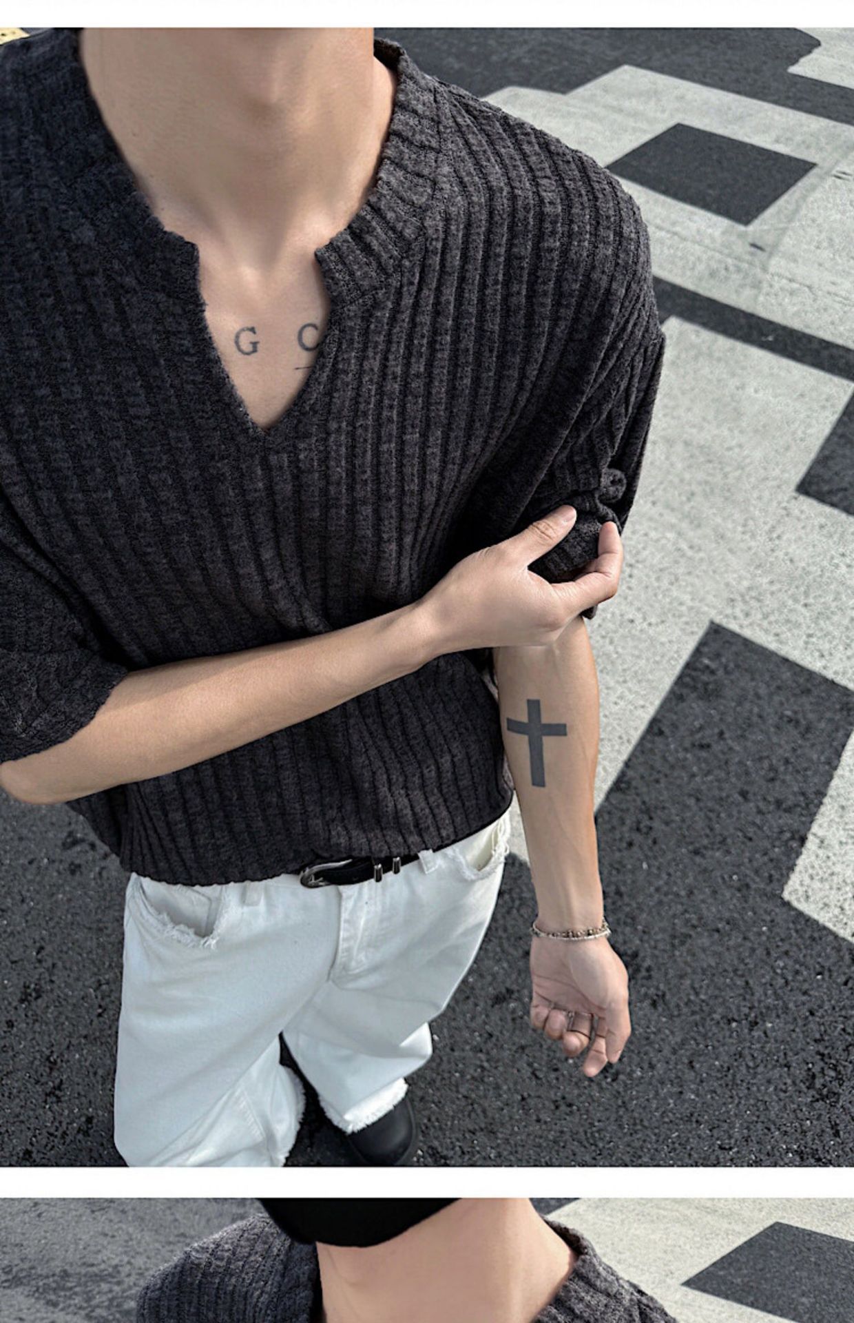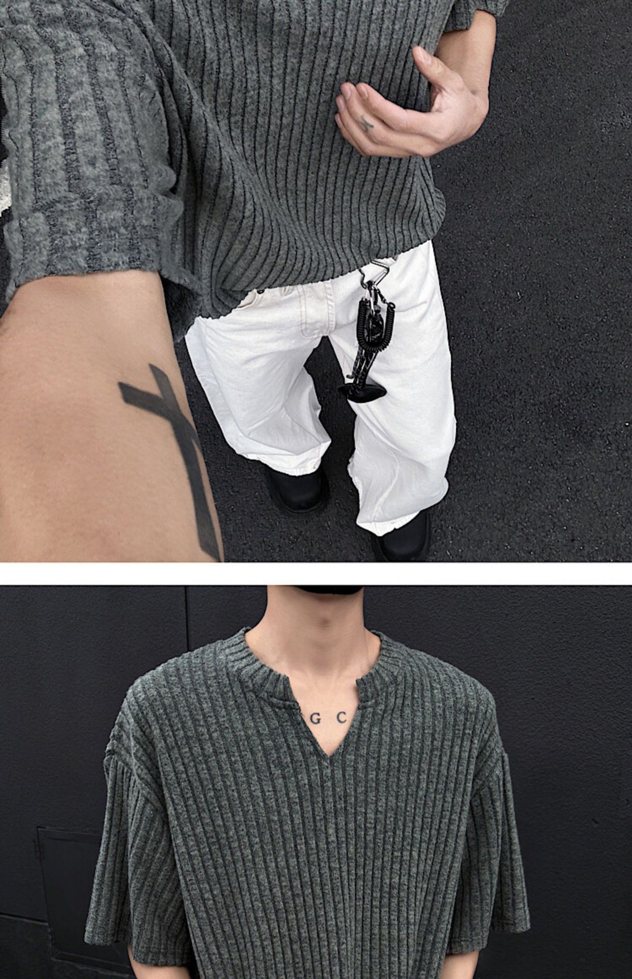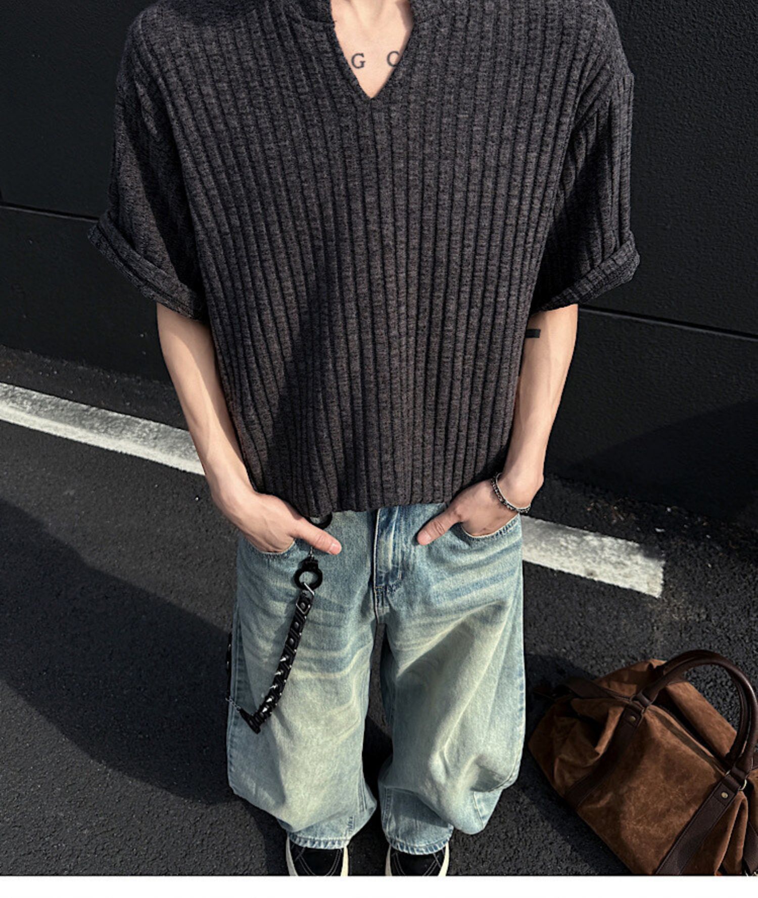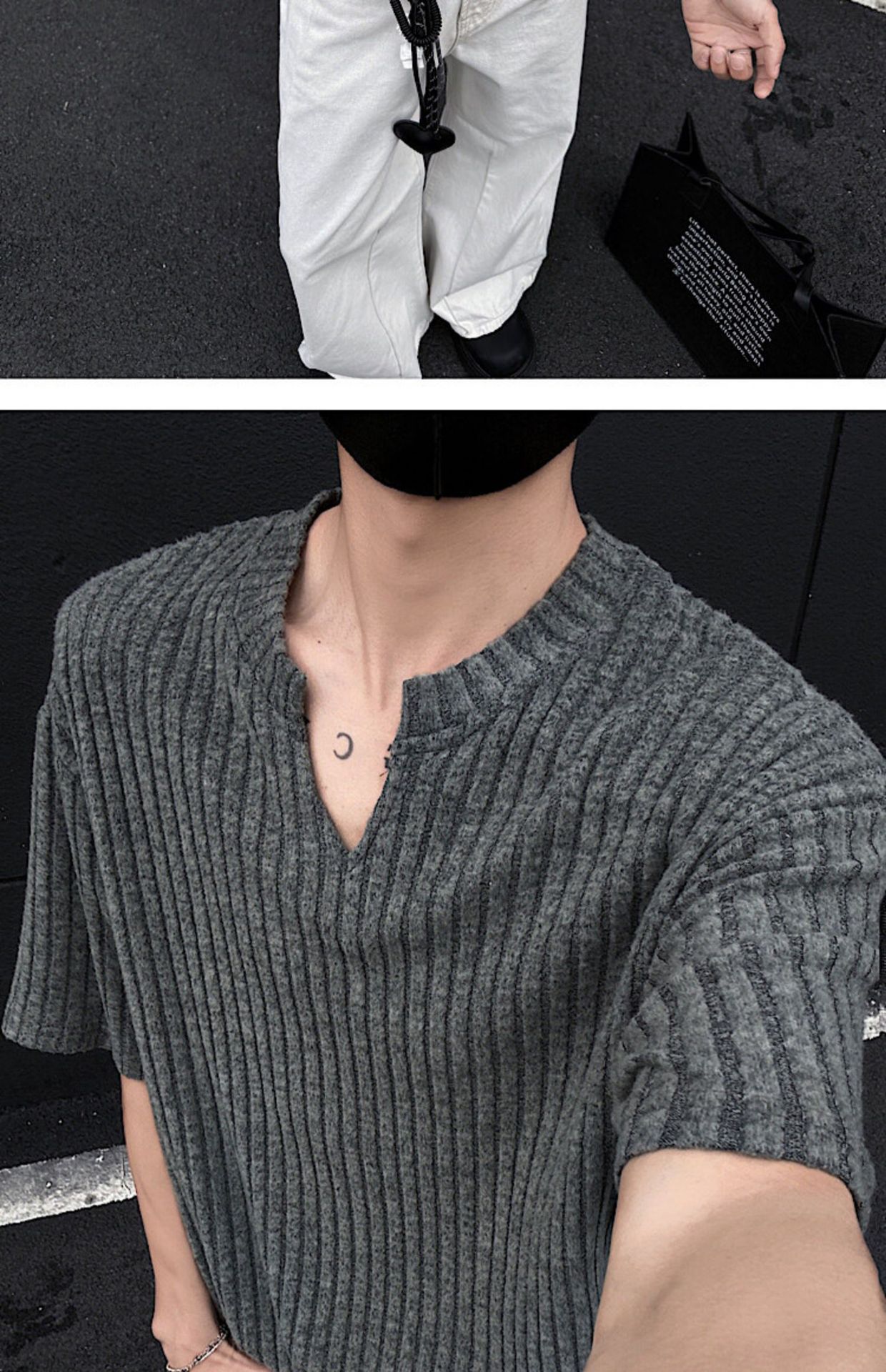 V 넥 샌딩 하이 엔드 반팔 티셔츠 남성 여름 새로운 피트 스트립 하프 슬리브 클렌핏 텍스처 티셔츠