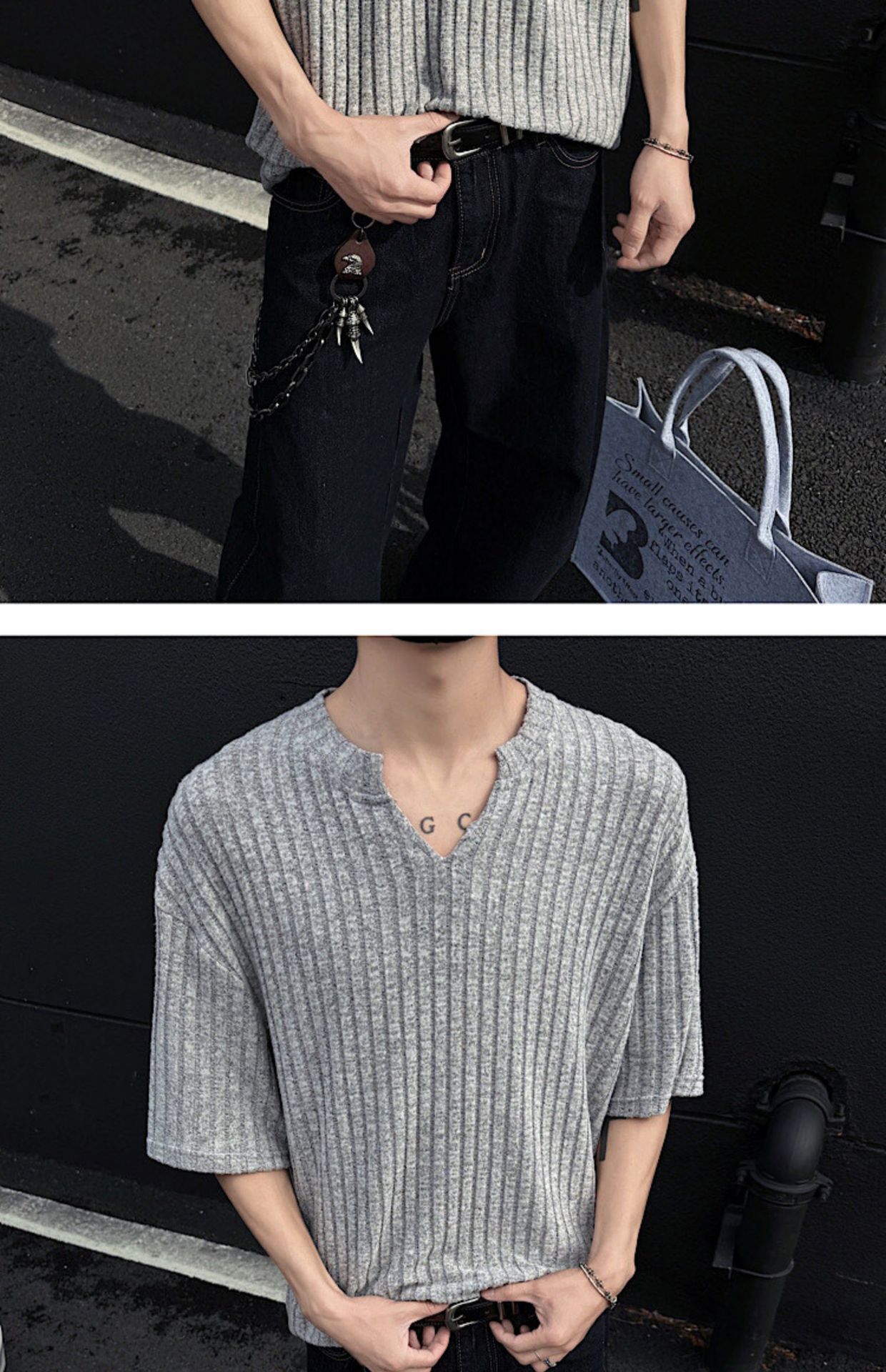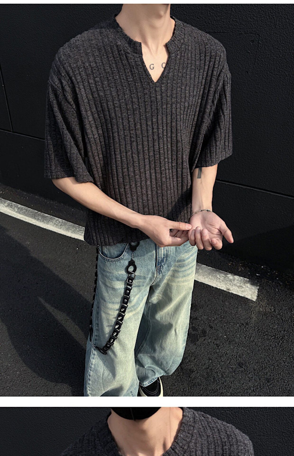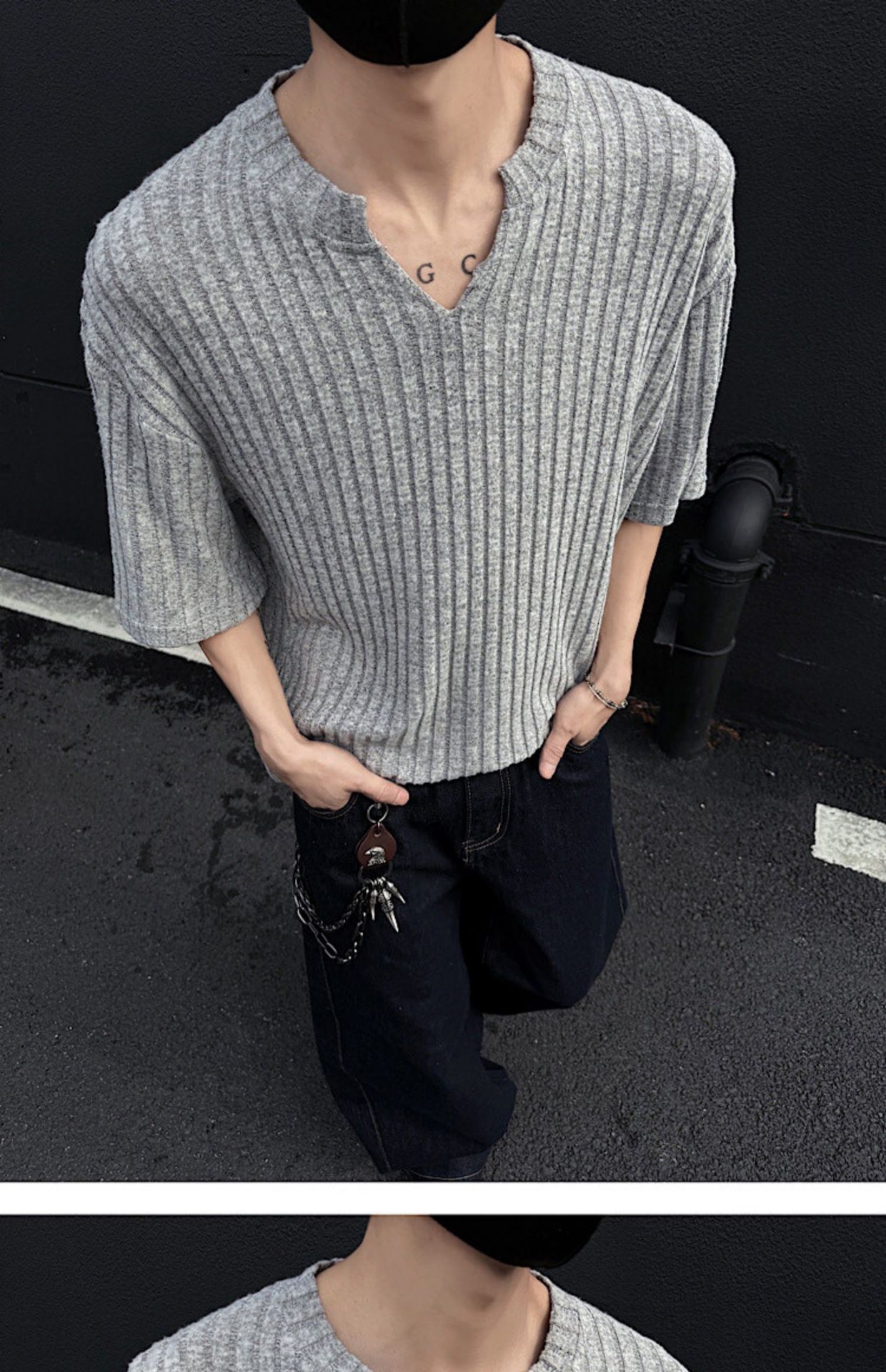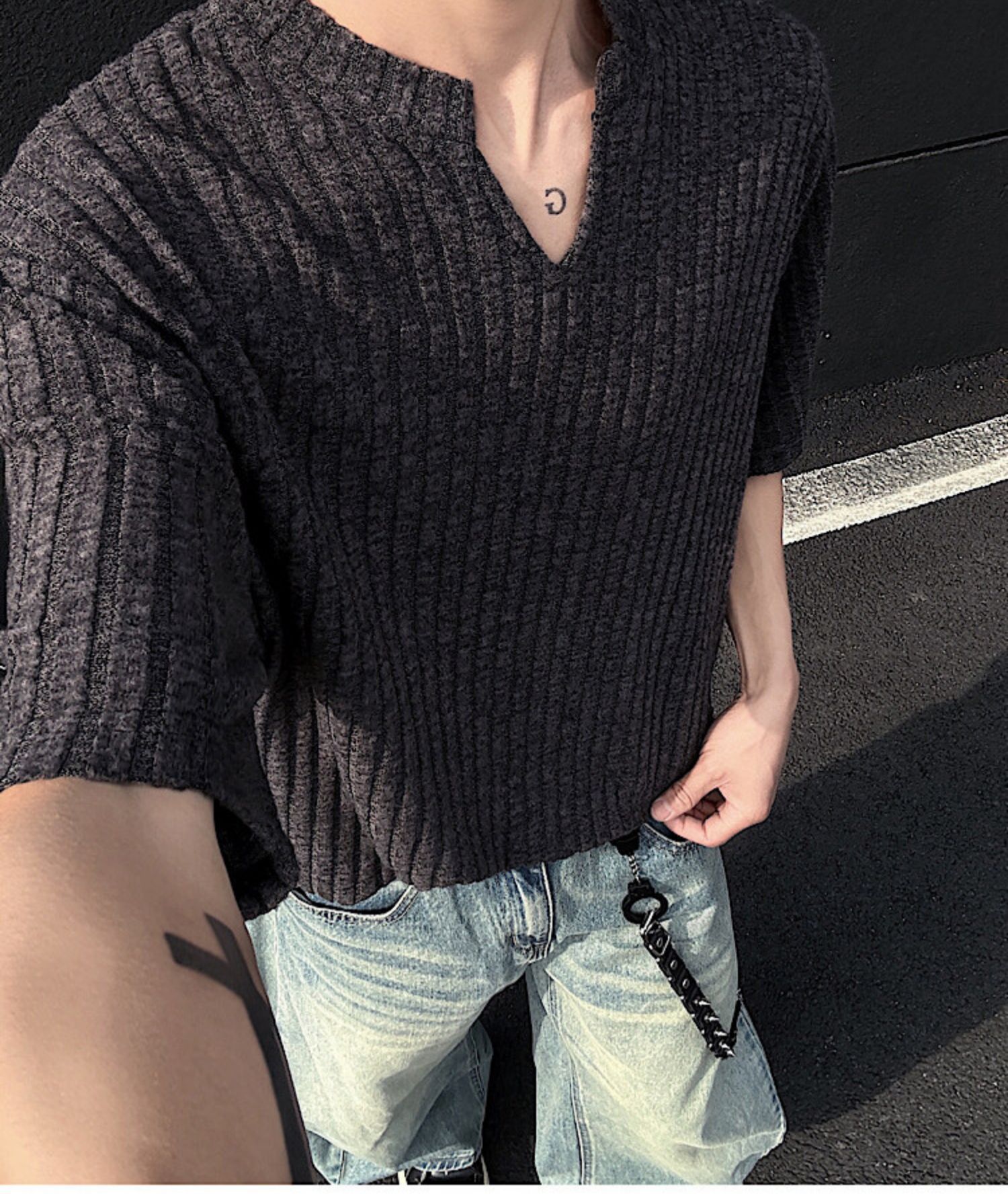 V 넥 샌딩 하이 엔드 반팔 티셔츠 남성 여름 새로운 피트 스트립 하프 슬리브 클렌핏 텍스처 티셔츠스토어 가기