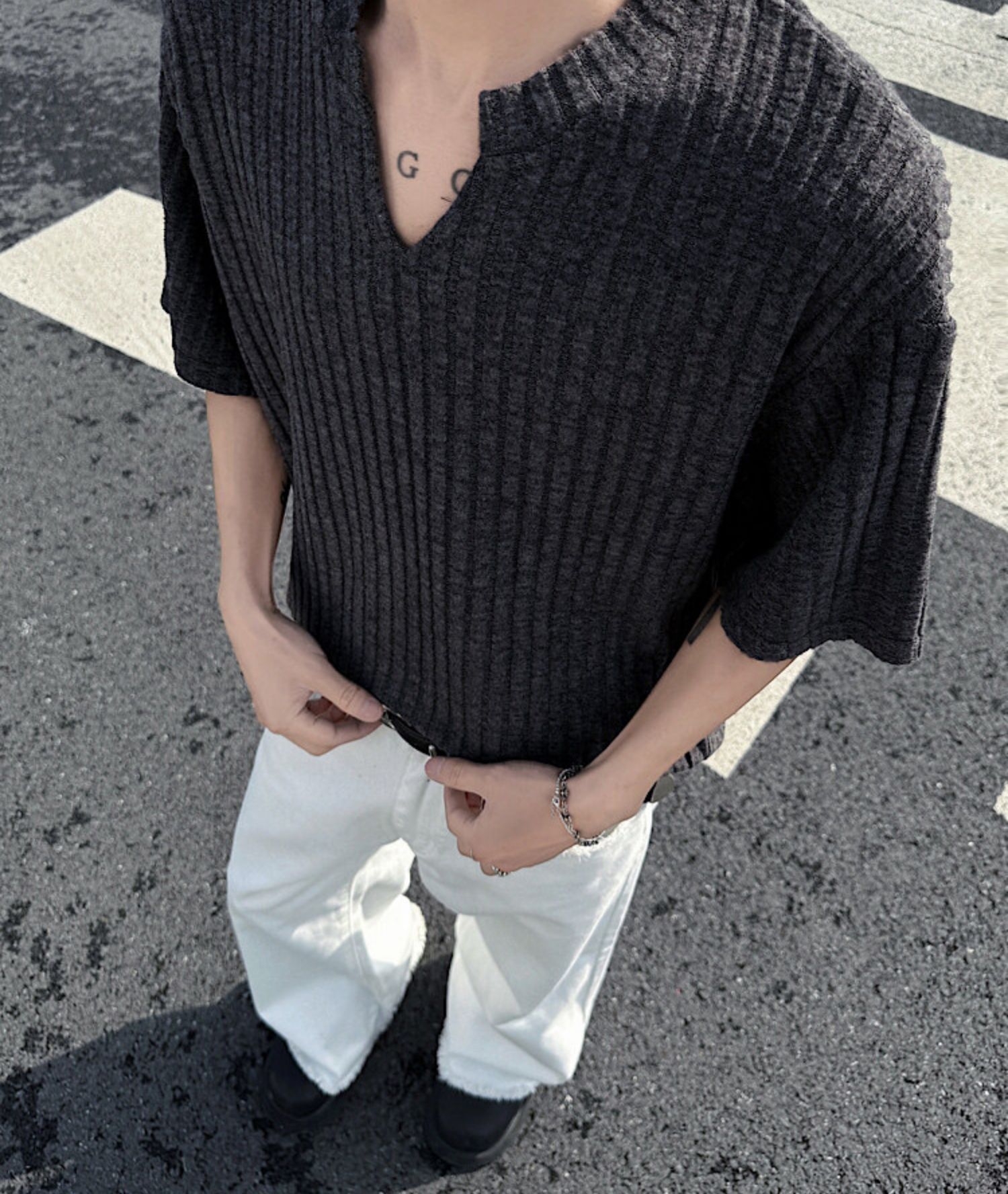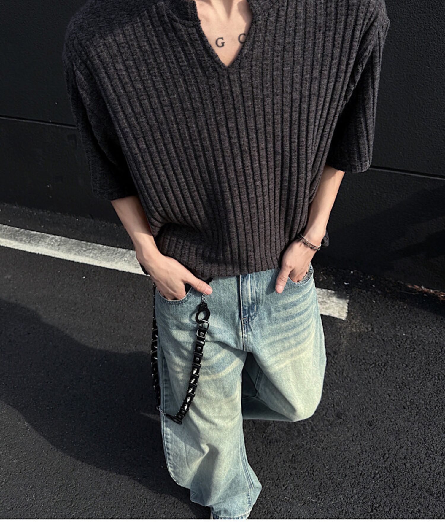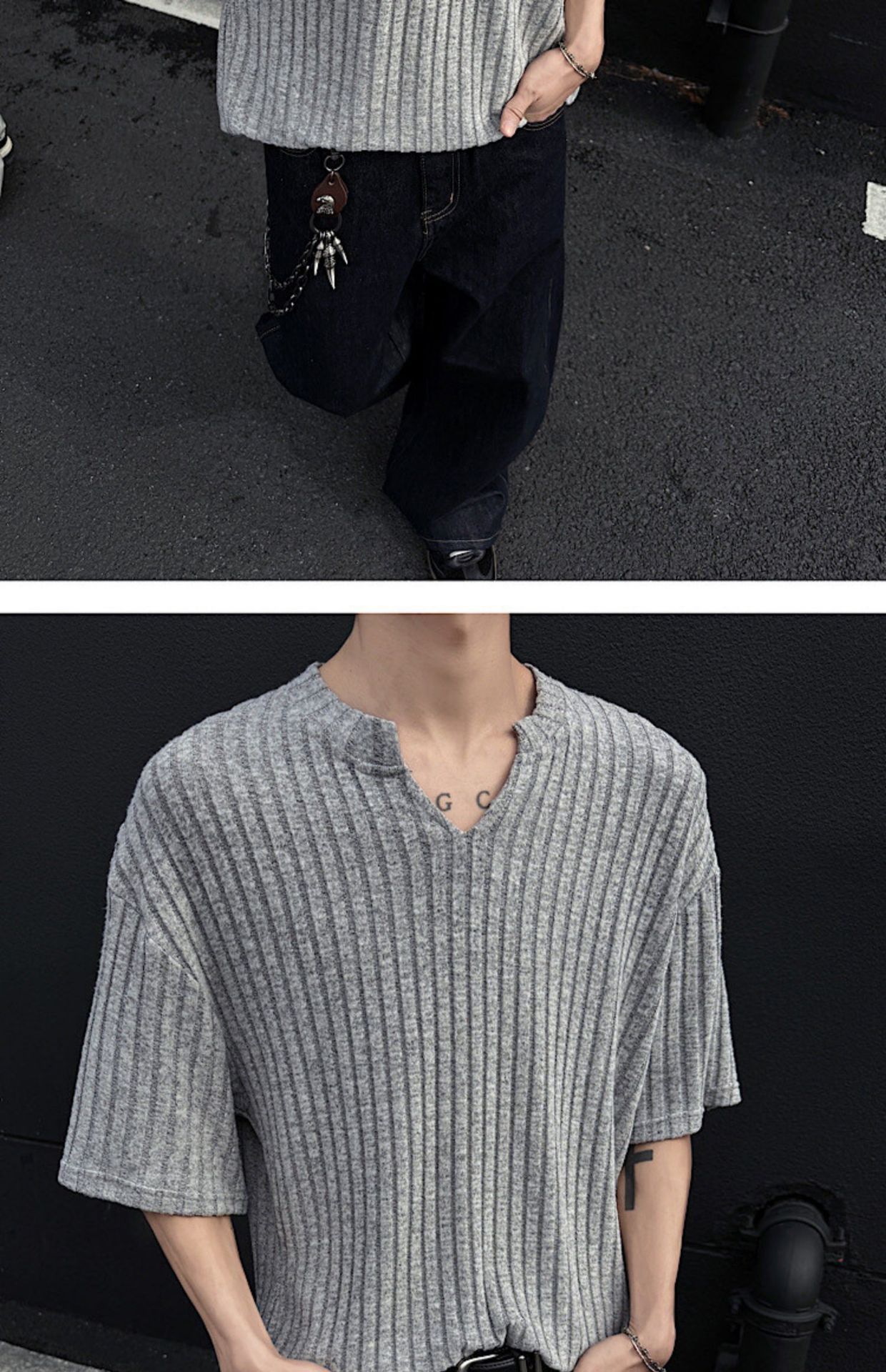 V 넥 샌딩 하이 엔드 반팔 티셔츠 남성 여름 새로운 피트 스트립 하프 슬리브 클렌핏 텍스처 티셔츠스토어 가기