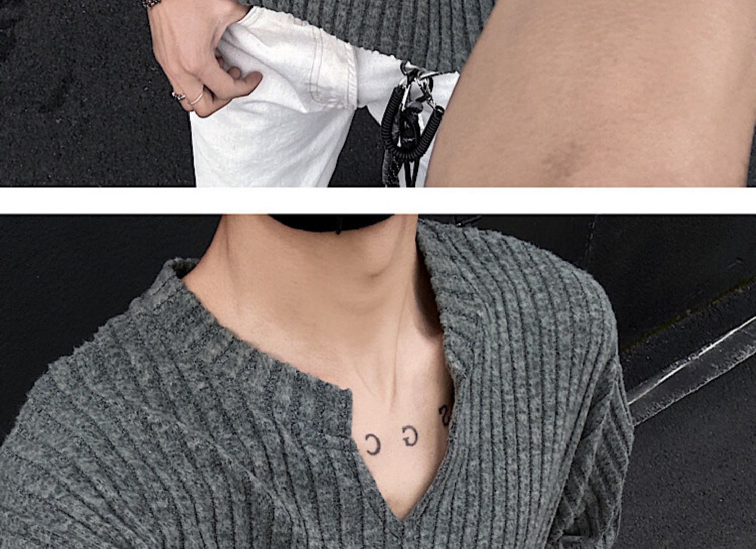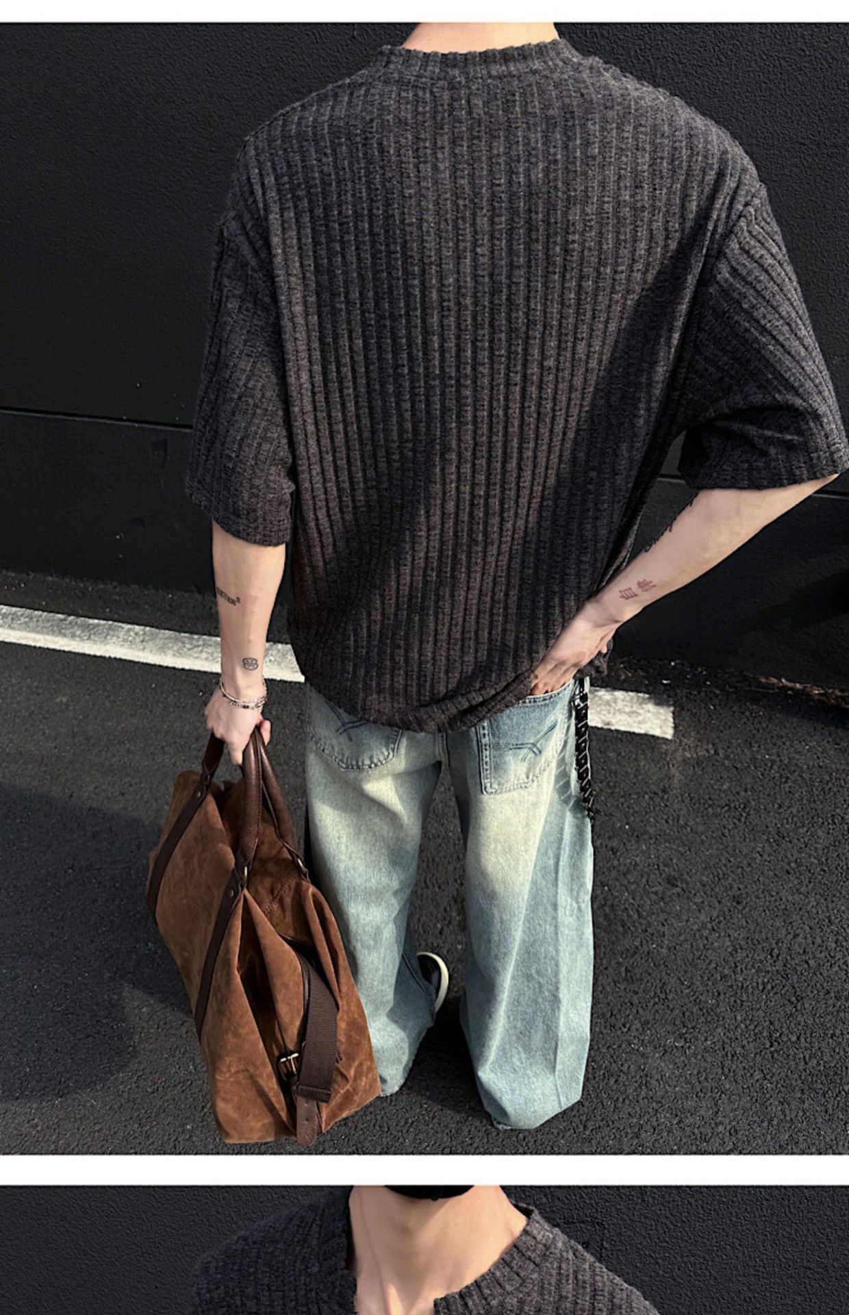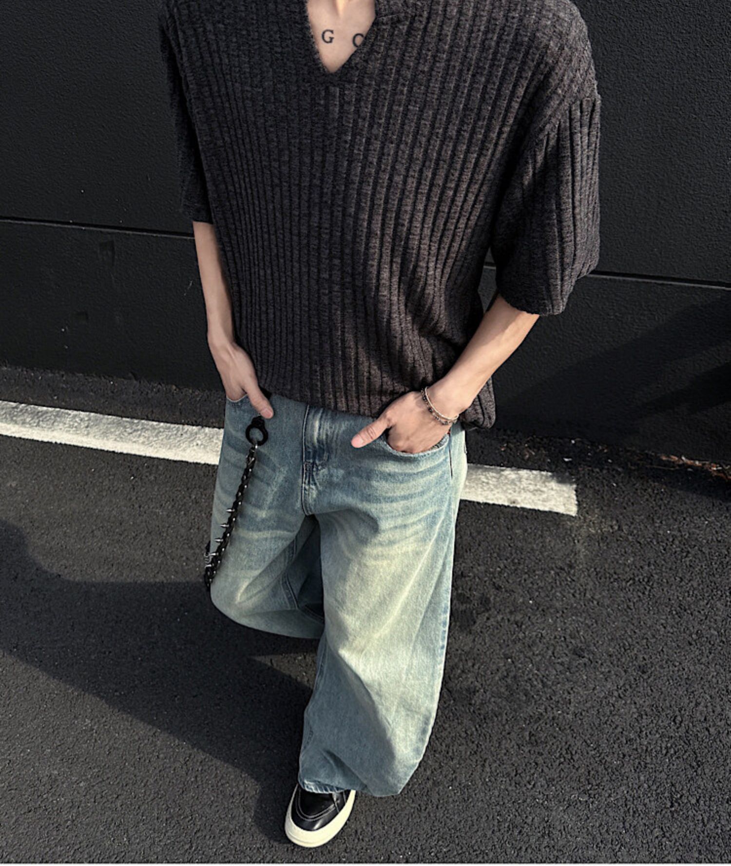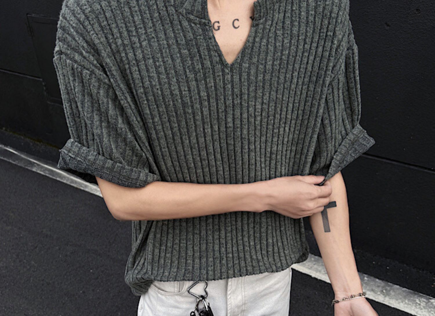 V 넥 샌딩 하이 엔드 반팔 티셔츠 남성 여름 새로운 피트 스트립 하프 슬리브 클렌핏 텍스처 티셔츠스토어 가기