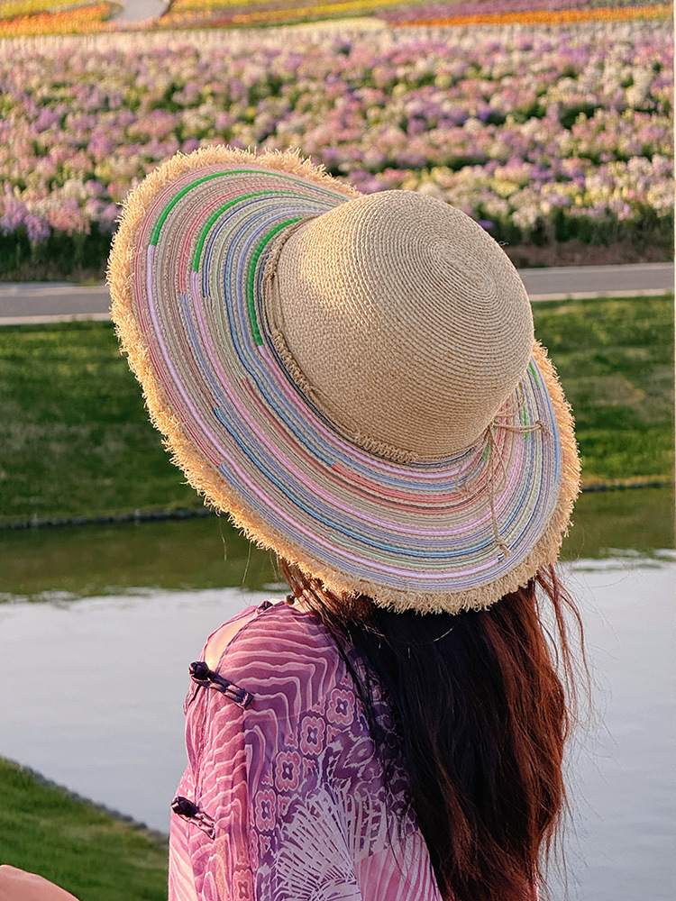 무지개 라피트 밀짚 선스크린 모자 여성의 여름 큰 챙이 햇빛 모자 UV 보호 해변 여행 해변 분지 모자스토어 가기