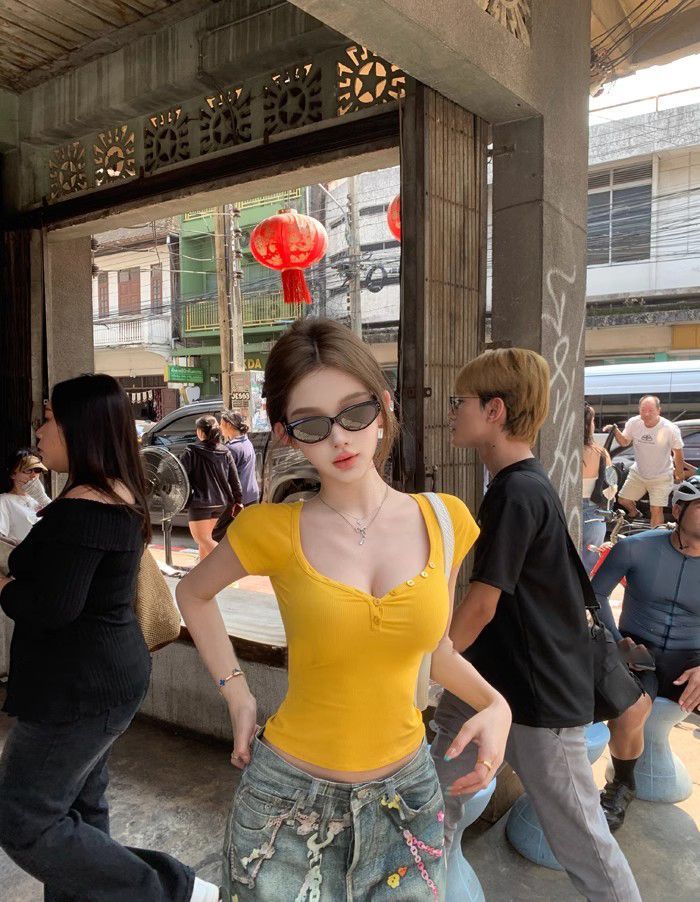 스파이스 걸스 순수한 욕망 섹시한 복숭아 칼라 솔리드 컬러 반팔 티셔츠 여성용 여름 틈새 슬림 핏 슬리밍 쇼트 탑 인스토어 가기