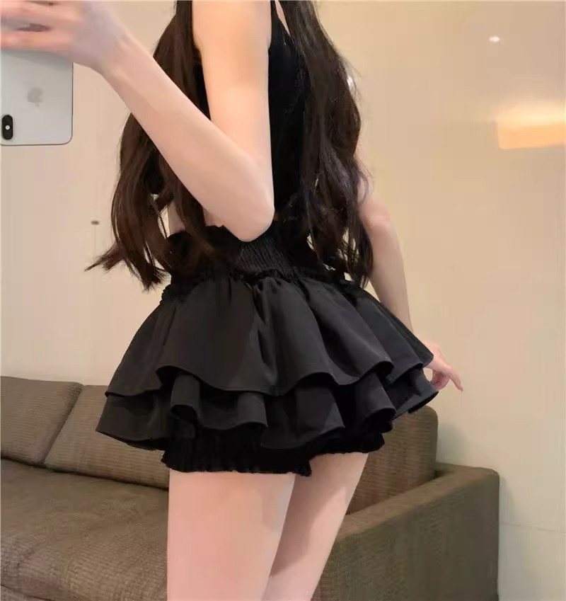 여성을 위한 프렌치 스타일 블랙 퍼프 스커트 봄 주름 허리 슬리밍 노출 방지 A라인 케이크 짧은 스커트