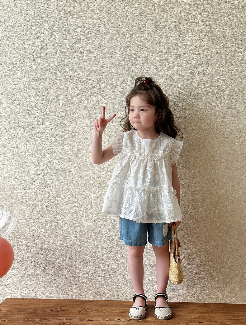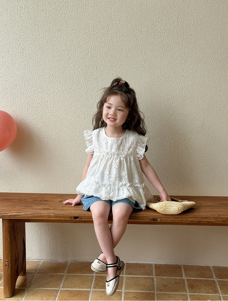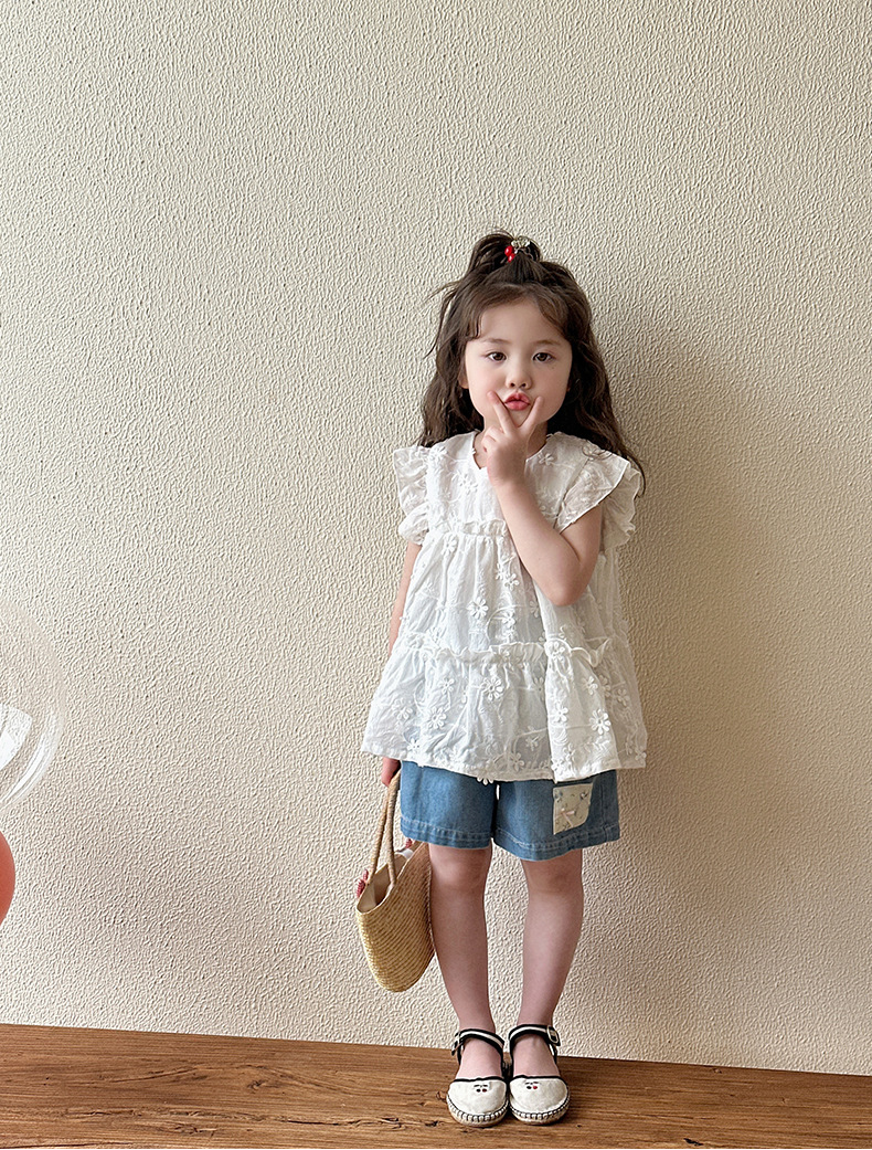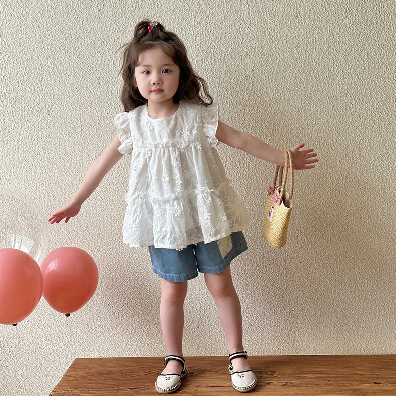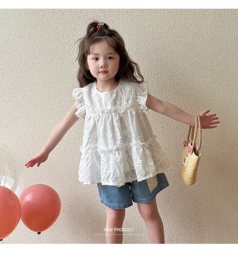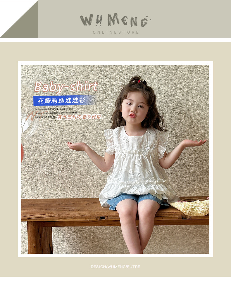 여자 여름 셔츠 2025 새로운 아이들 슬리브 탑 여름 달콤한 어린이 착용 아기 짧은 소매 인형 셔츠스토어 가기