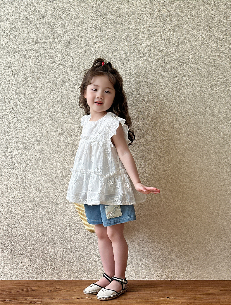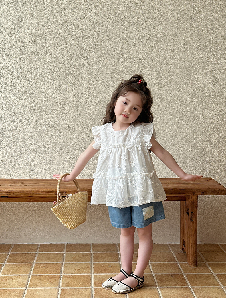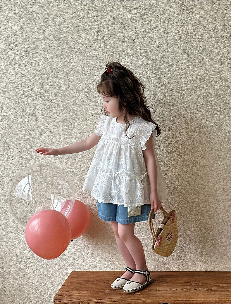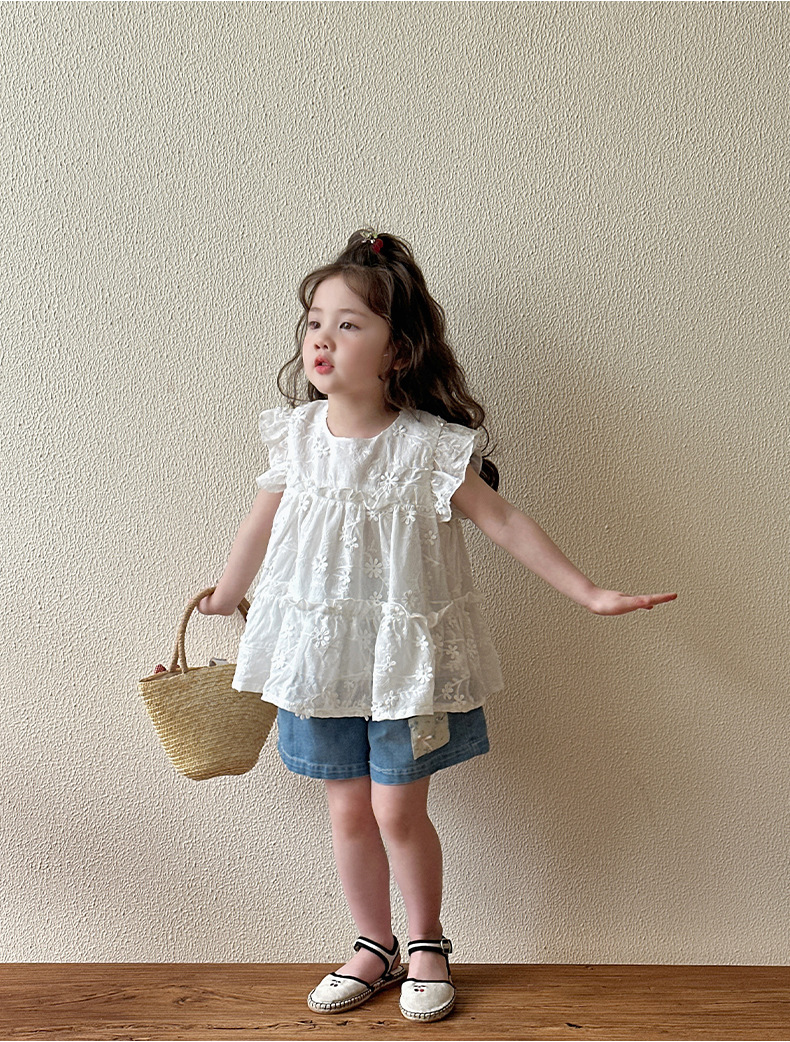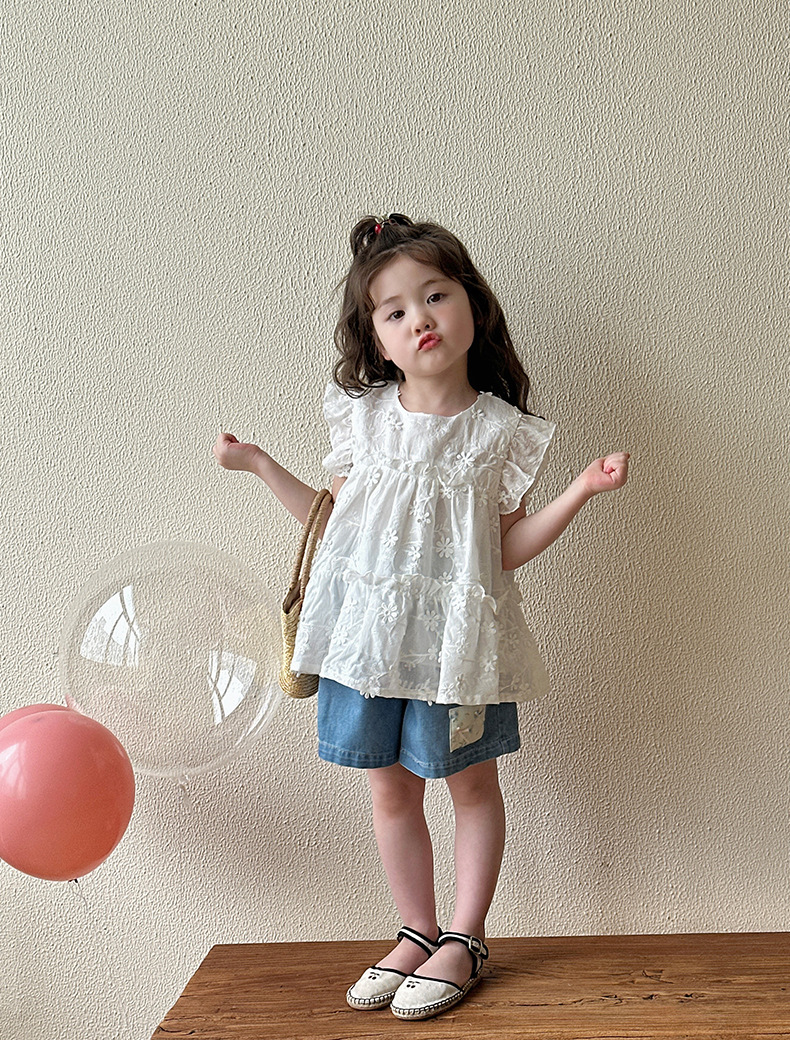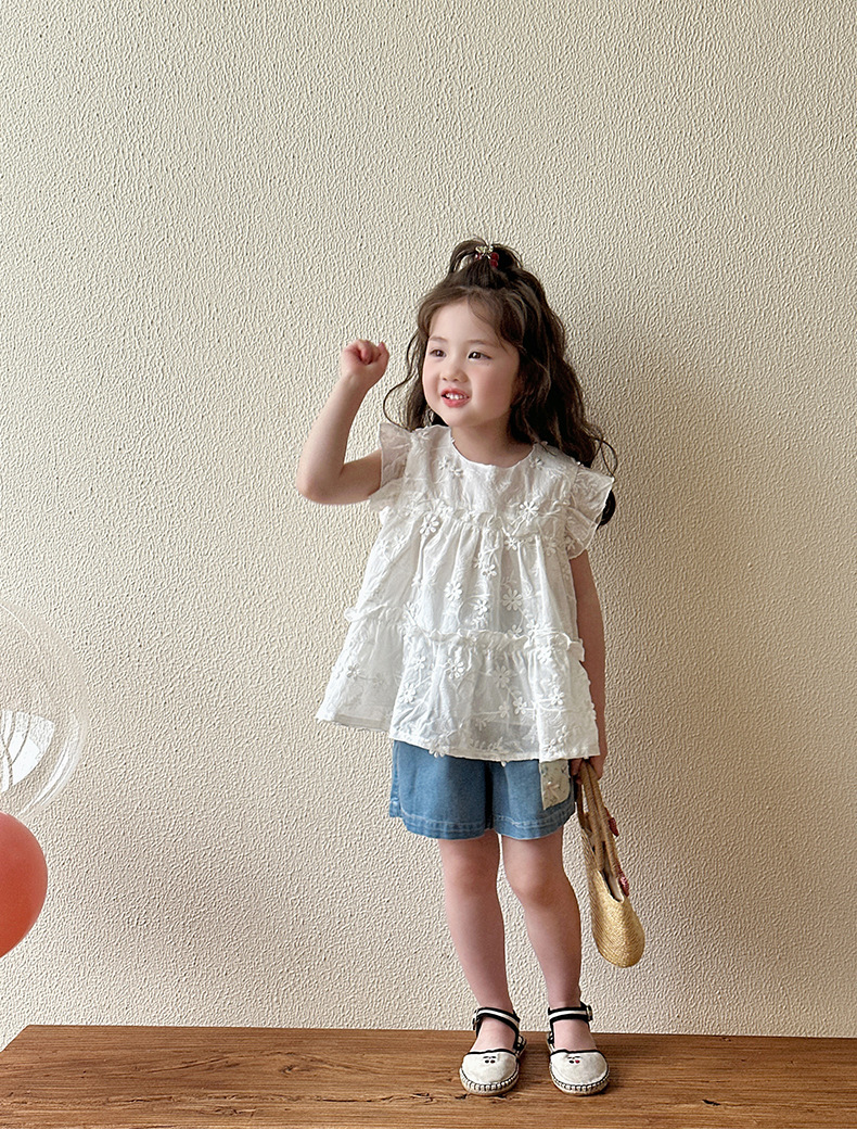 여자 여름 셔츠 2025 새로운 아이들 슬리브 탑 여름 달콤한 어린이 착용 아기 짧은 소매 인형 셔츠스토어 가기
