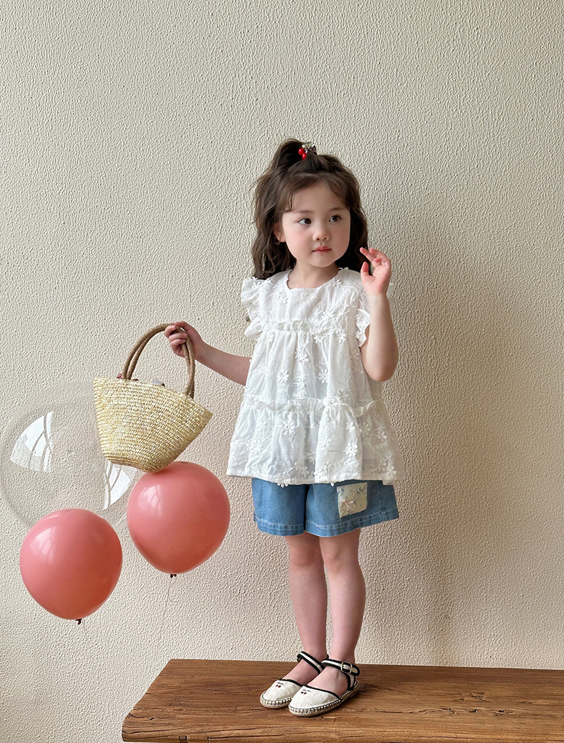 여자 여름 셔츠 2025 새로운 아이들 슬리브 탑 여름 달콤한 어린이 착용 아기 짧은 소매 인형 셔츠