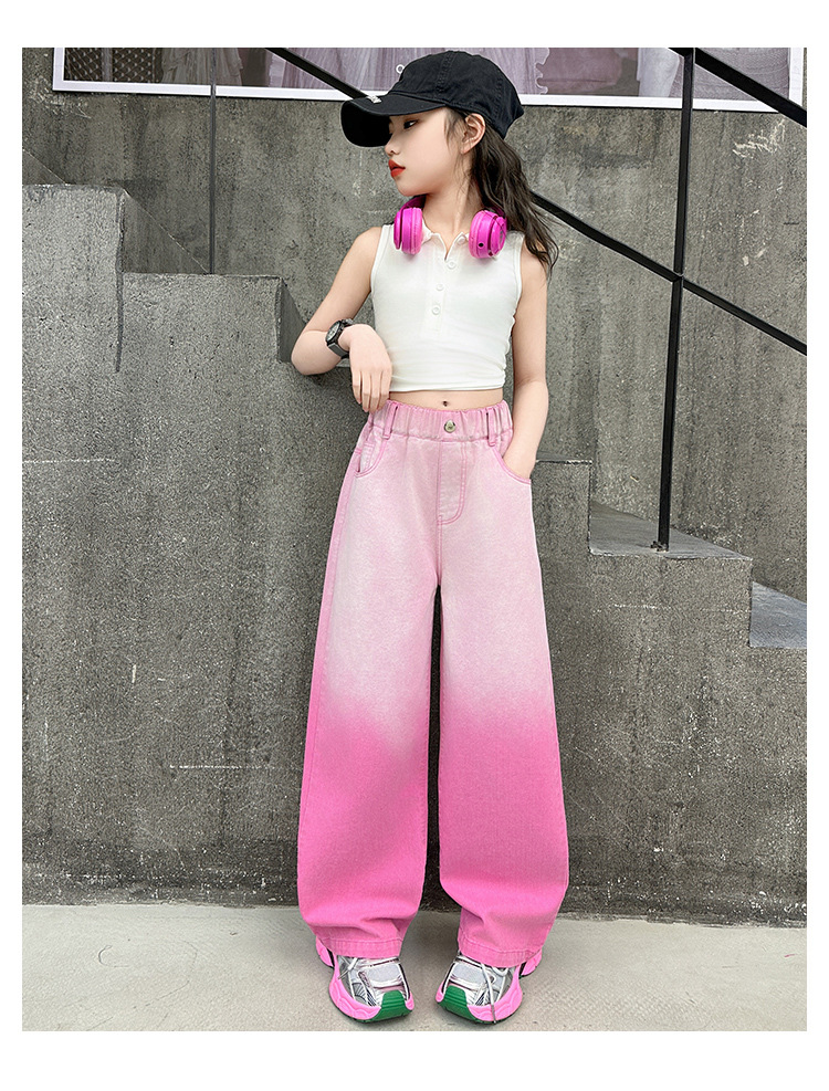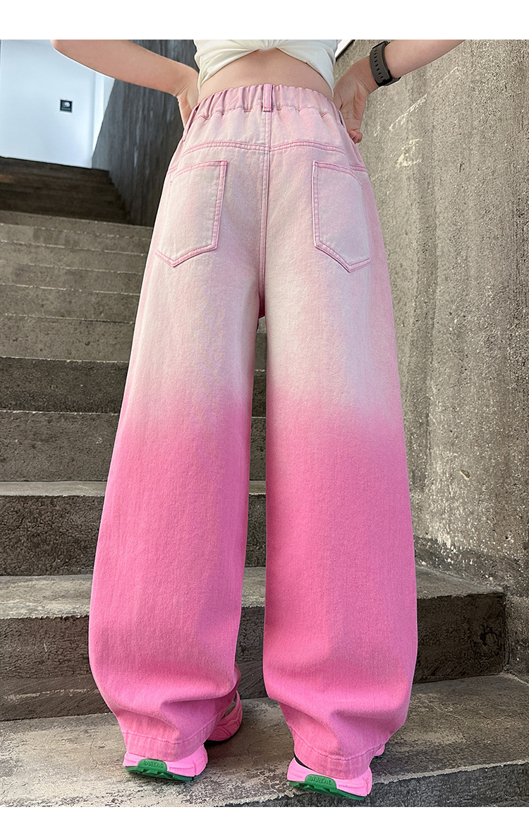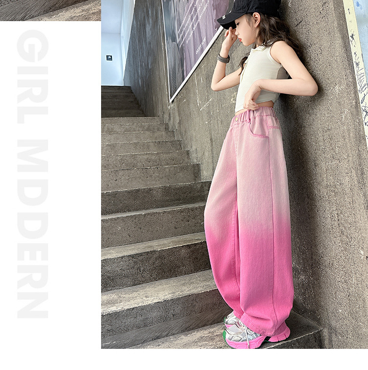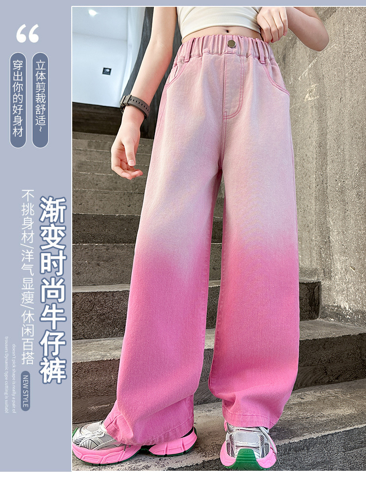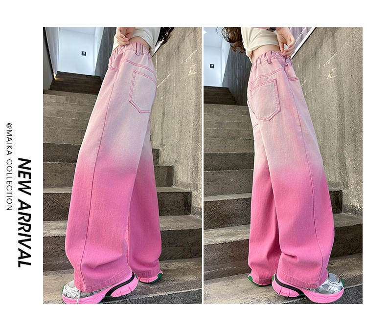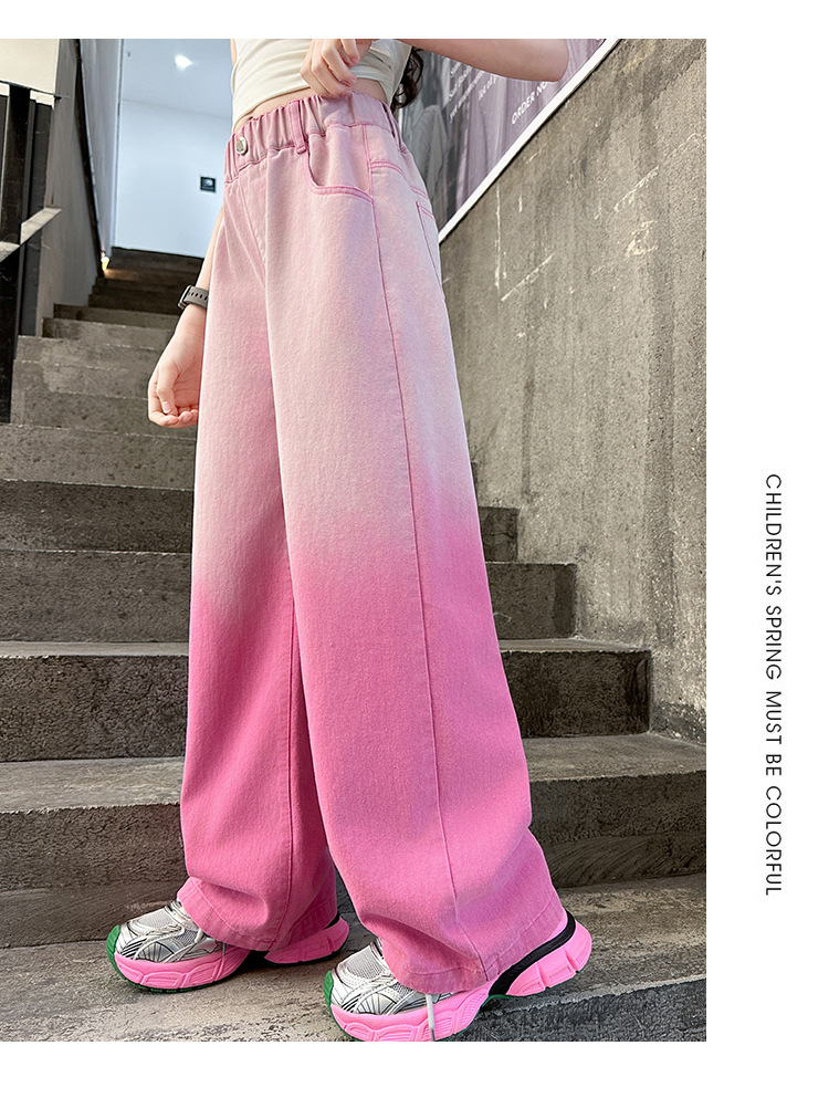 여자 봄 핑크 그라데이션 청바지 2025 새로운 어린이 와이드 레그 팬츠 여자 중학생 스트레이트 팬츠