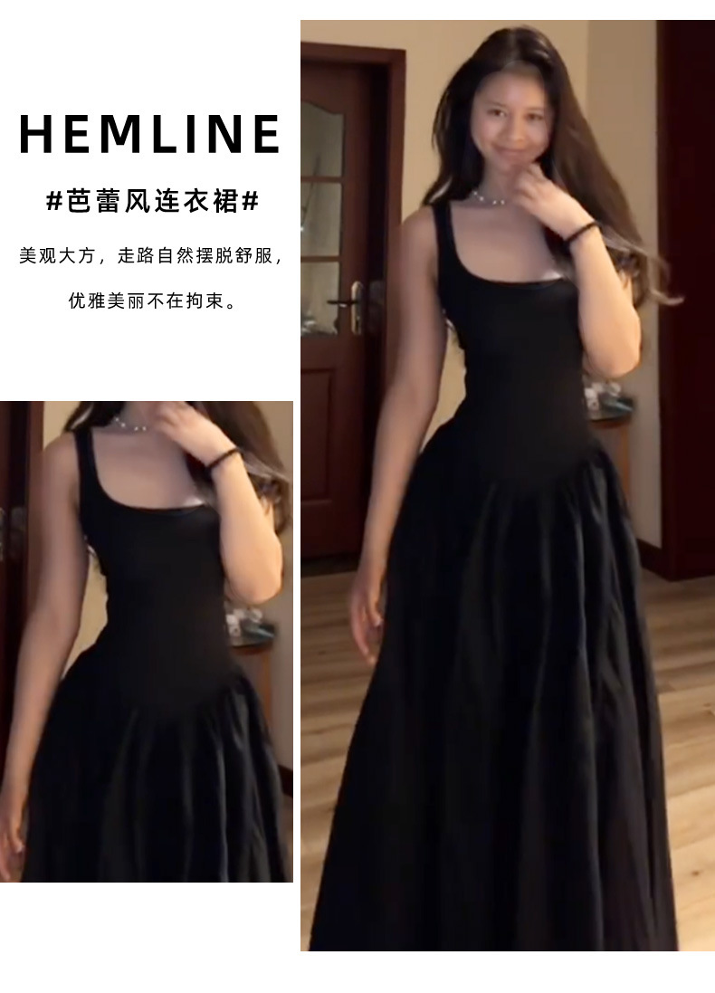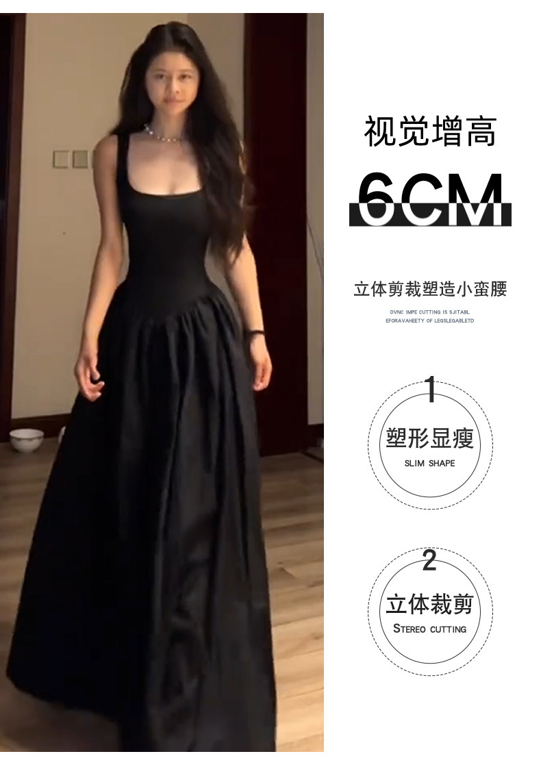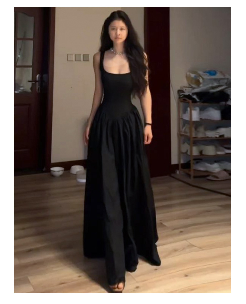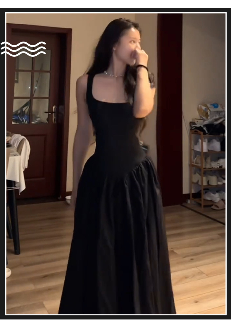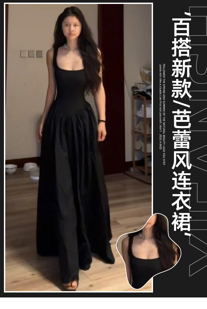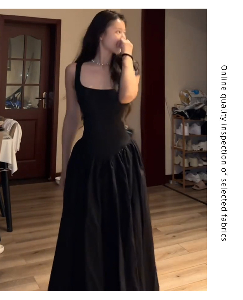 블랙 슬링 원피스 여자 2025 년 여름 새로운 타이트 허리 슬리밍 폰툰 원피스 헵번 스타일 프렌치 A-라인 롱 원피스스토어 가기