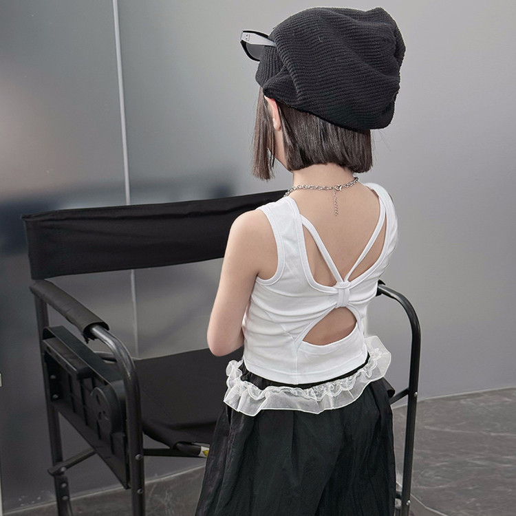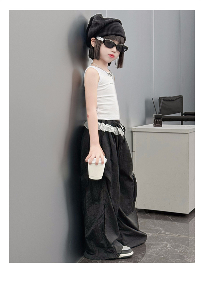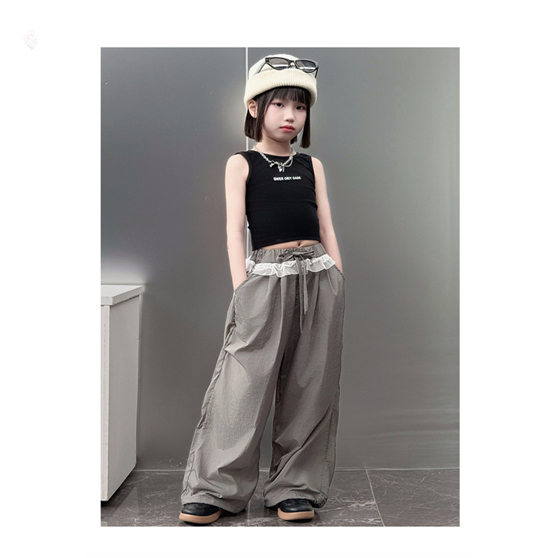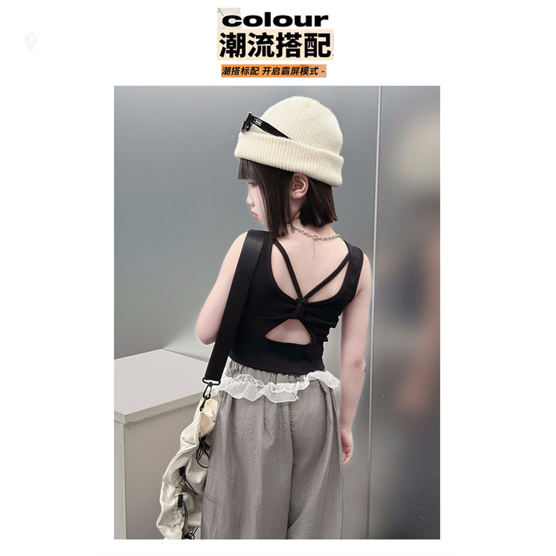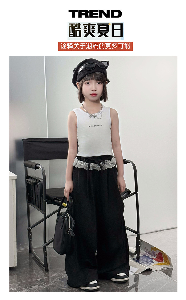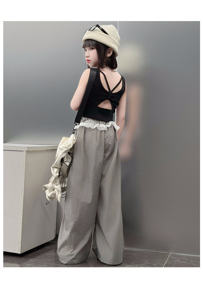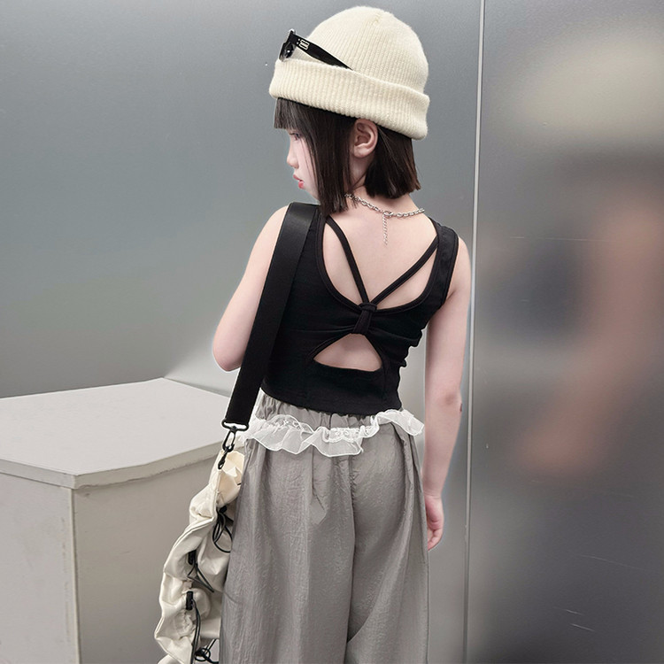 걸스 한국식 트렌디 백리스 조끼 세트 중 · 빅 키즈 2025 여름 새 민소매 티셔츠 레이스 와이드 레그 팬츠 씬