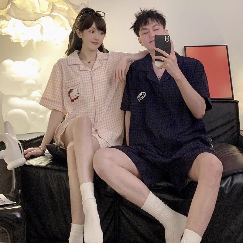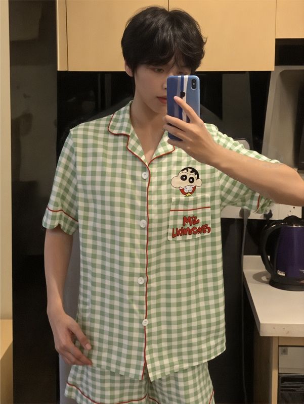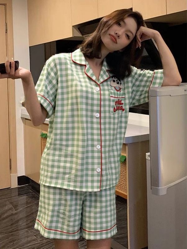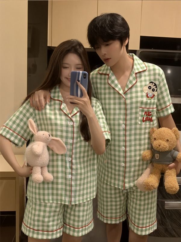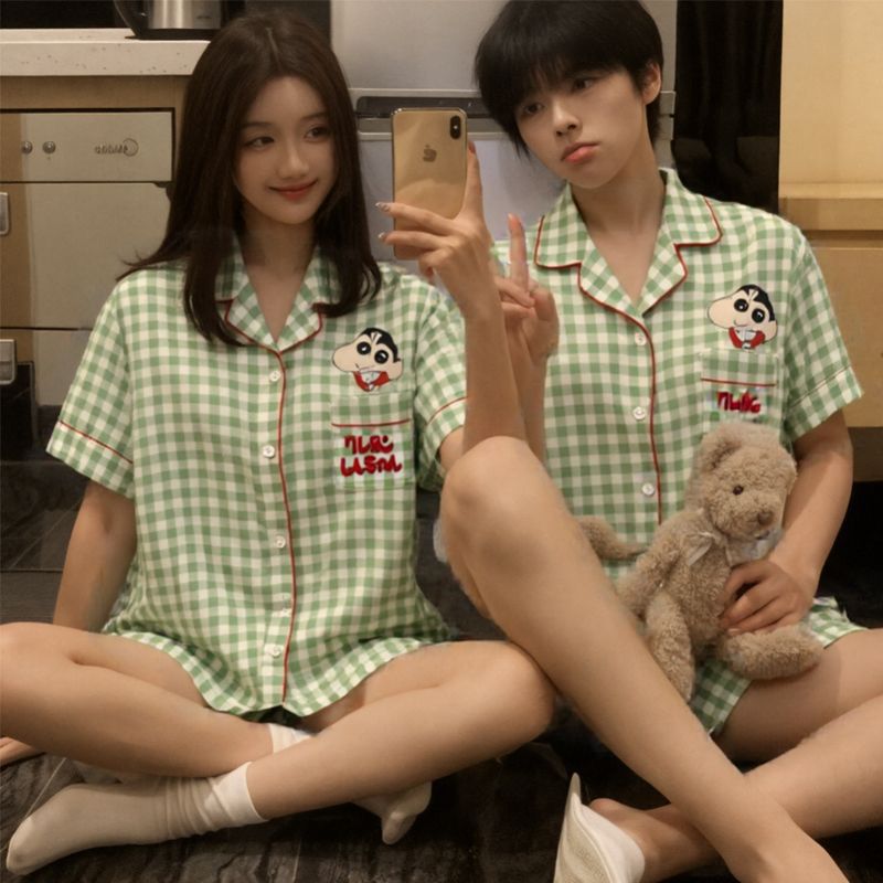 귀여운 크레용 작은 새로운 구름면 커플 잠옷 여름 반팔 반바지 한 남자 한 여자 만화 홈 의류 세트