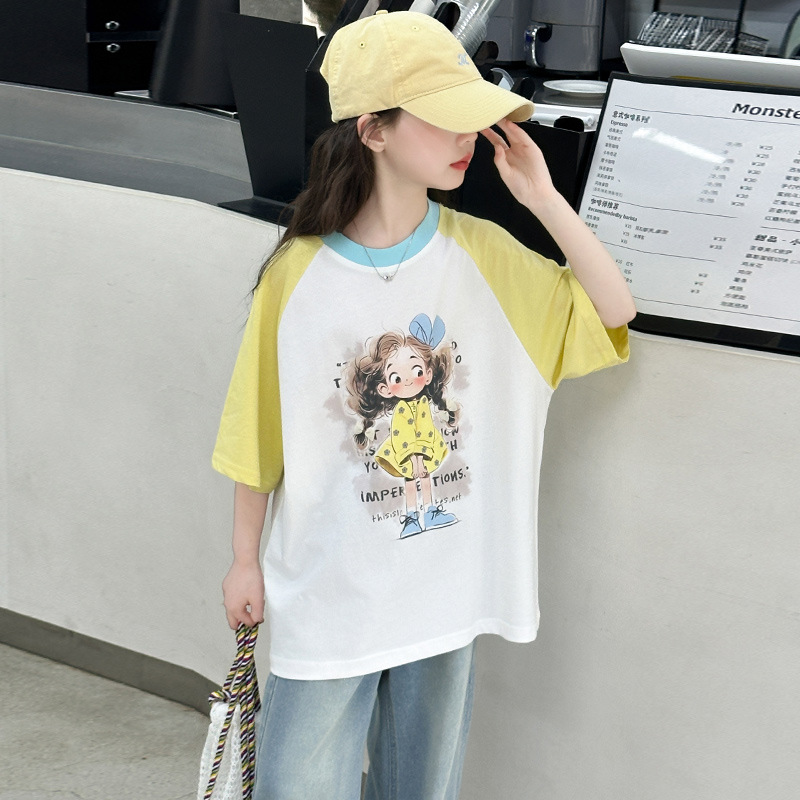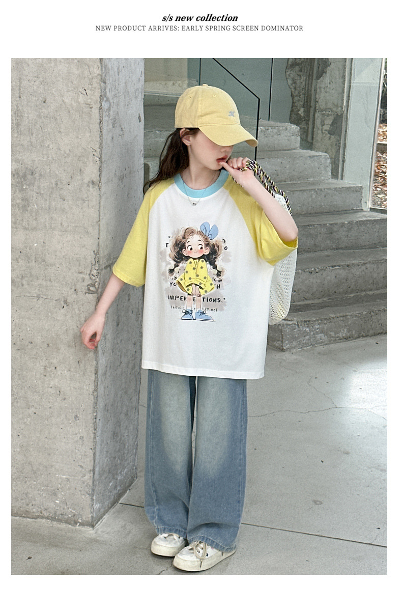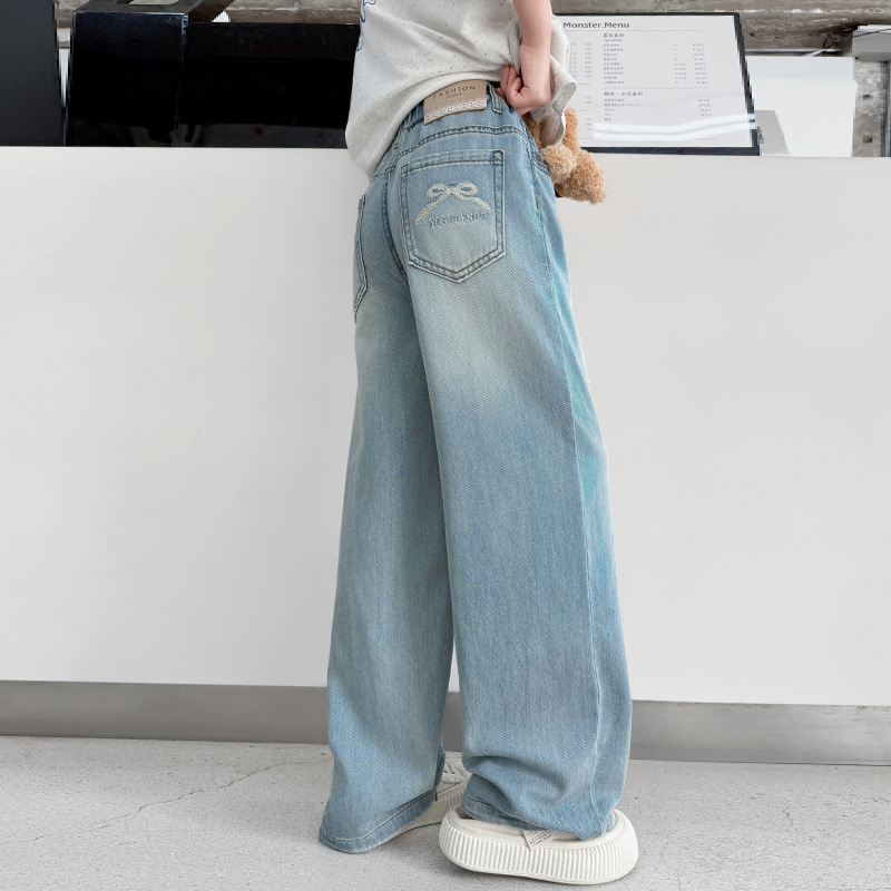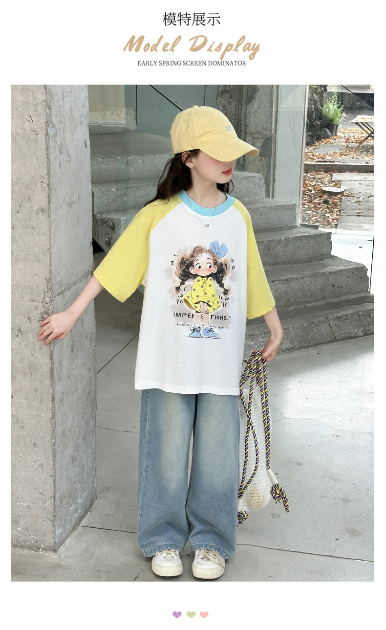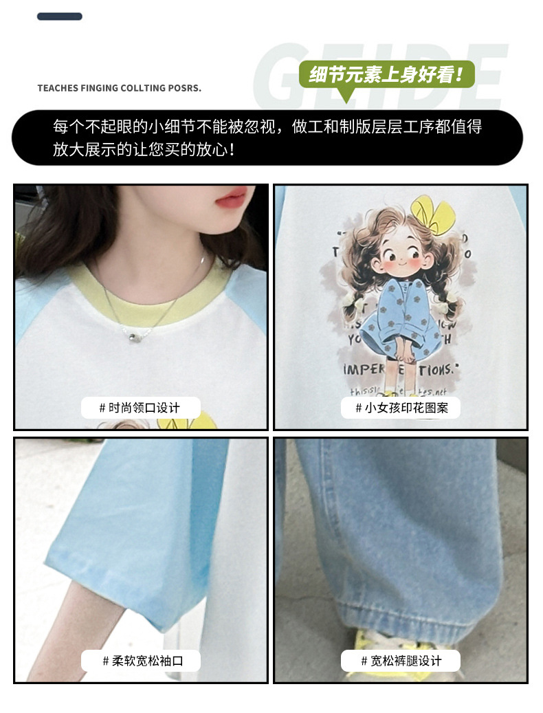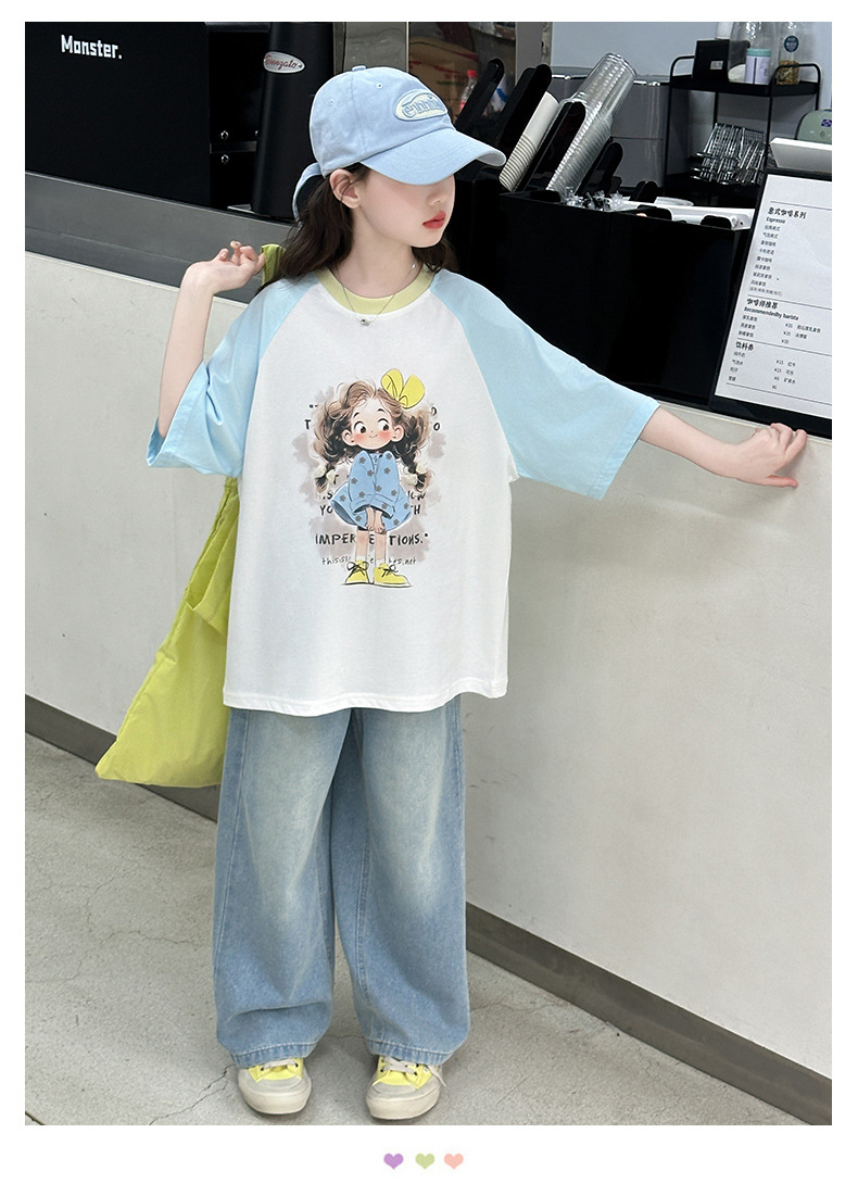 여자 여름 반팔 티셔츠 청바지 세트 2025 새로운 어린이 여름 원피스 서양식 넓은 다리 트렌디 T스토어 가기