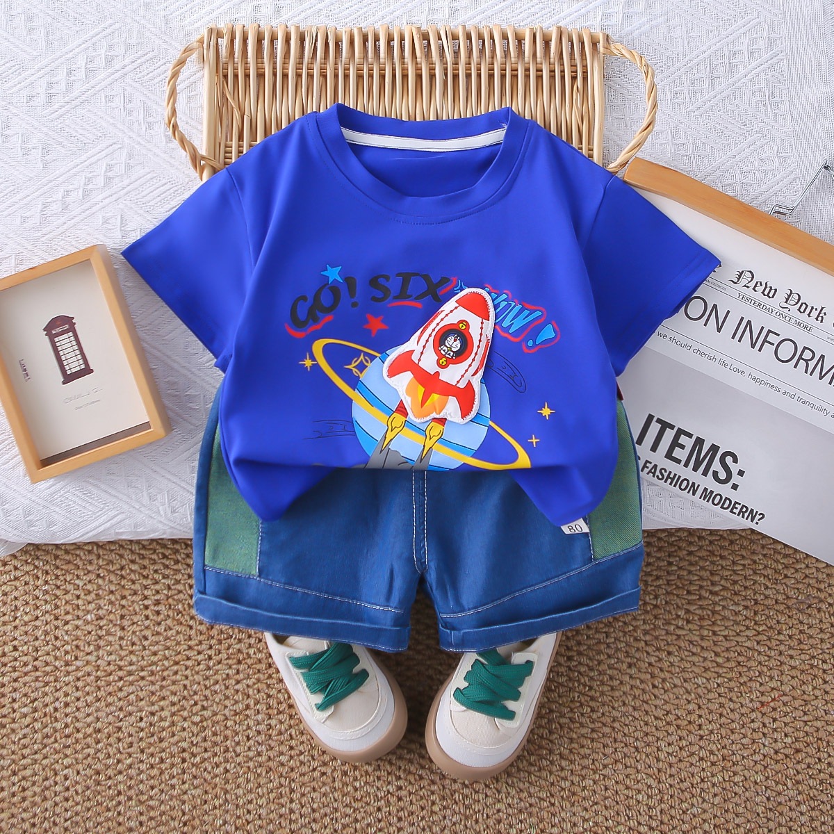 2025 여름 새 소년 만화 크루 넥 반팔 세트 소년 캐주얼 데님 반바지 2 피스 세트스토어 가기