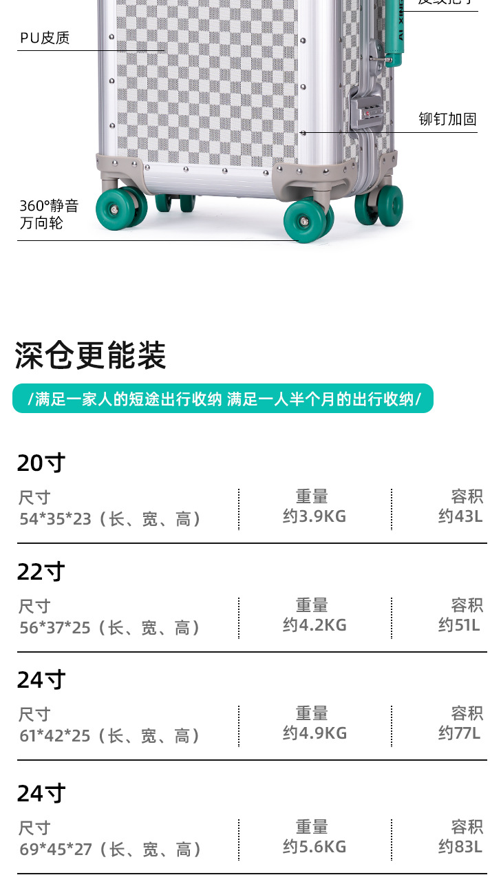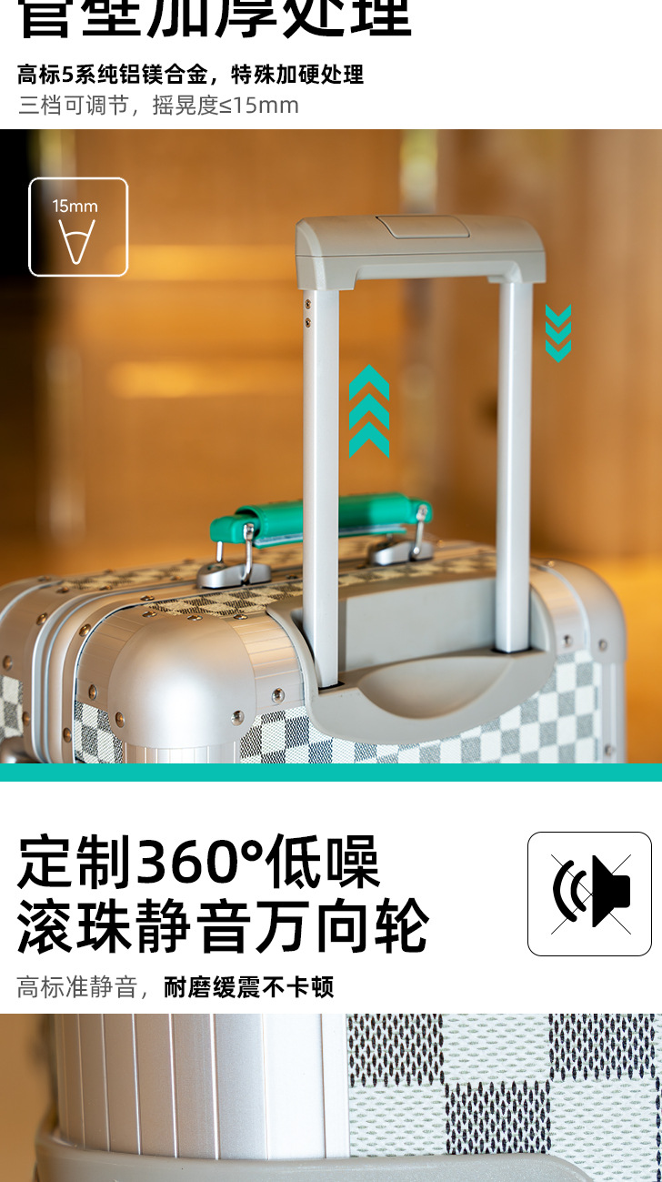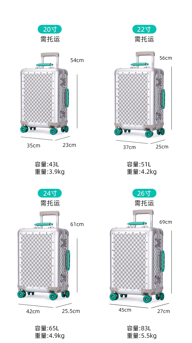 모든 알루미늄 마그네슘 합금 수하물 20 인치 탑승 상자 여행 26 대용량 수하물 바둑판 금속 하드