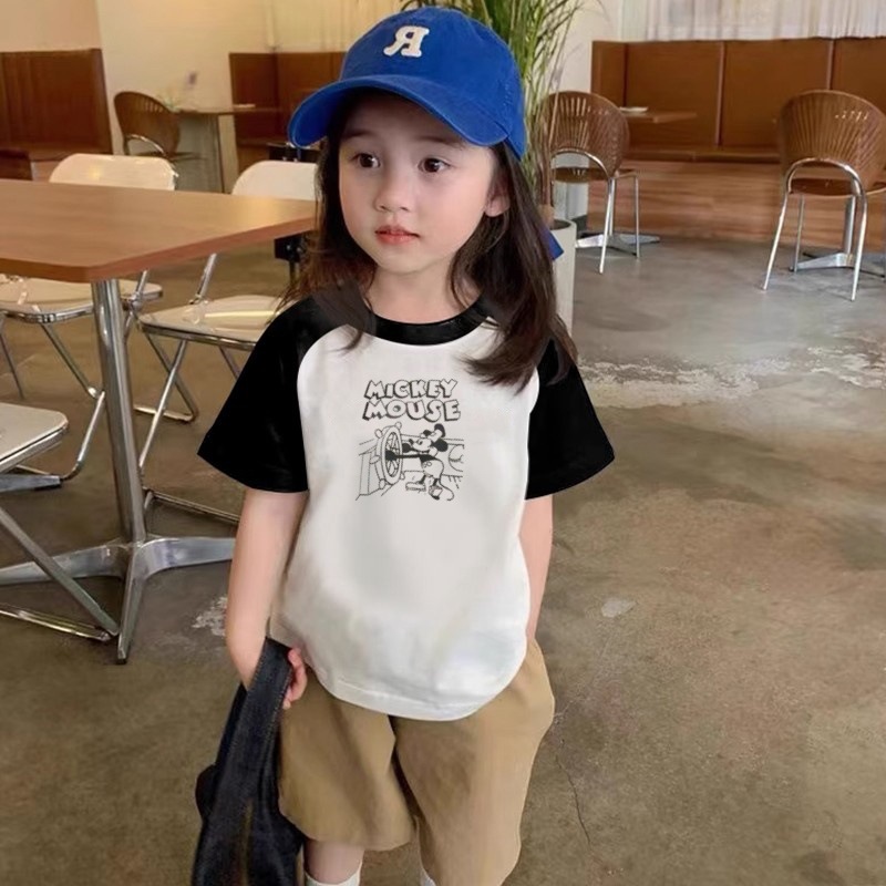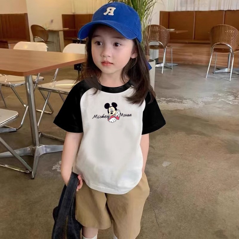 남자와 여자를위한 코튼 반팔 티셔츠 2025 여름 새로운 어린이 미키 마우스 탑 대비 컬러 얇은 기본 셔츠스토어 가기