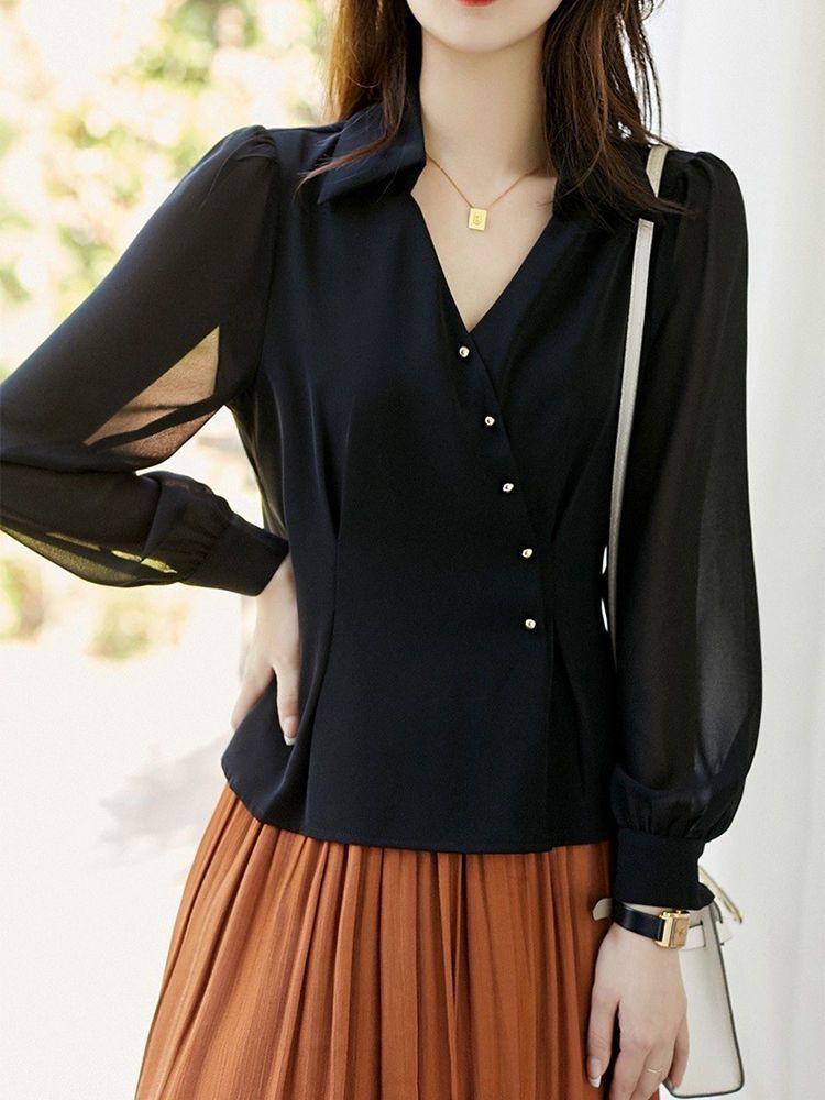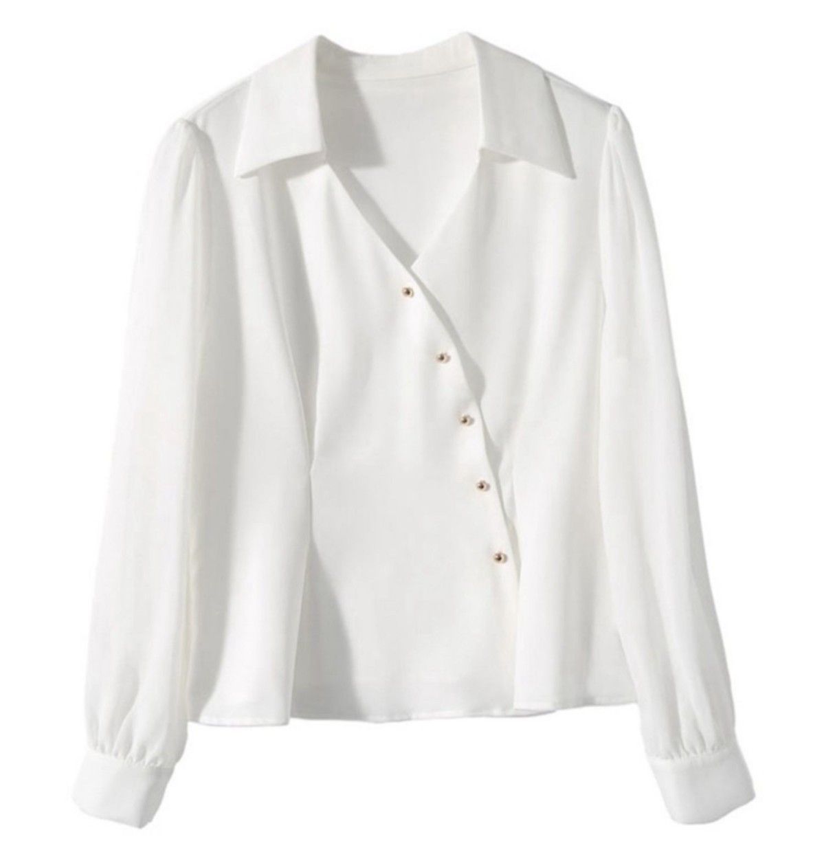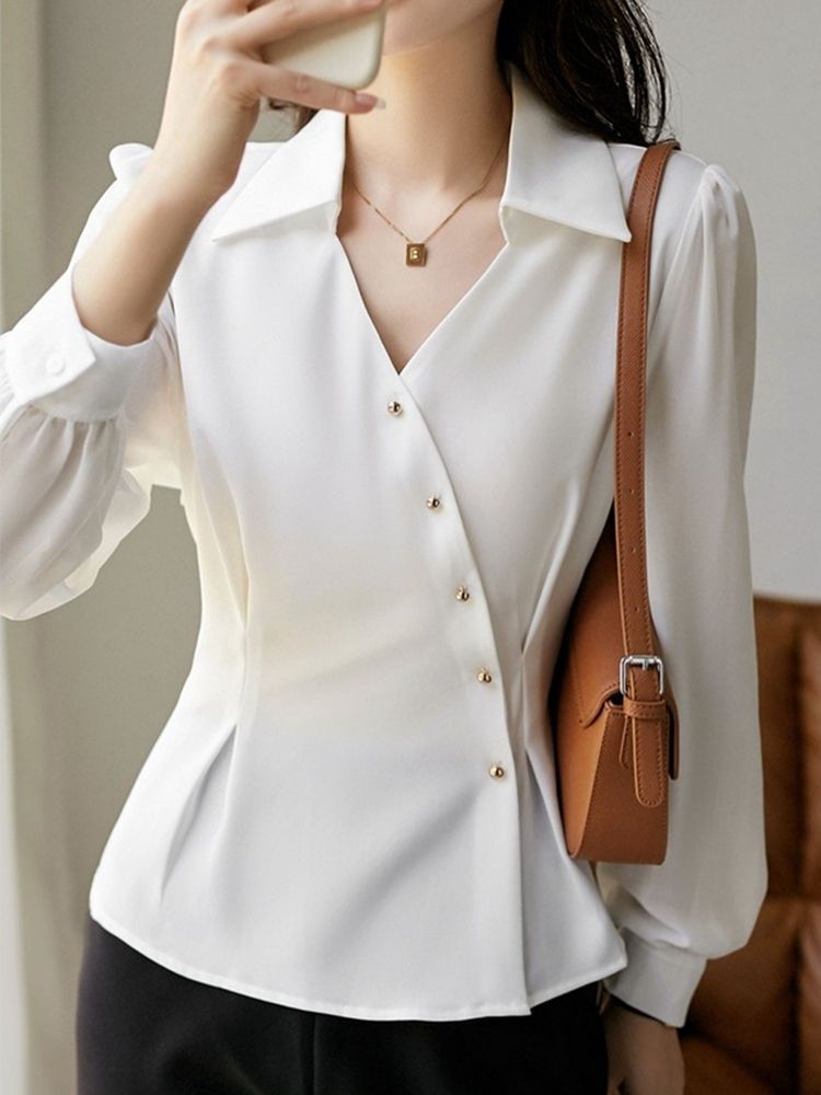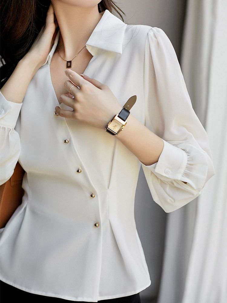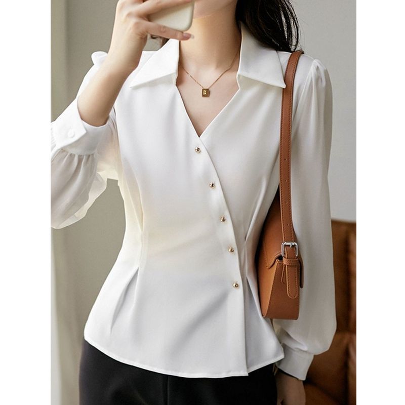 2025 가을 새 스타일 우아한 V 자형 옷깃 틈새 디자인 센스 비스듬한 플래켓 버클 타이트 허리 디자인 셔츠