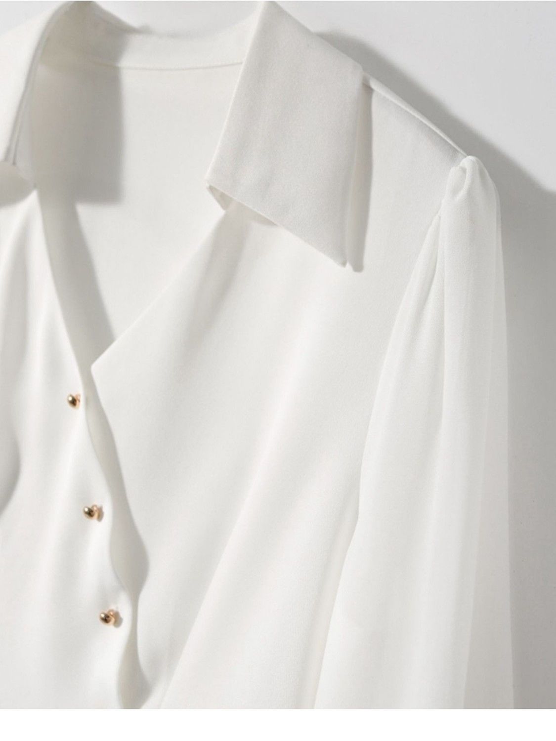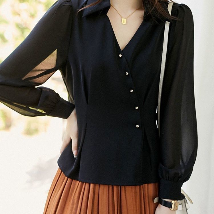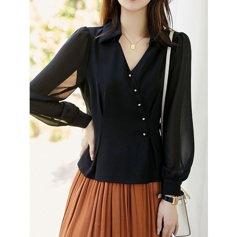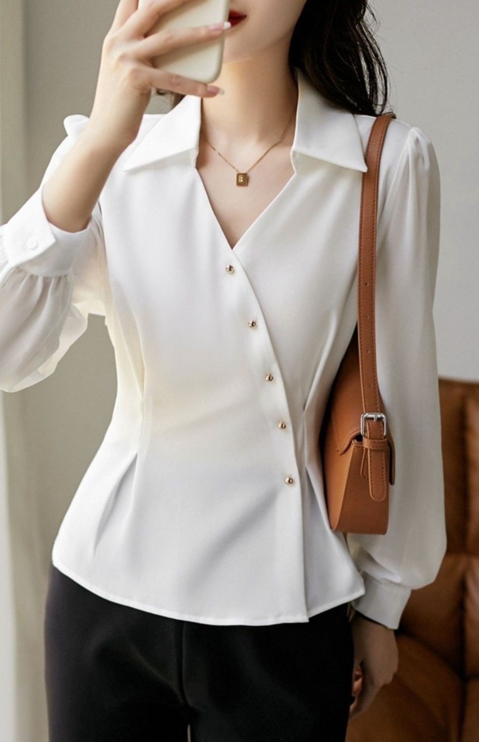2025 가을 새 스타일 우아한 V 자형 옷깃 틈새 디자인 센스 비스듬한 플래켓 버클 타이트 허리 디자인 셔츠스토어 가기