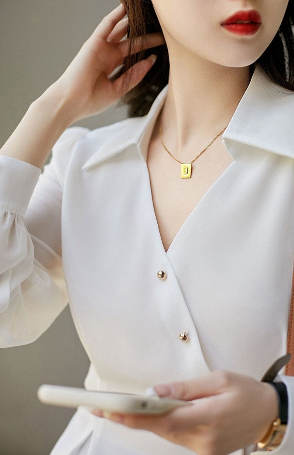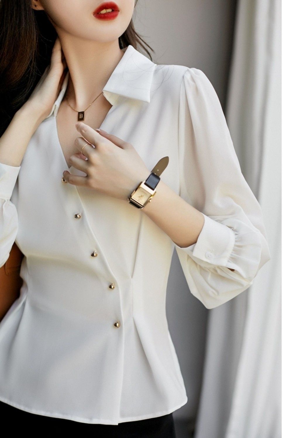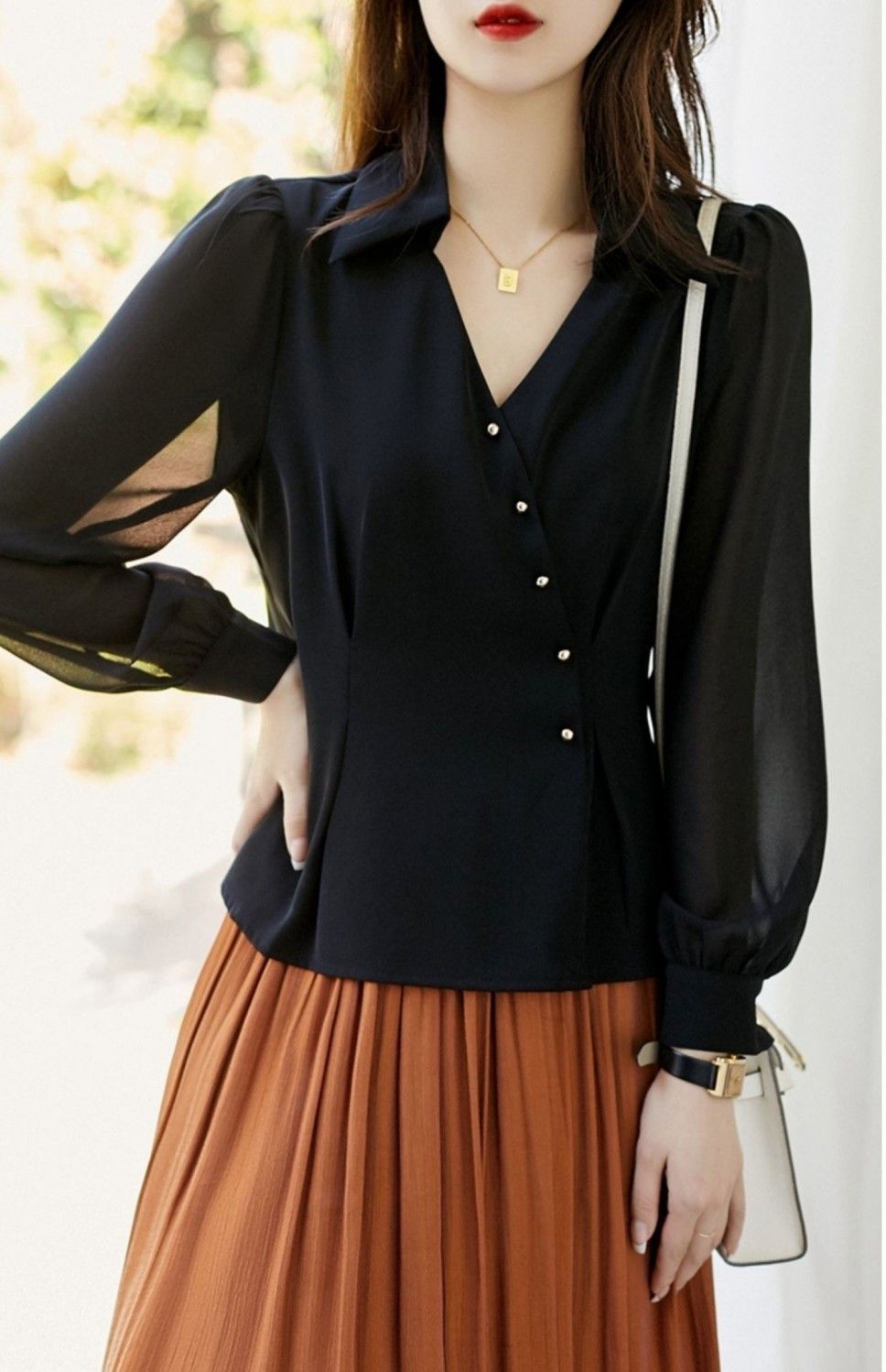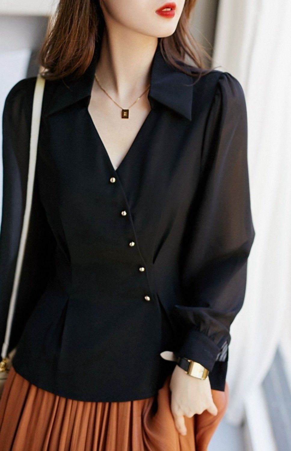 2025 가을 새 스타일 우아한 V 자형 옷깃 틈새 디자인 센스 비스듬한 플래켓 버클 타이트 허리 디자인 셔츠스토어 가기