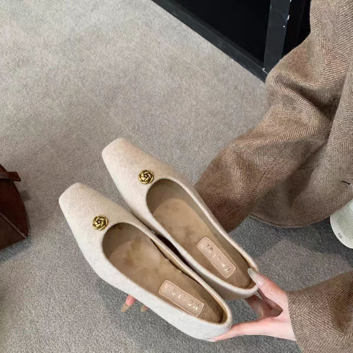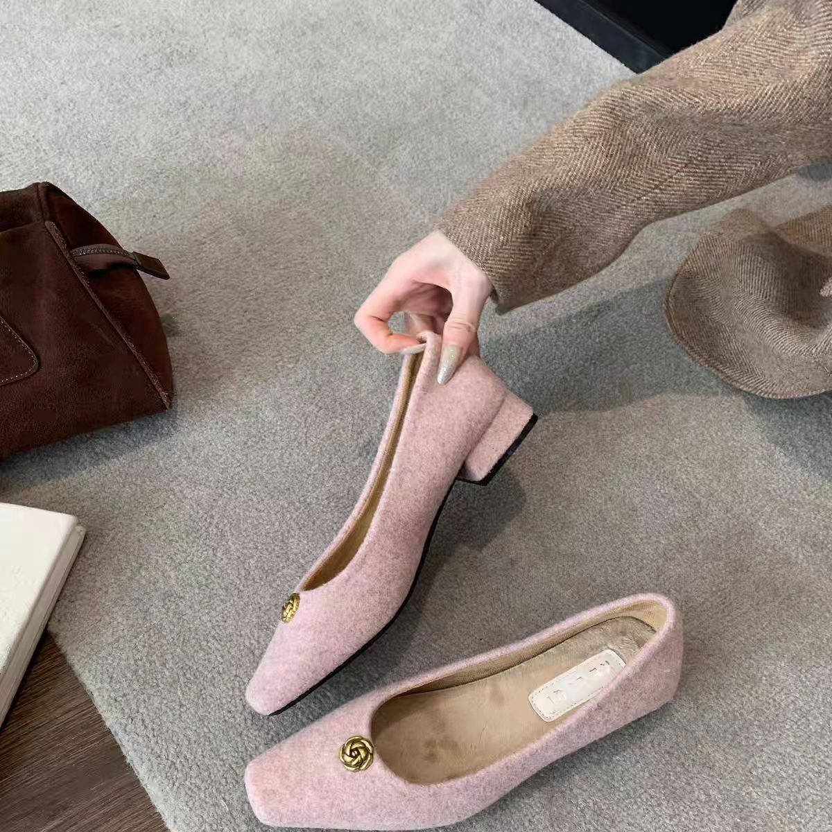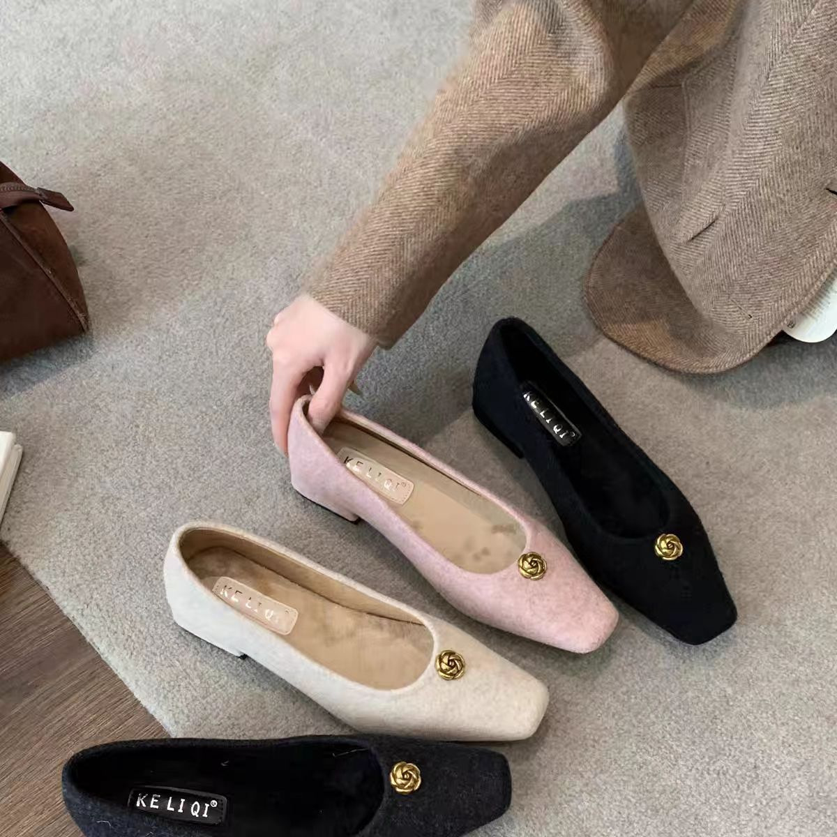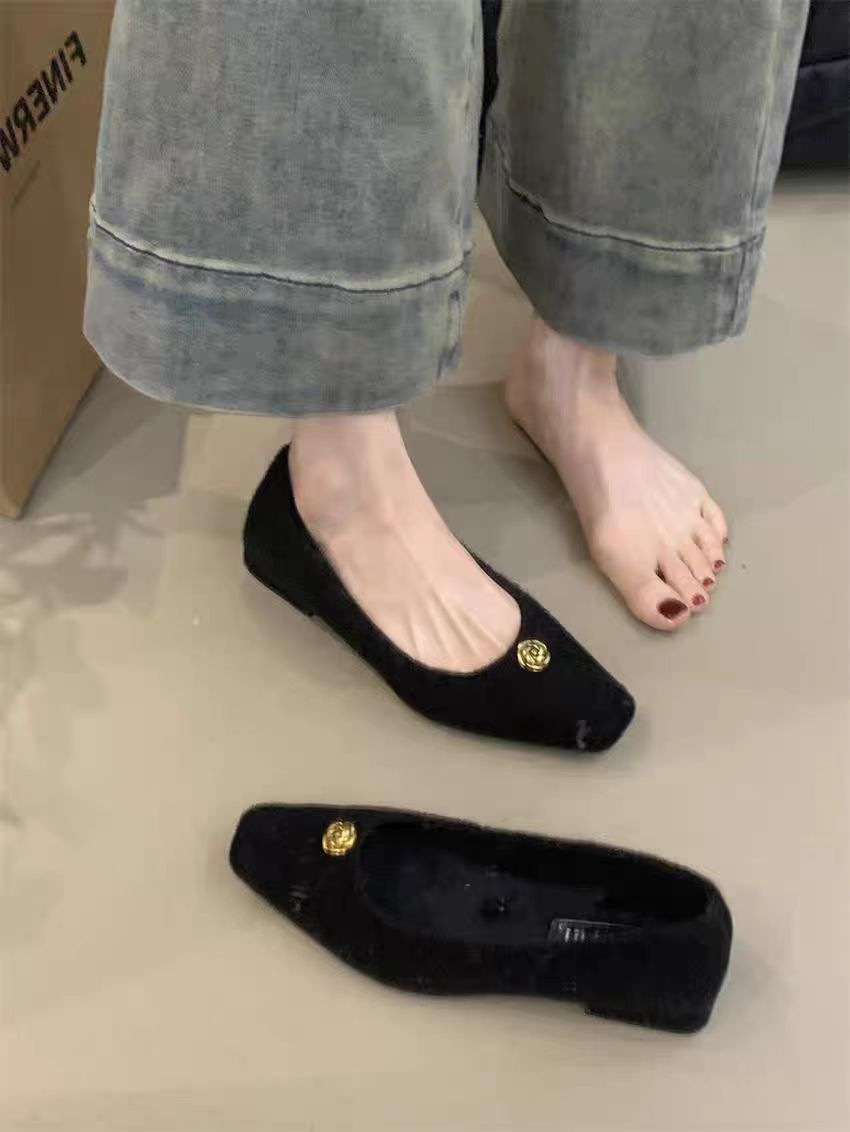 여성을위한 Xiaoxiangfeng 로우 힐 스퀘어 토 블랙 슈즈 2025 새로운 가을, 겨울 복고풍 부드러운 벨벳 통근 모피 신발