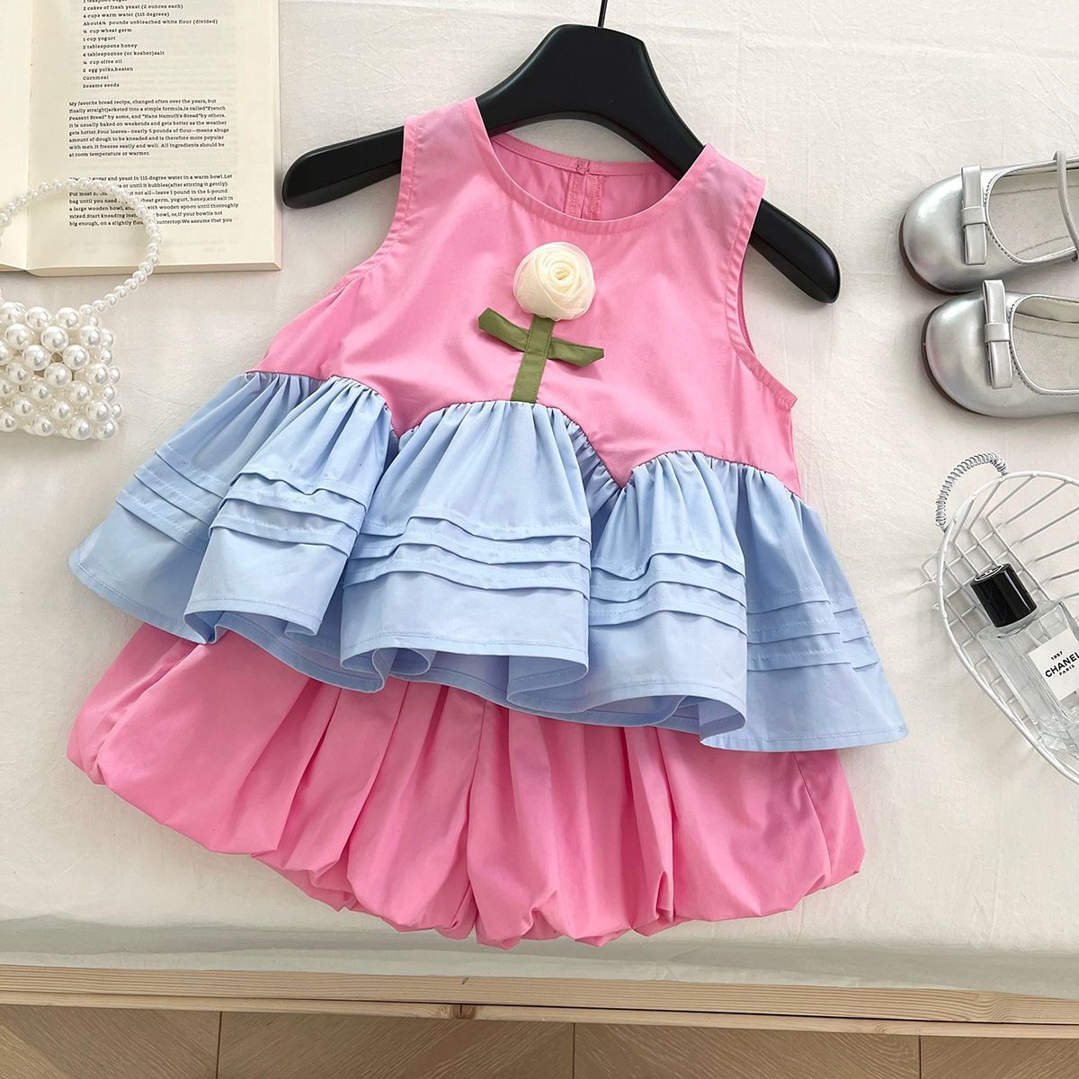 새로운 2025 꽃 소녀의 짧은 바지 세트 바느질 꽃 버드 유행 탑 여름 서양 스타일 민소매 트렌디 세트스토어 가기