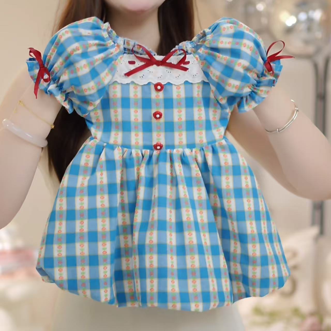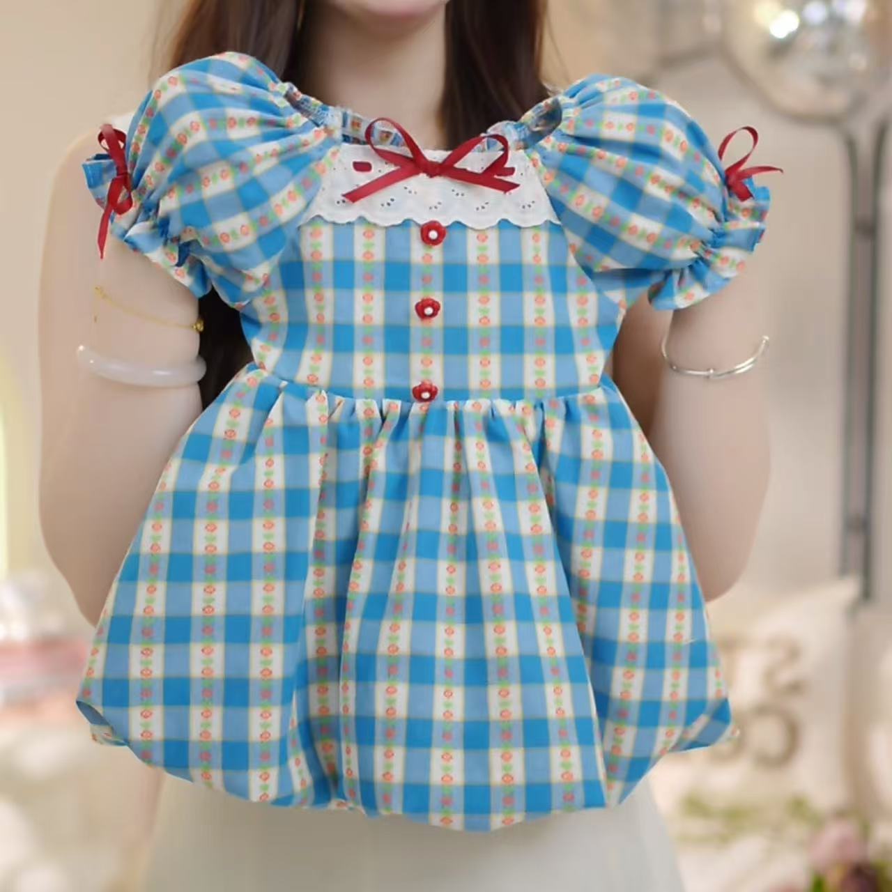 한국 걸스 여름 원피스 새로운 블루 체크 반팔 프랑스 유치원 어린이 꽃 버드 A 라인 스커트스토어 가기