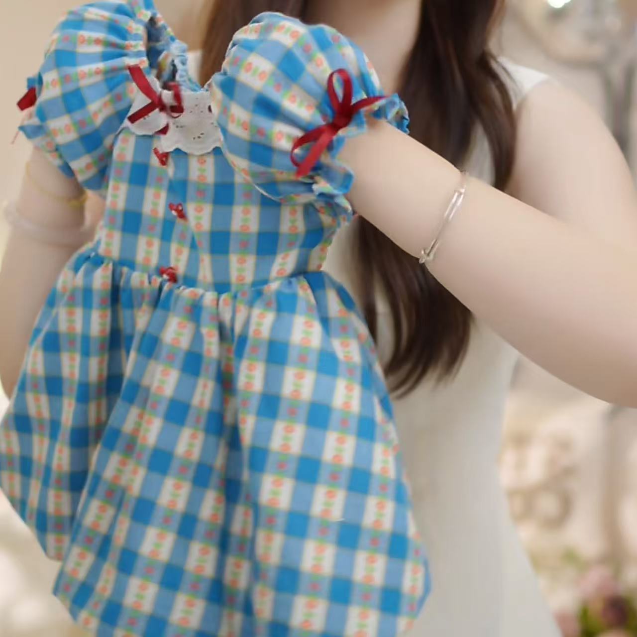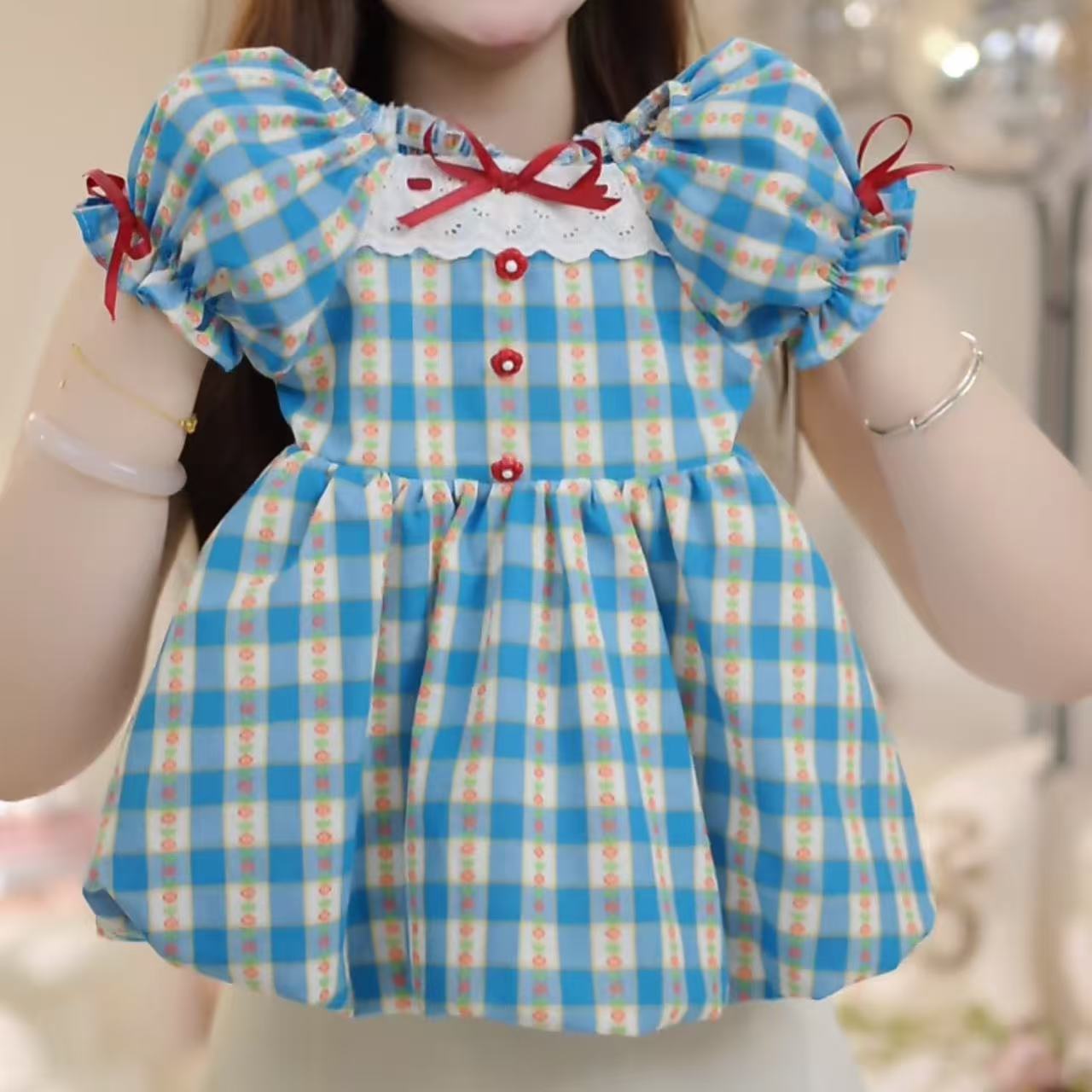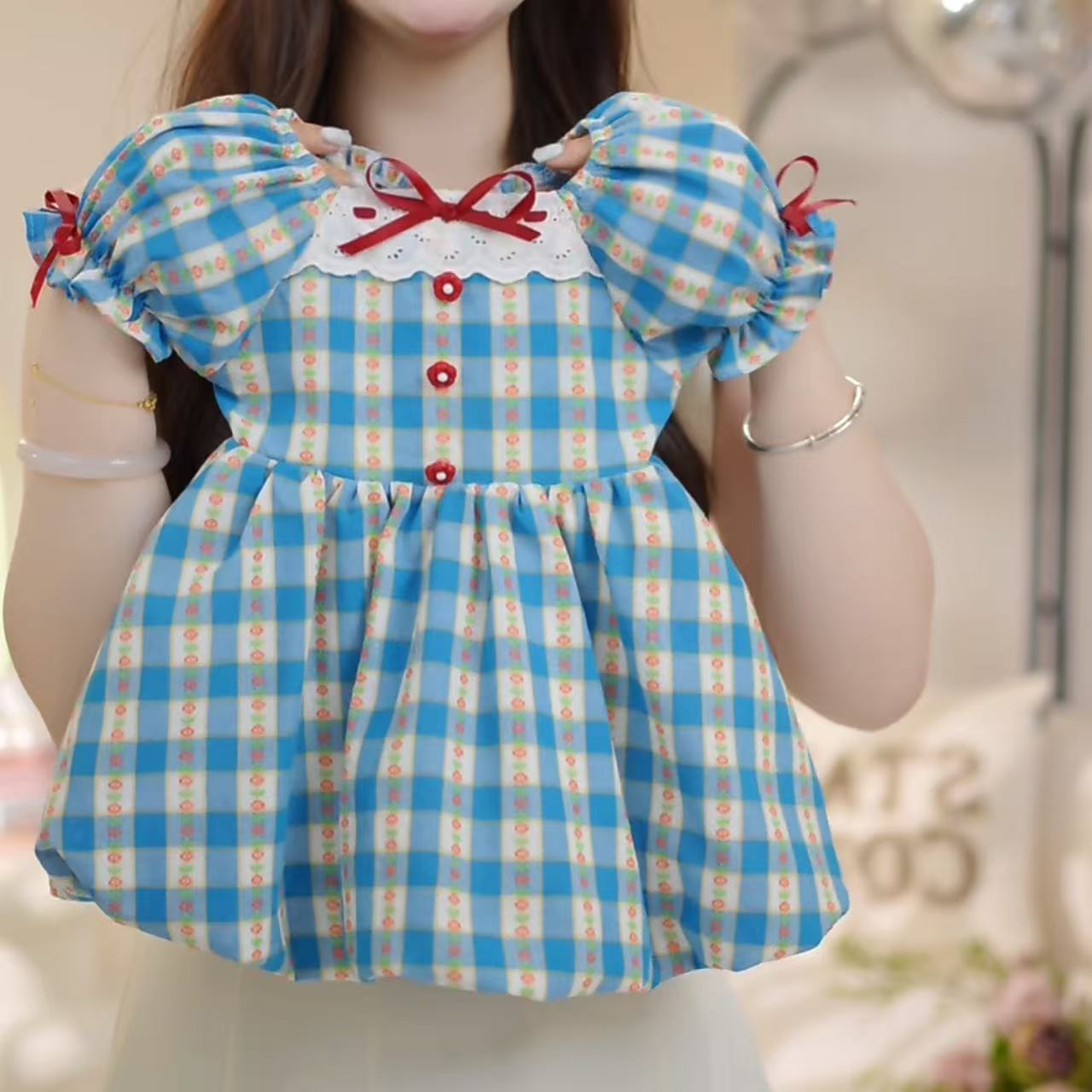 한국 걸스 여름 원피스 새로운 블루 체크 반팔 프랑스 유치원 어린이 꽃 버드 A 라인 스커트