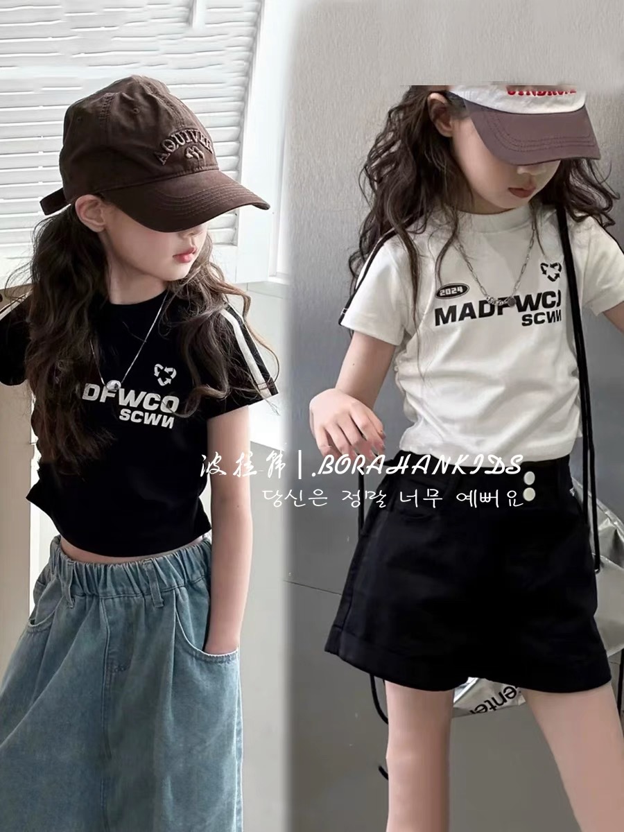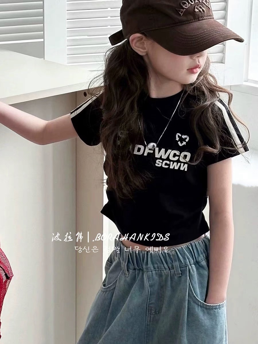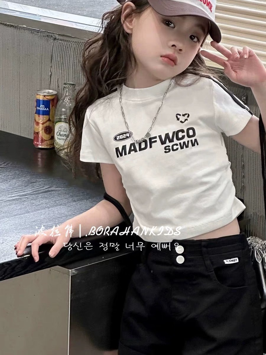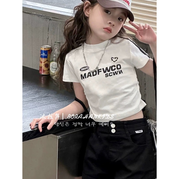 여아용 짧은 슬림핏 티셔츠 2025 여름 아동복 세련된 어린 소녀의 편지 반팔 중대형 아동용 유행상의스토어 가기