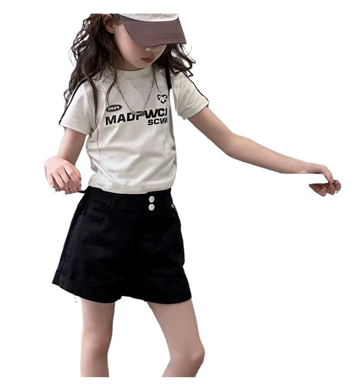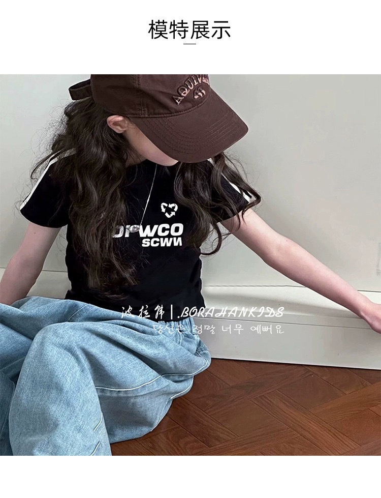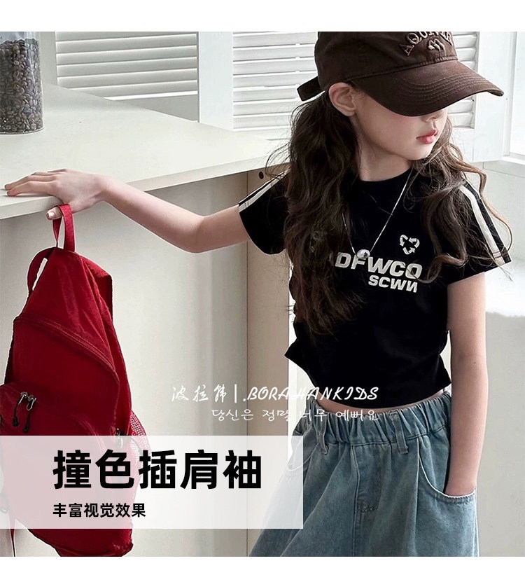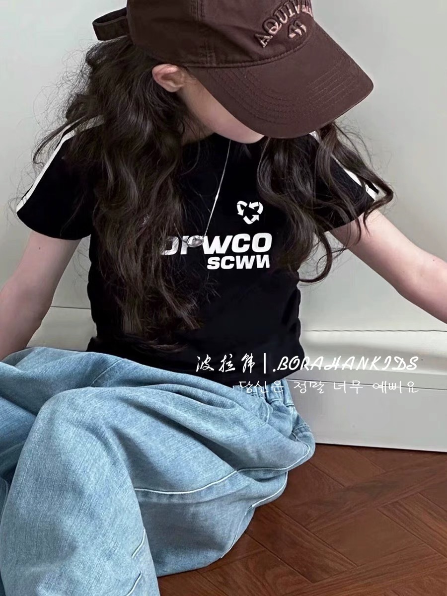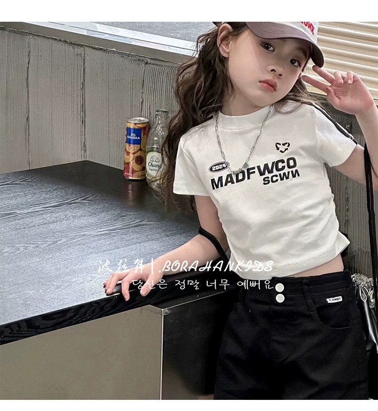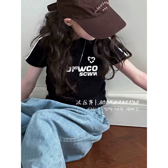 여아용 짧은 슬림핏 티셔츠 2025 여름 아동복 세련된 어린 소녀의 편지 반팔 중대형 아동용 유행상의스토어 가기