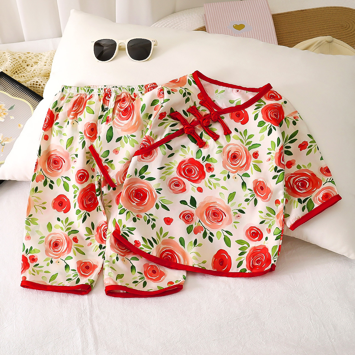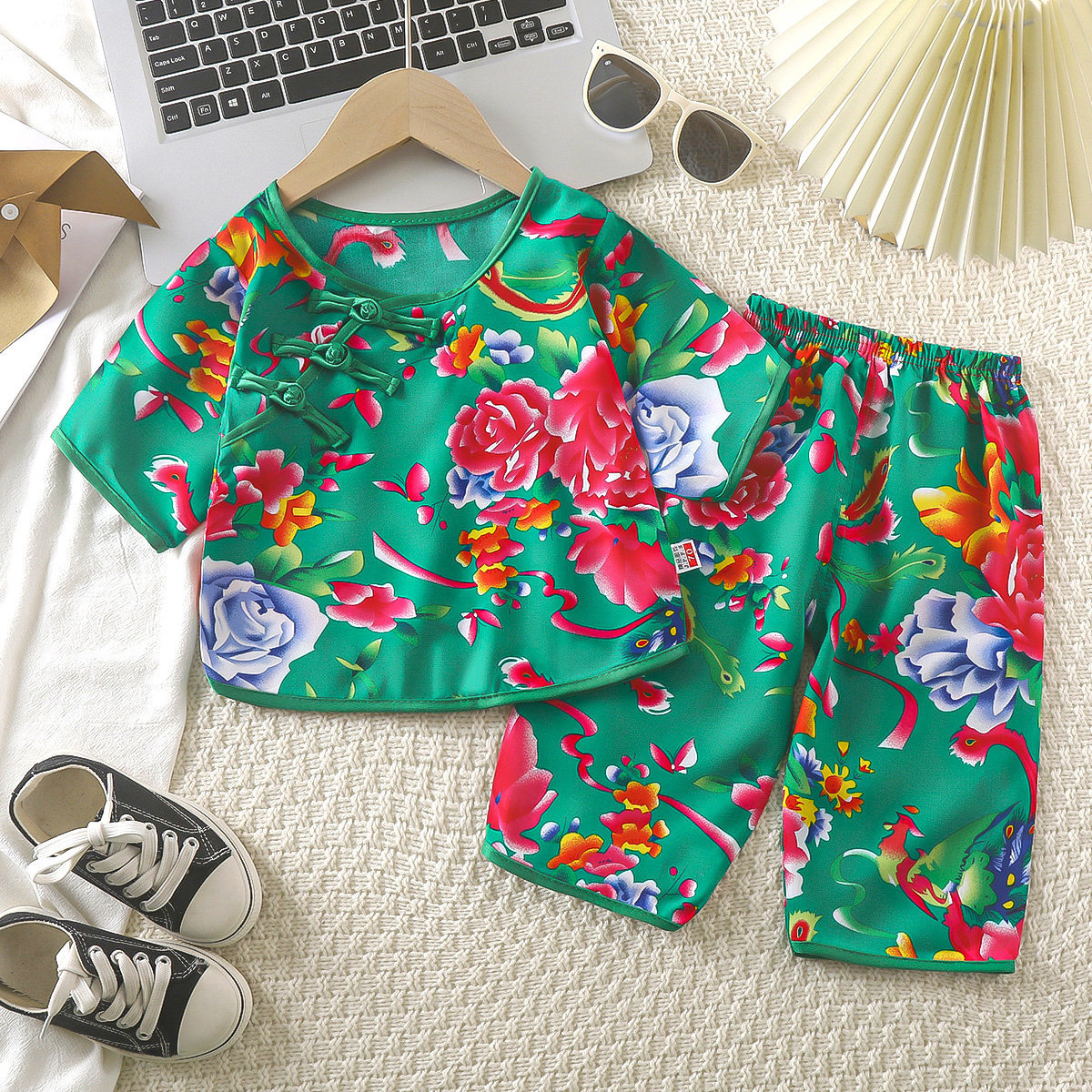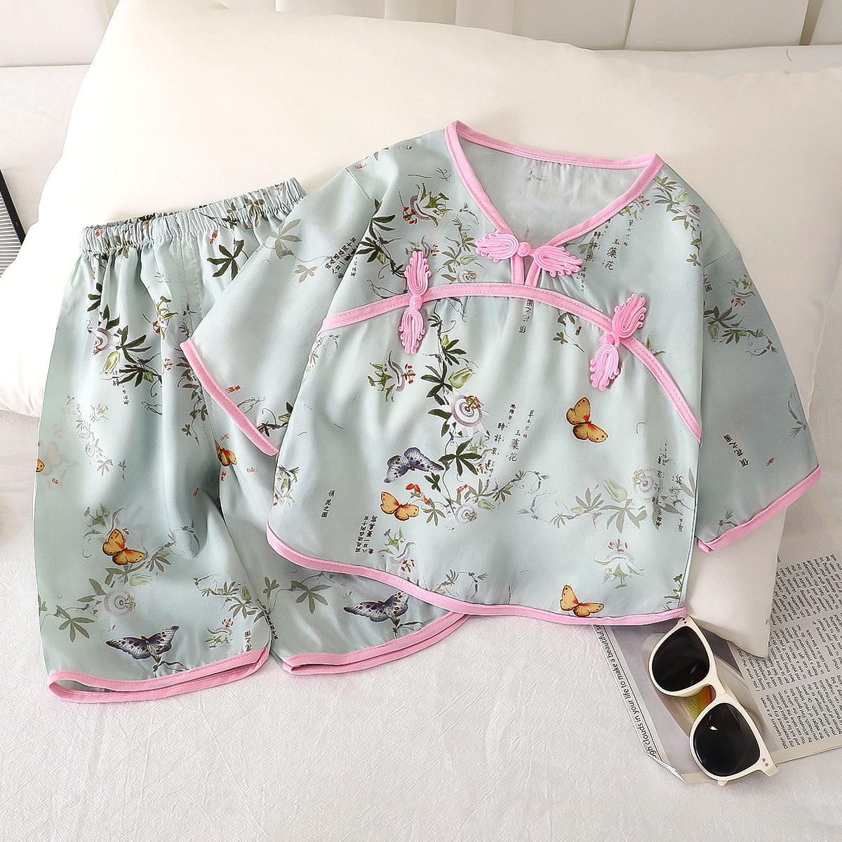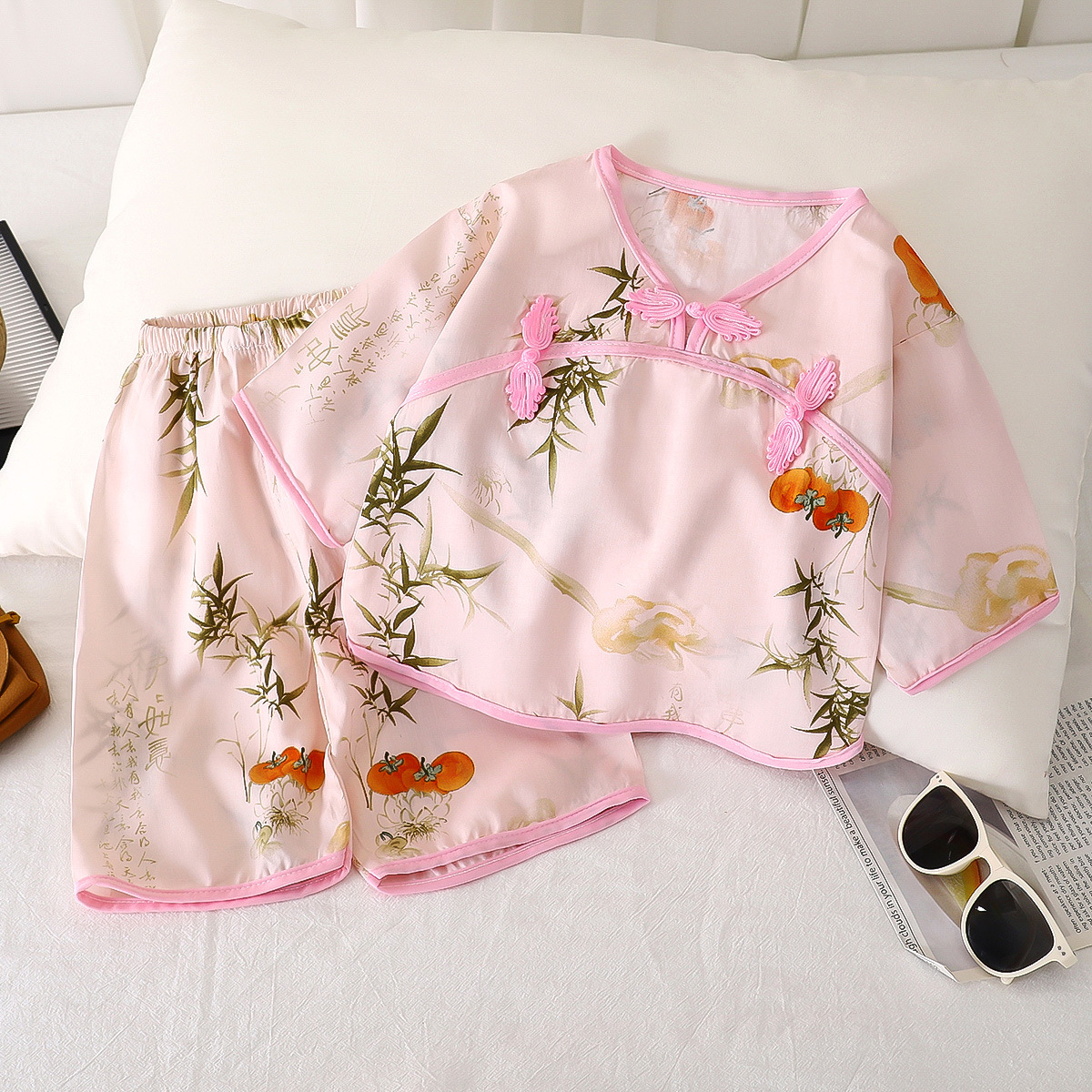 버클 민족 스타일 카프리 바지 면 실크 어린이 의류 여름 새로운 한푸 얇은 홈 의류 인공 면화 어린이 세트