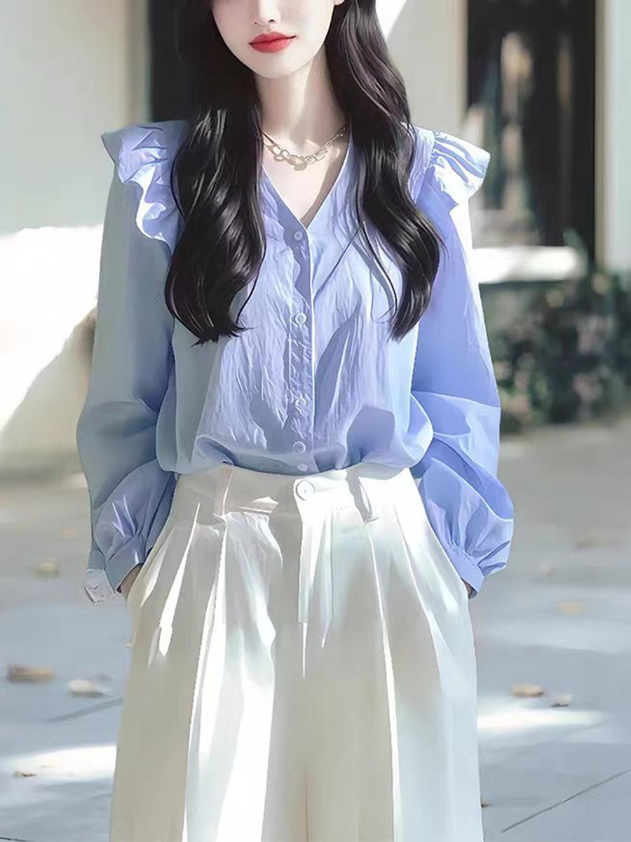 올해 인기있는 아름다운 작은 셔츠 가벼운 고급 고급 프랑스 틈새 아름다운 푸른 긴 소매 셔츠 여성의 새로운 가을