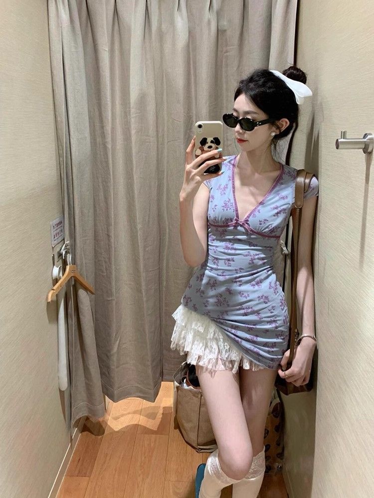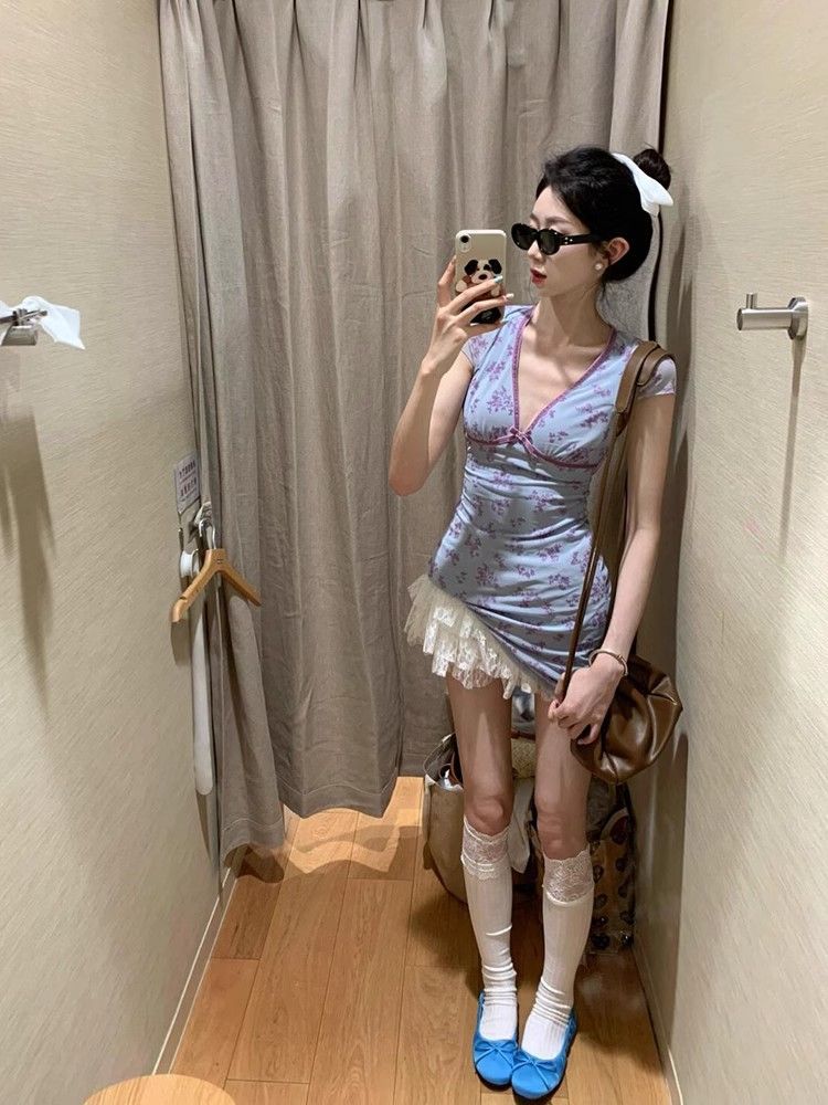 순수한 욕망 스타일 Instagram 스타일 스커트 여성의 여름 분위기 감각 작은 비행 소매 V-Neck 허리 A-라인 짧은 활 꽃 원피스스토어 가기