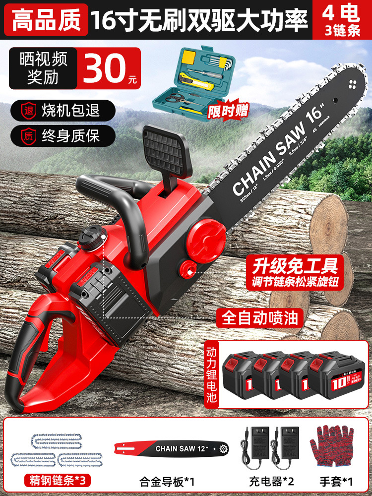 • 16inch 브러시리스 듀얼 드라이브 고출력 [15노트 배터리 수명 킹] 배터리 4개, 체인 3개