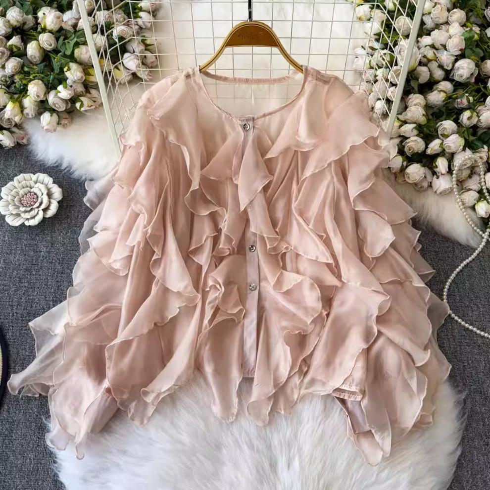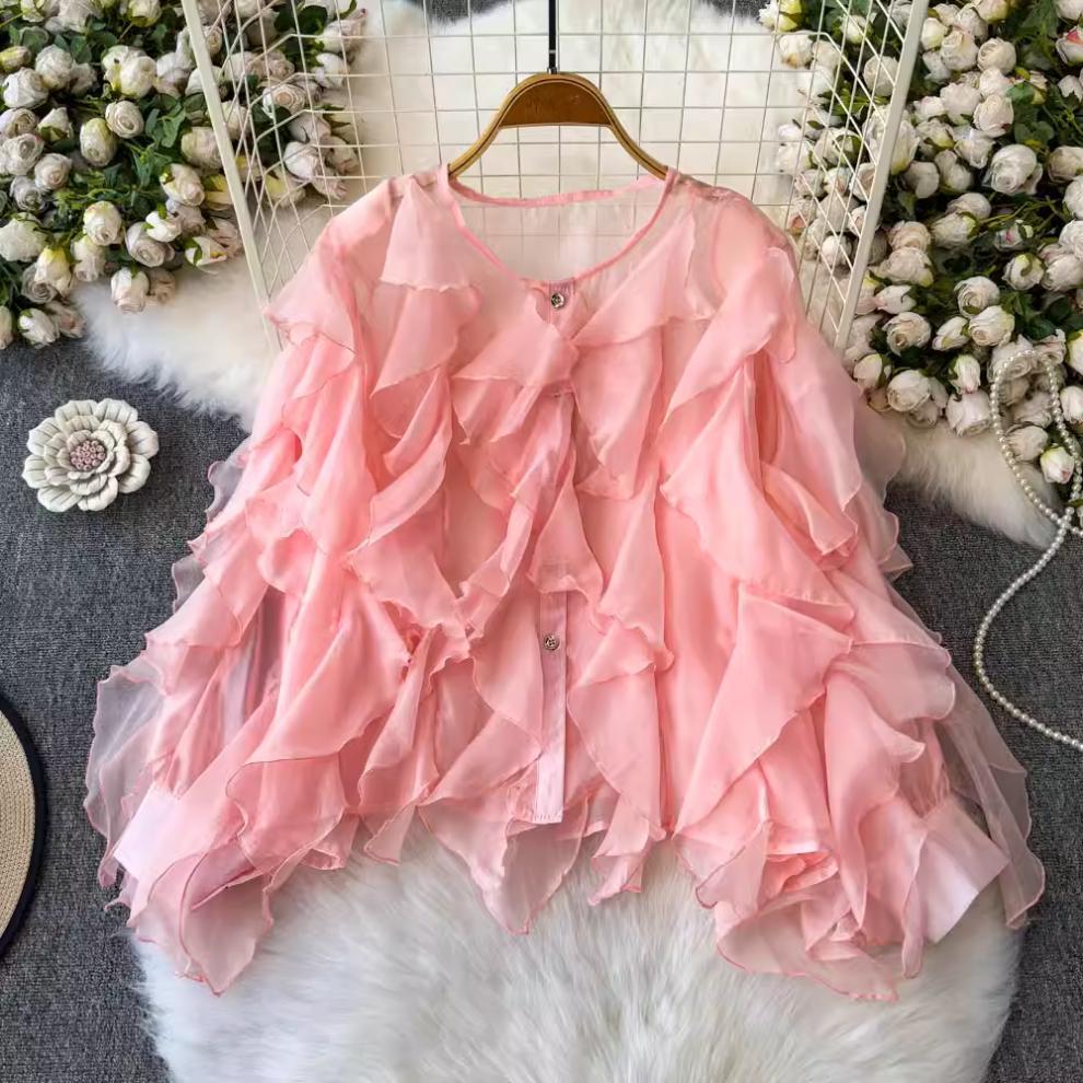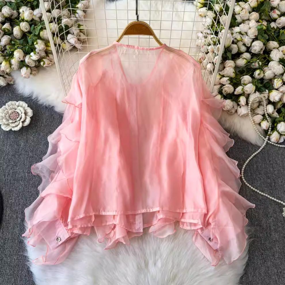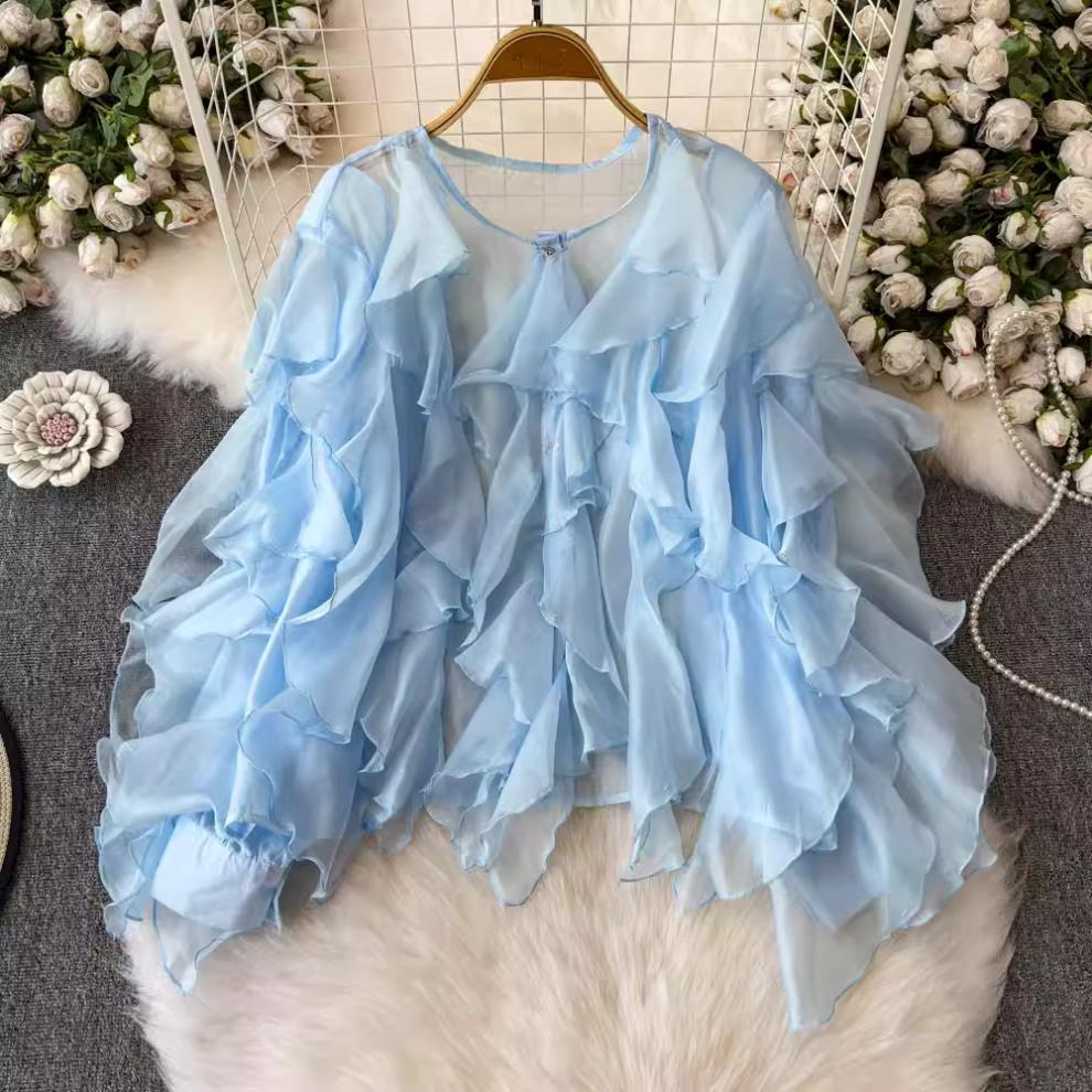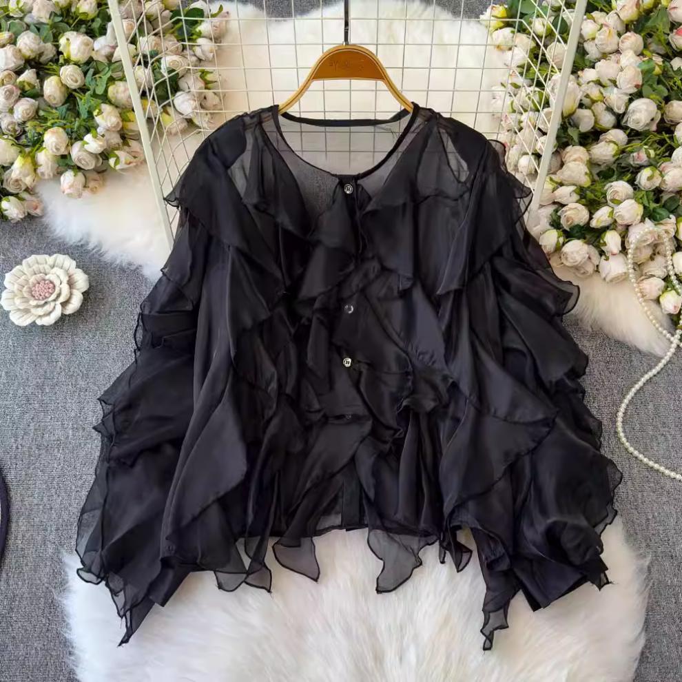 슈퍼 요정 경량 마이크로 투명 러플 디자인 센스 느슨한 슬리밍 분위기 센스 선 스크린 셔츠 여성용 한국식 쉬폰 셔츠