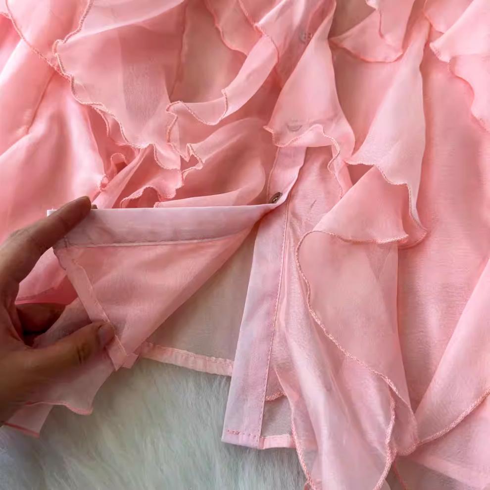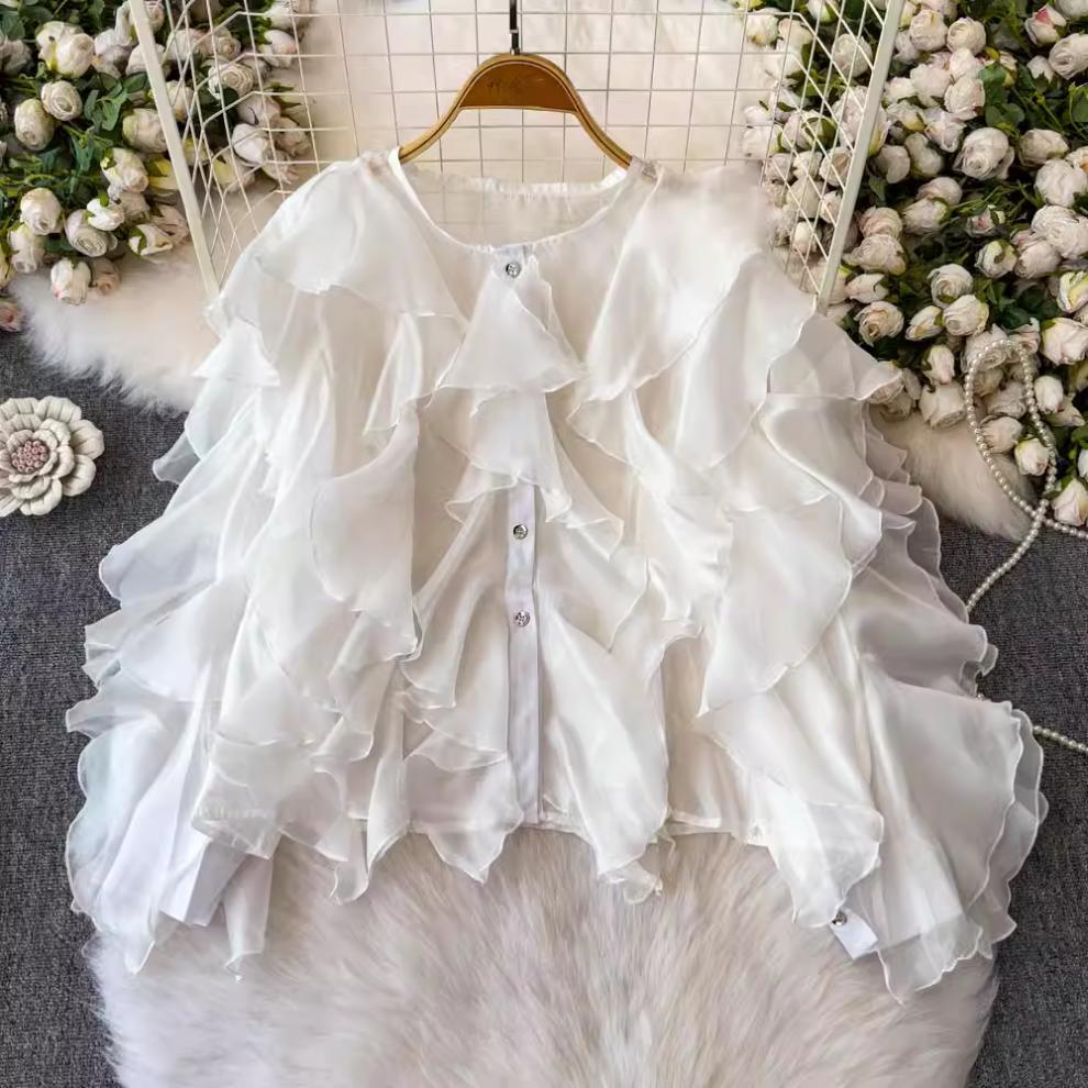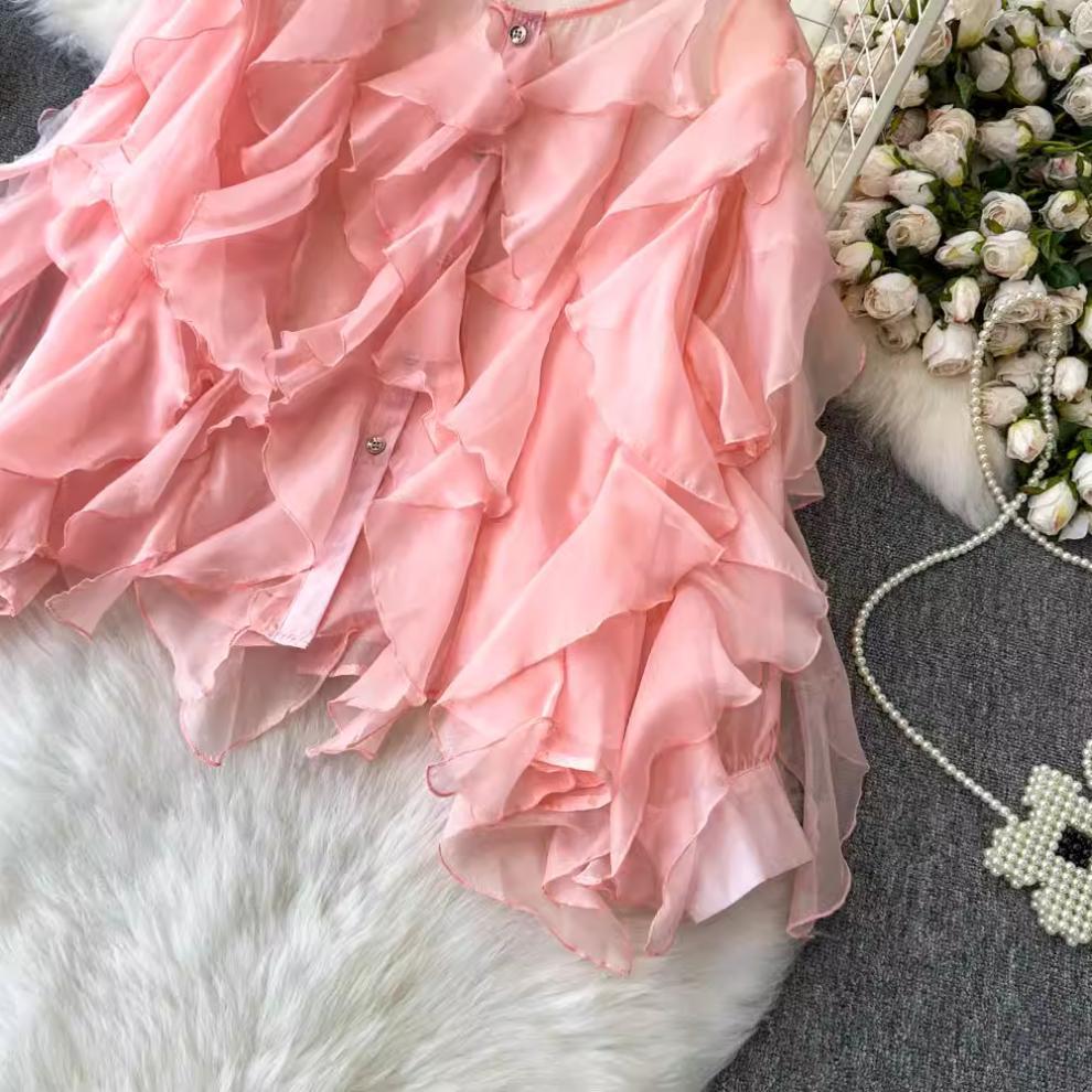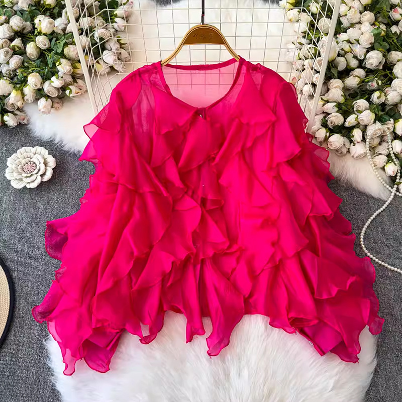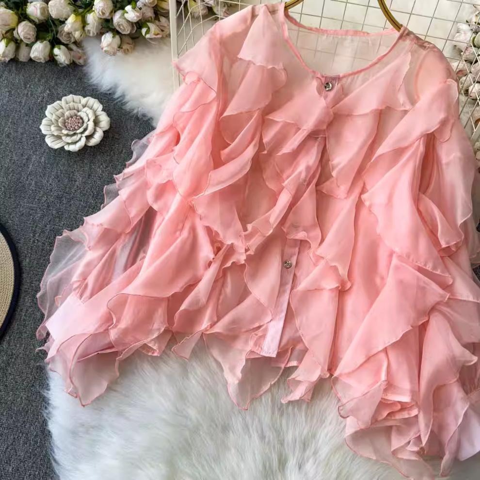 슈퍼 요정 경량 마이크로 투명 러플 디자인 센스 느슨한 슬리밍 분위기 센스 선 스크린 셔츠 여성용 한국식 쉬폰 셔츠