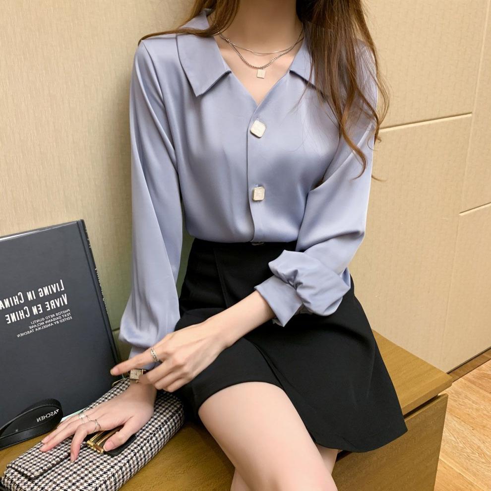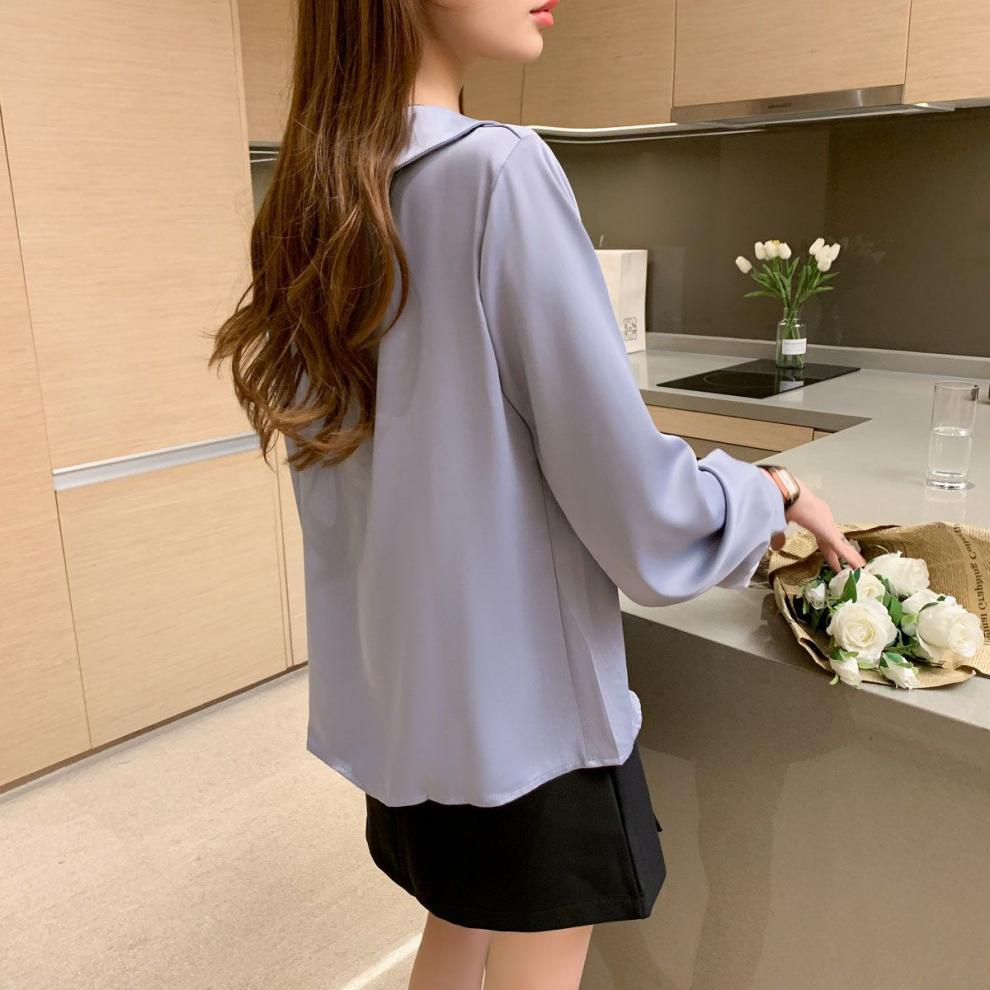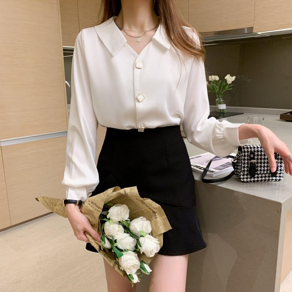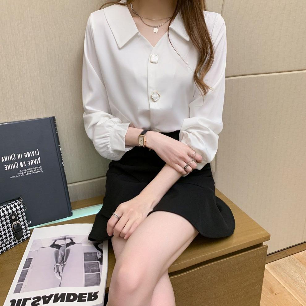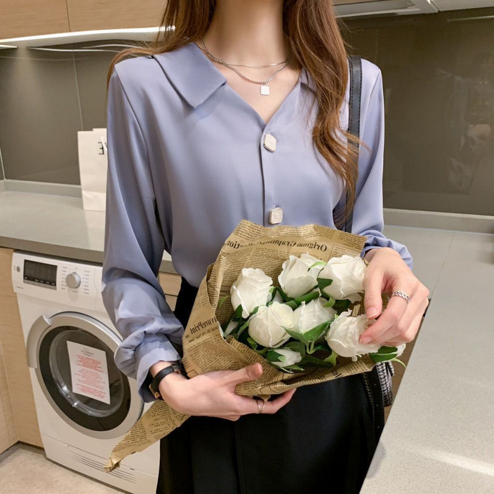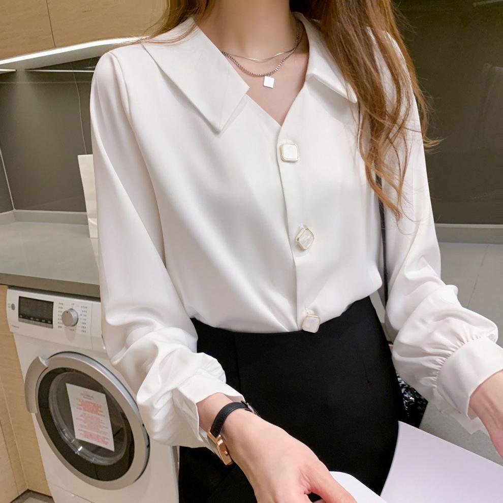 작은 2025 봄, 가을 얇은 셔츠 v 넥 쉬폰 화이트 셔츠 여성 긴팔 루즈 다용도 솔리드 컬러 탑스토어 가기