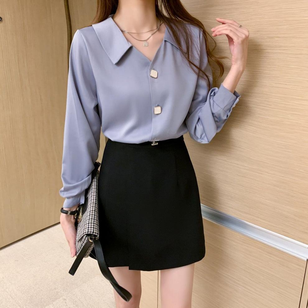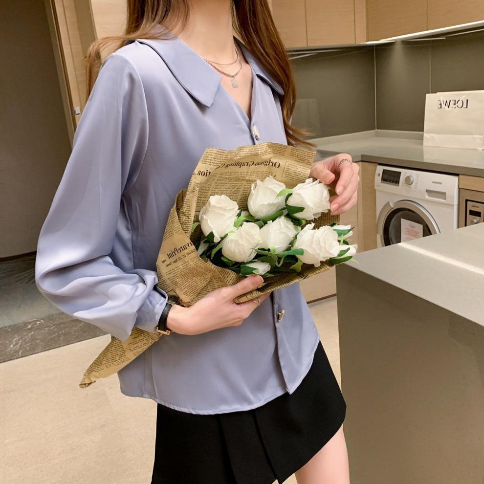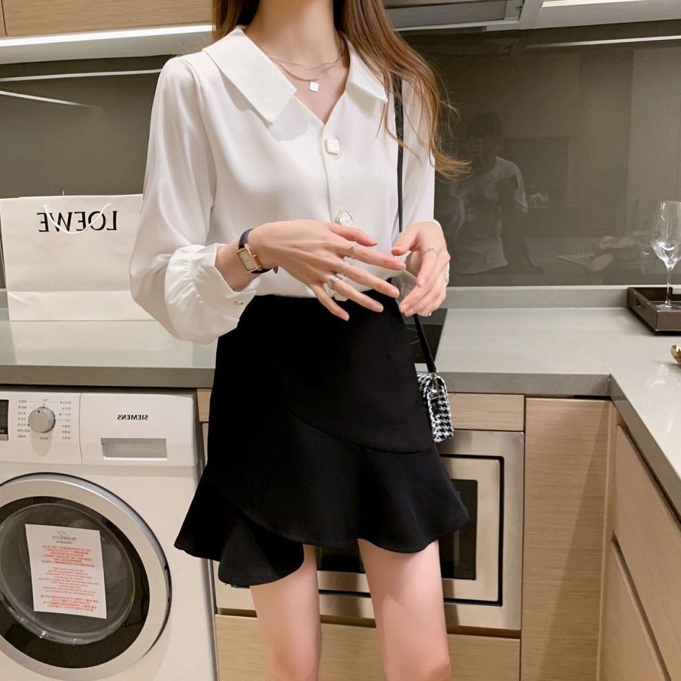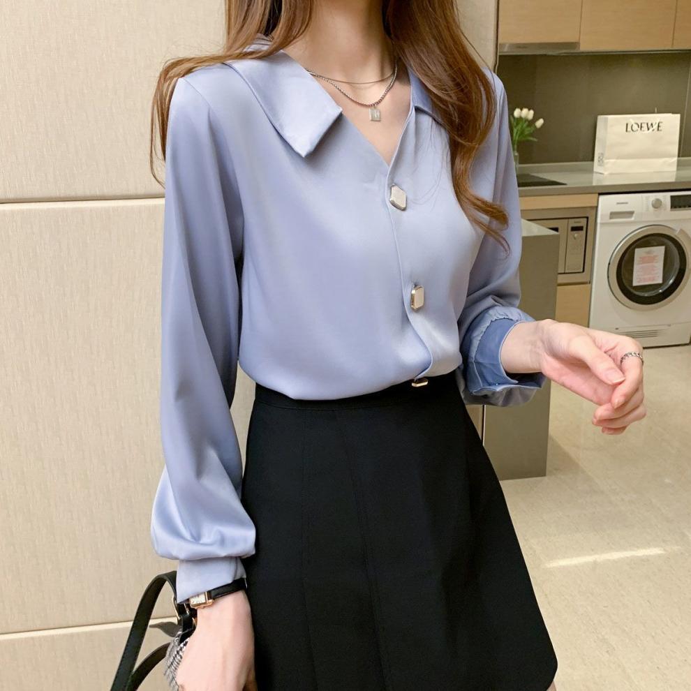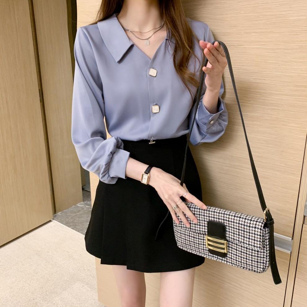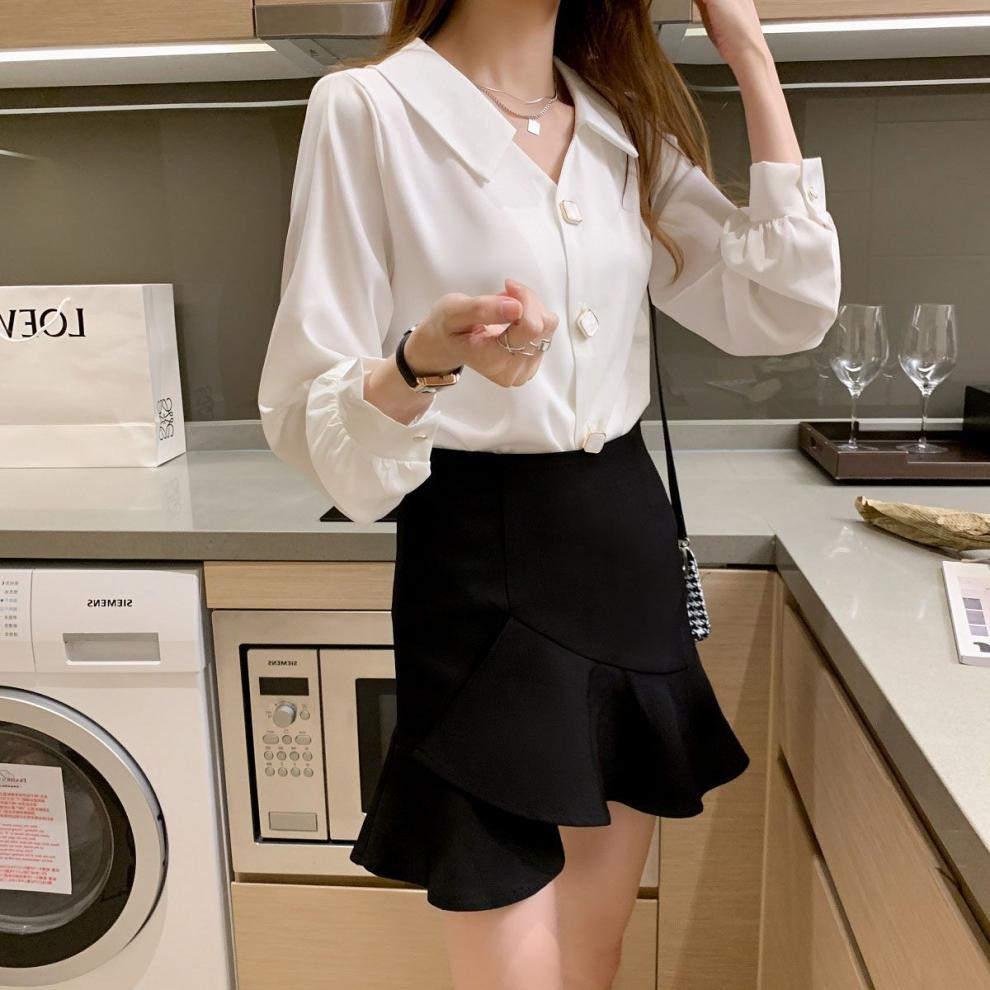 작은 2025 봄, 가을 얇은 셔츠 v 넥 쉬폰 화이트 셔츠 여성 긴팔 루즈 다용도 솔리드 컬러 탑스토어 가기