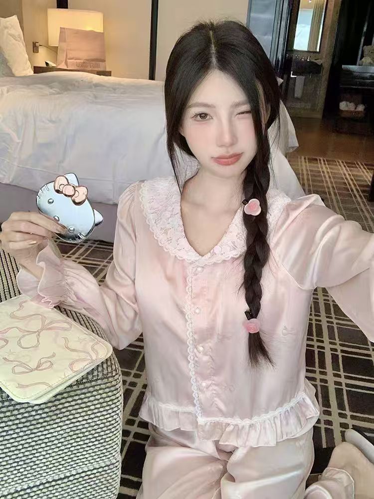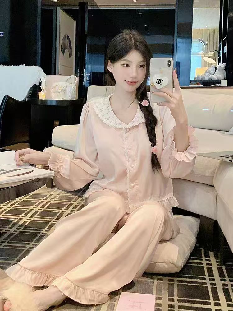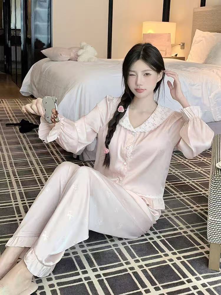 2025년 봄, 가을, 여름 여성을 위한 새로운 아이스 실크 긴팔 잠옷, 가슴 패드가 있어 섹시하고 달콤하며 집 밖에서 착용할 수 있는 가정복 세트